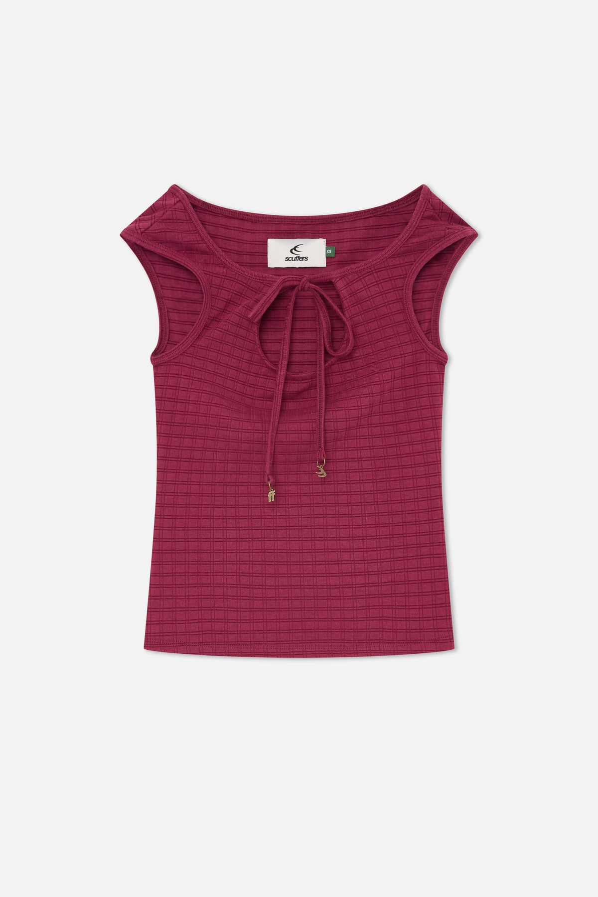 Burgundy Lace-Up Top in stretch cotton with a textured check pattern. Fitted silhouette with cap sleeves, wide neckline, and front keyhole detail with tie closure. Branded metal cord ends.