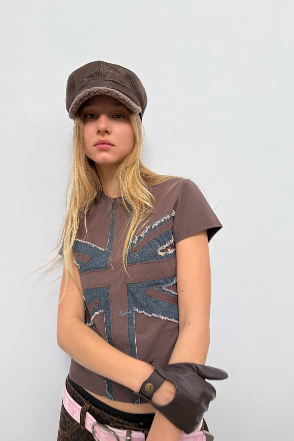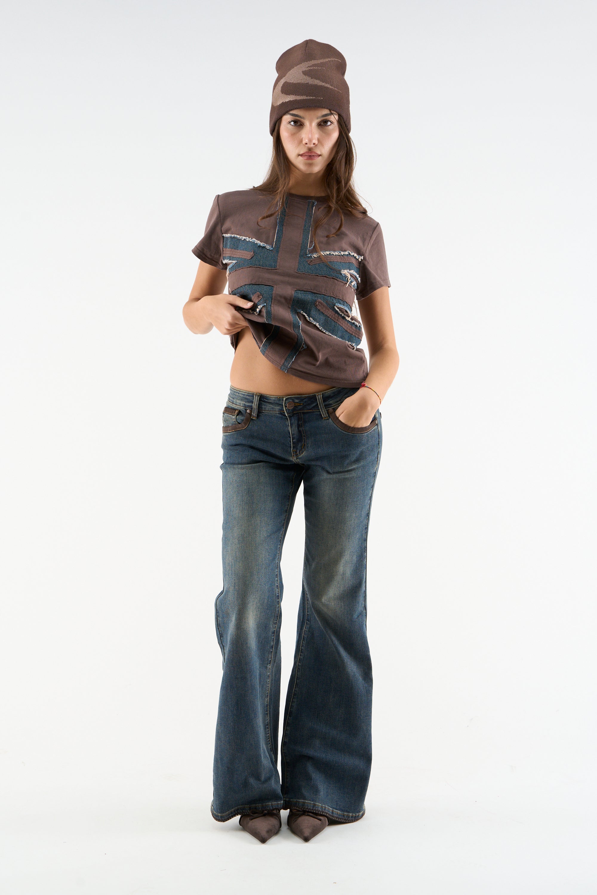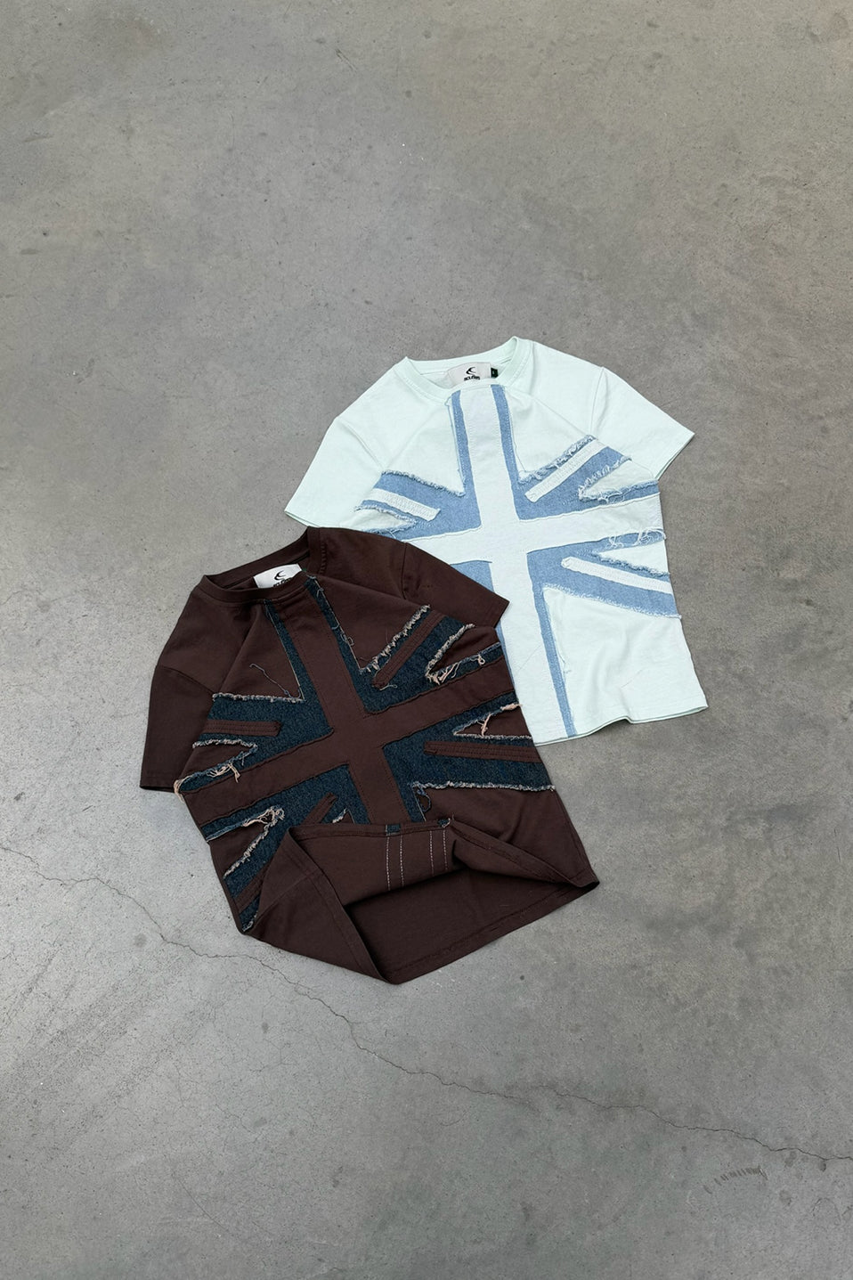 Brown Union Jack T-Shirt made from soft cotton jersey with a regular fit. Features a large raw-edge denim appliqué of the Union Jack flag across the front. Short sleeves, crew neckline, and small logo print at the upper back.