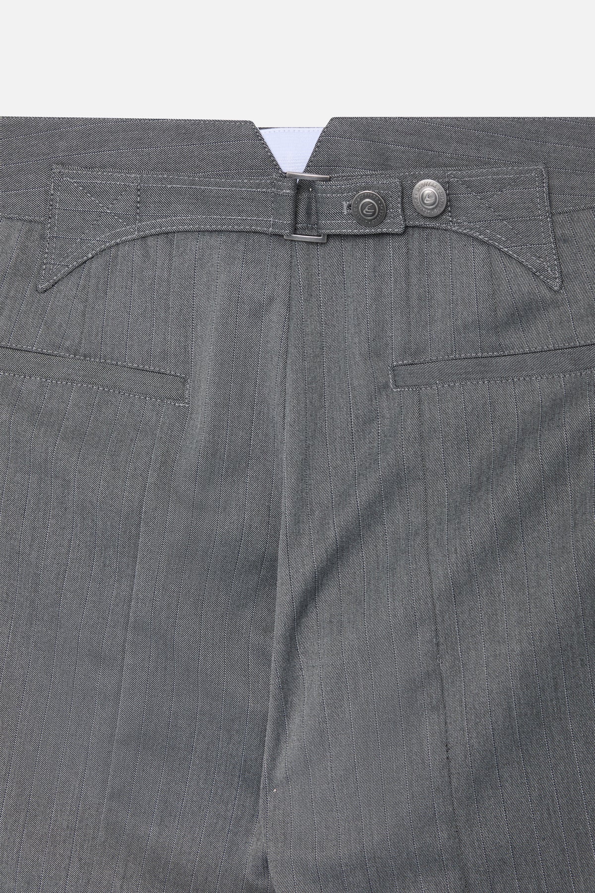 Grey Pinstripe Trousers with a straight-leg cut. Features tonal pinstripes, angled back yoke with double-button detail, and welt pockets. Belt loops, zip fly with concealed closure, and embroidered Scuffers logo at waistband.