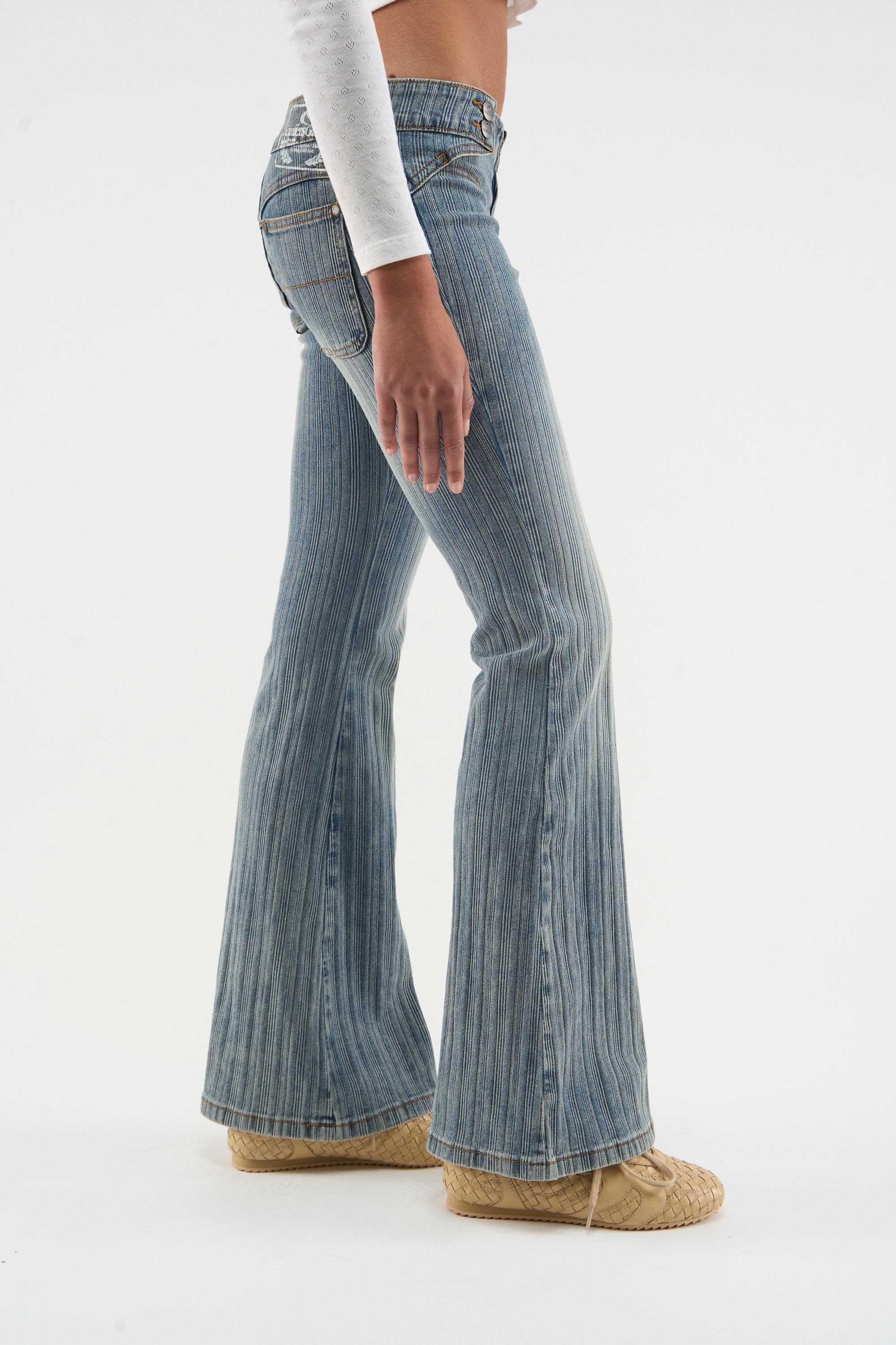 Light Blue Flared Jeans made from faded cotton denim with vertical stripe detailing. Features a low-rise fit with decorative button details at the waistband and a zipper fly. The legs flare out towards the hem, giving a retro, 70s-inspired silhouette. Classic 5-pocket styling with contrast orange stitching and silver-tone hardware. The back includes a white logo patch with a graphic print of "Scuffers Gallery" for subtle branding.