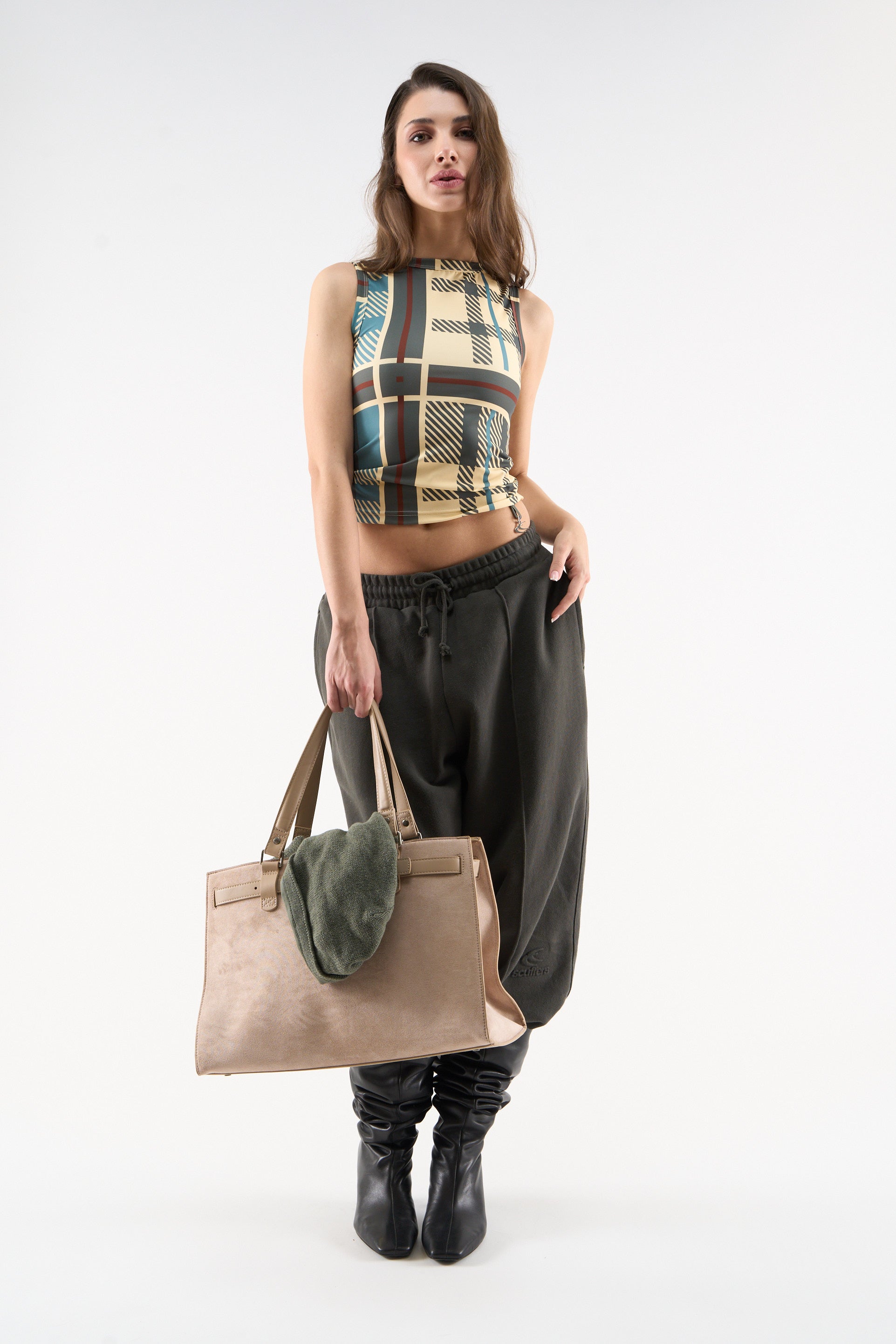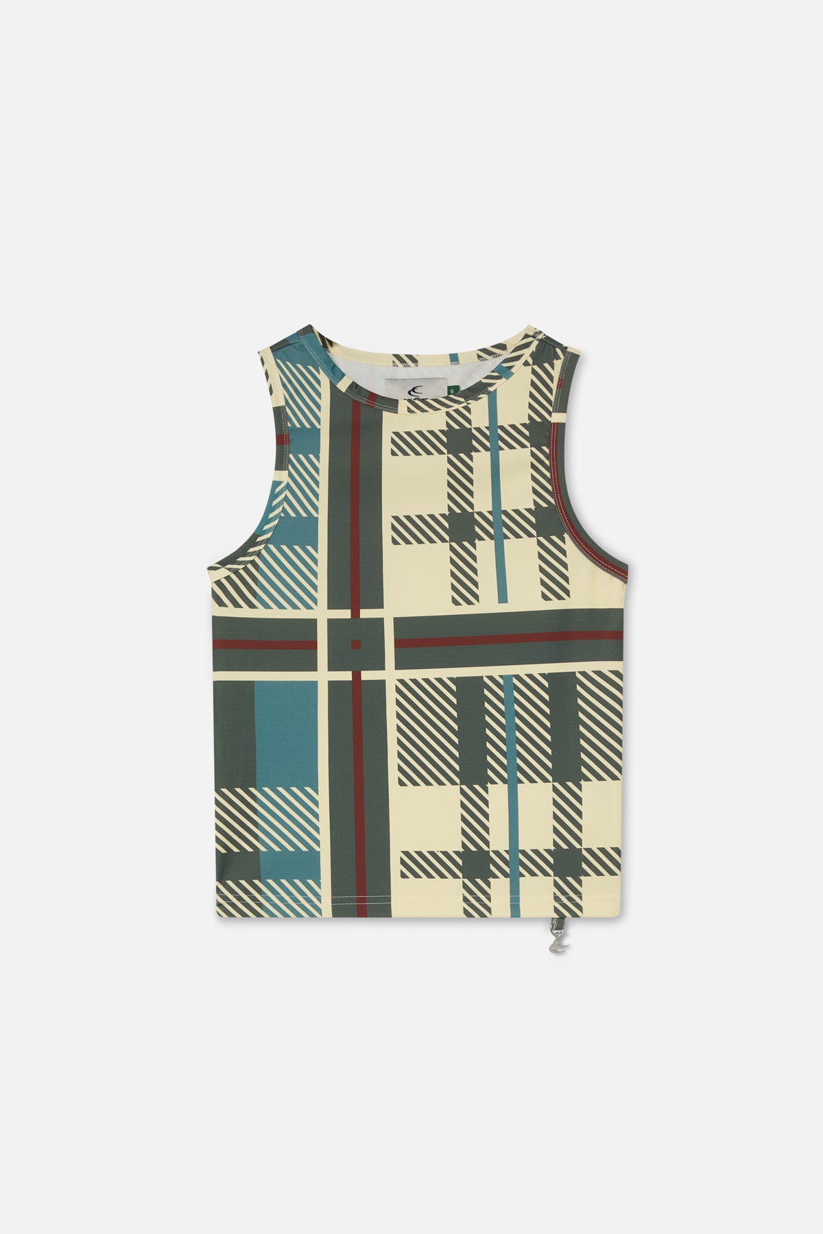 Sleeveless Top in stretch synthetic fabric with an all-over oversized houndstooth pattern. Features a slim fit, round neckline, and contrast side panels. Includes a side zip with metal puller shaped like the Scuffers® bird logo.