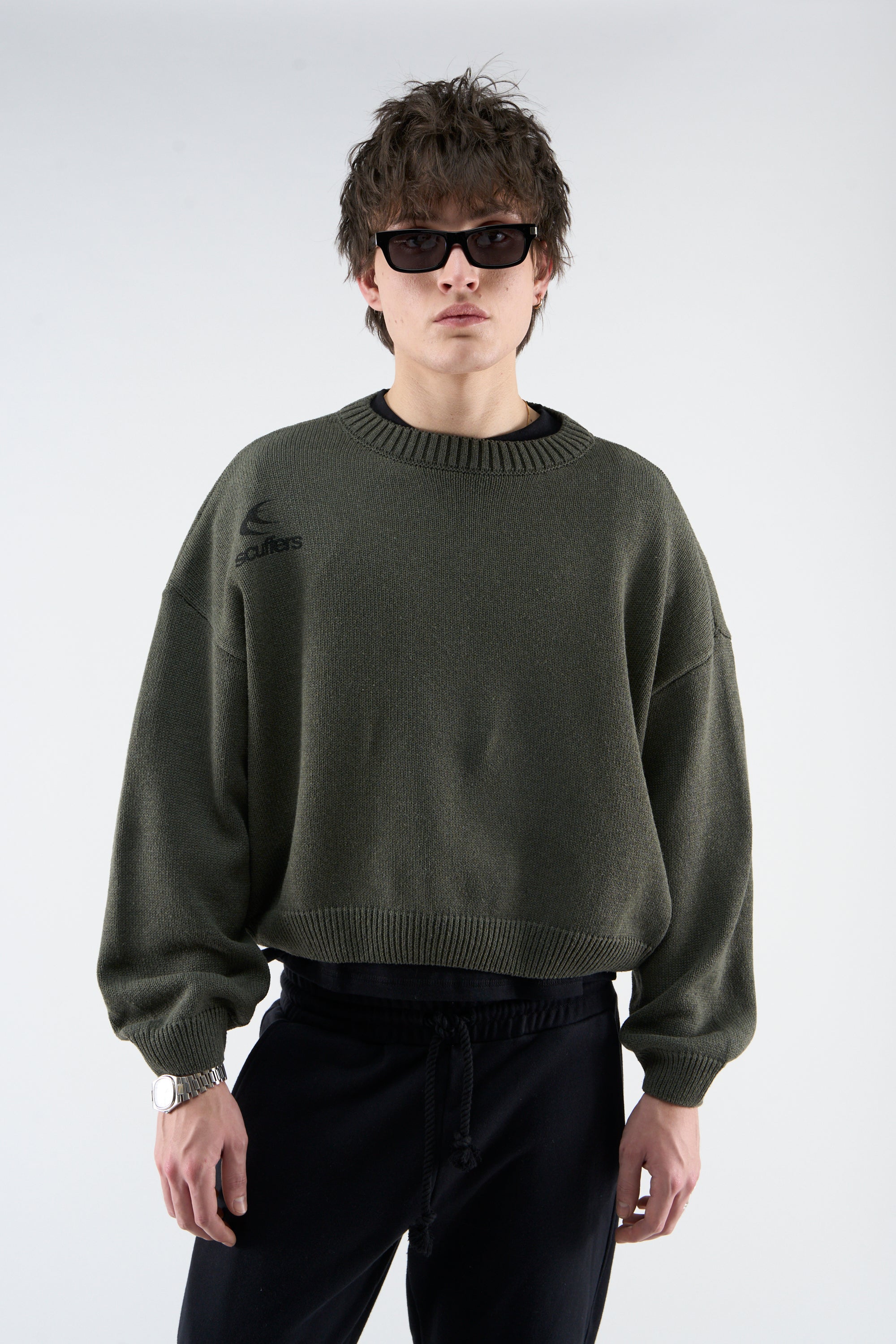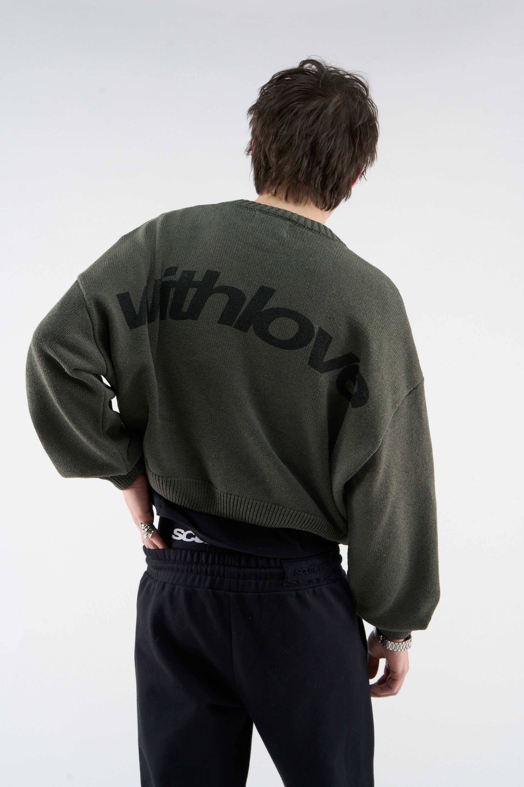 Olive Green Sweater – Soft knit fabric with a ribbed knit collar, cuffs, and hem. Features an embroidered logo at the chest and a "with love" design on the back. Relaxed fit with a cropped silhouette.