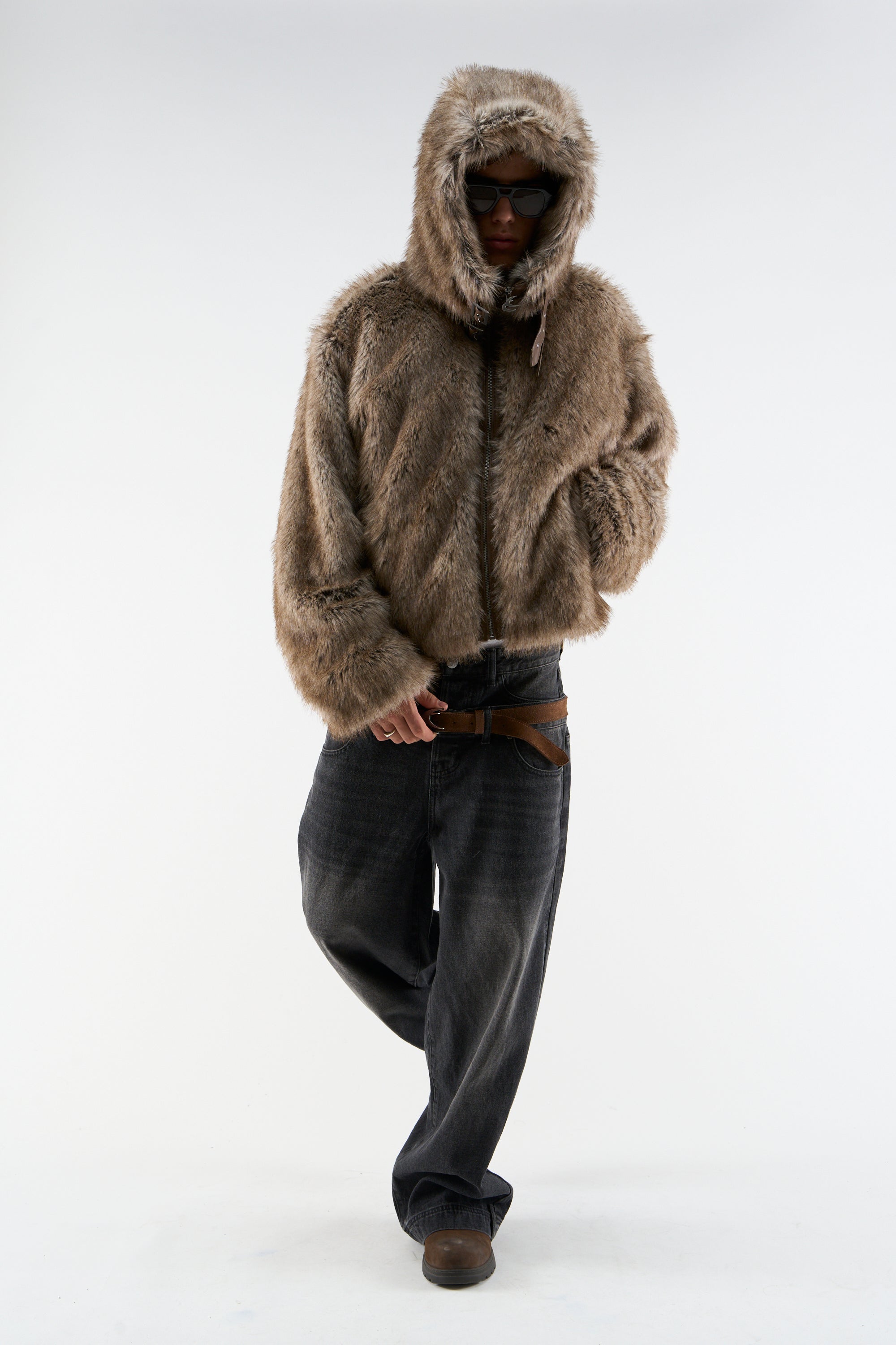 Faux Fur Jacket featuring a soft, fluffy texture in a warm brown tone. The jacket is designed with a zip-up front and two adjustable leather buckle straps at the collar for a secure fit. The back is adorned with a large Scuffers logo in dark brown faux fur for a stylish detail. The jacket has a cropped fit with a modern, relaxed look.