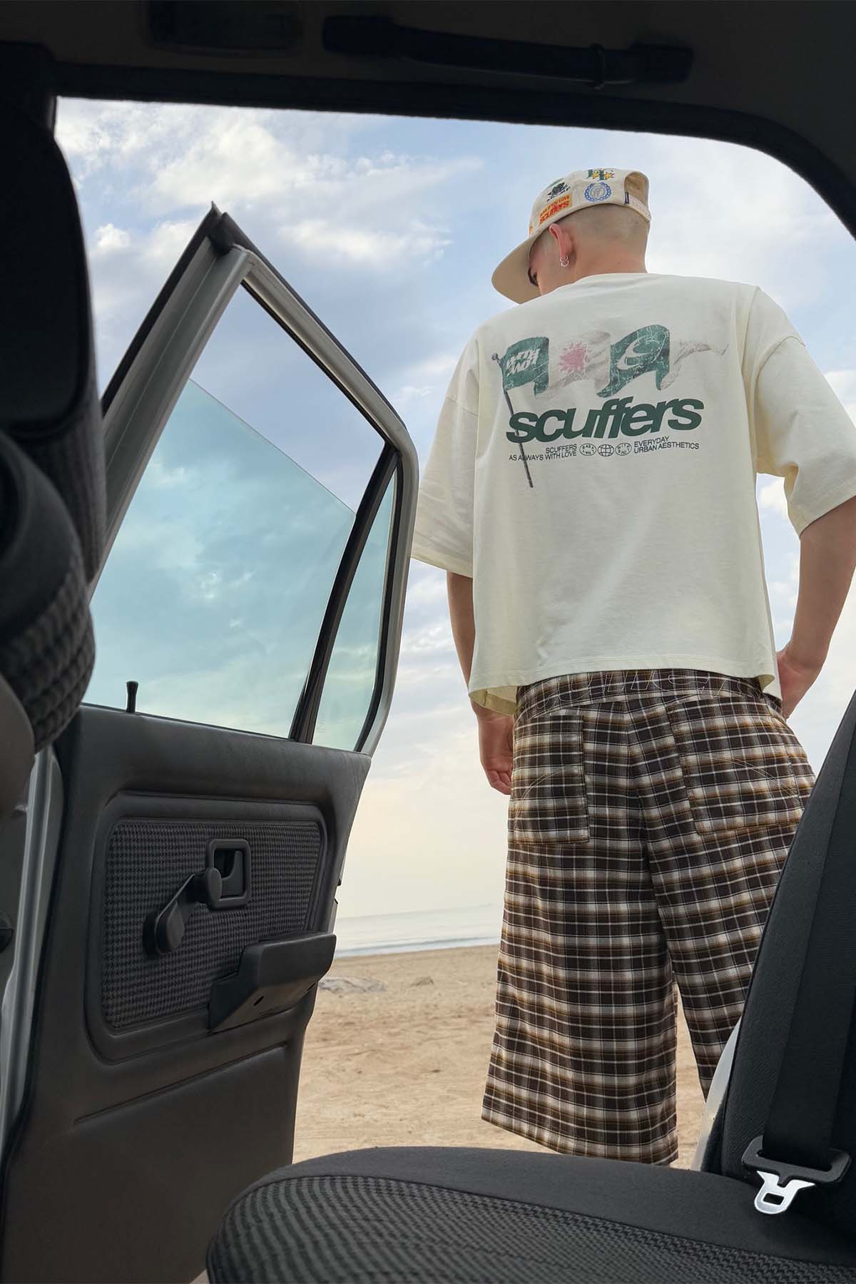 Cream T-Shirt in soft cotton jersey with a relaxed fit. Features small green "Scuffers" and emblem prints on the front chest. Back showcases a large multi-flag graphic with weathered effect and accompanying slogan text. Ribbed crew neckline.