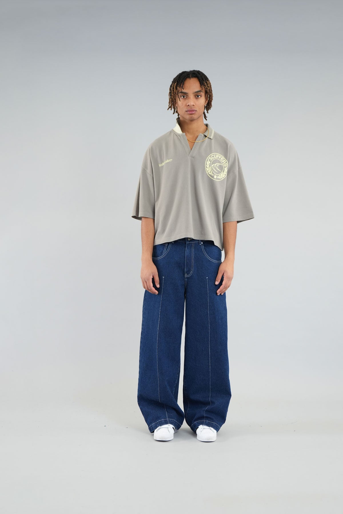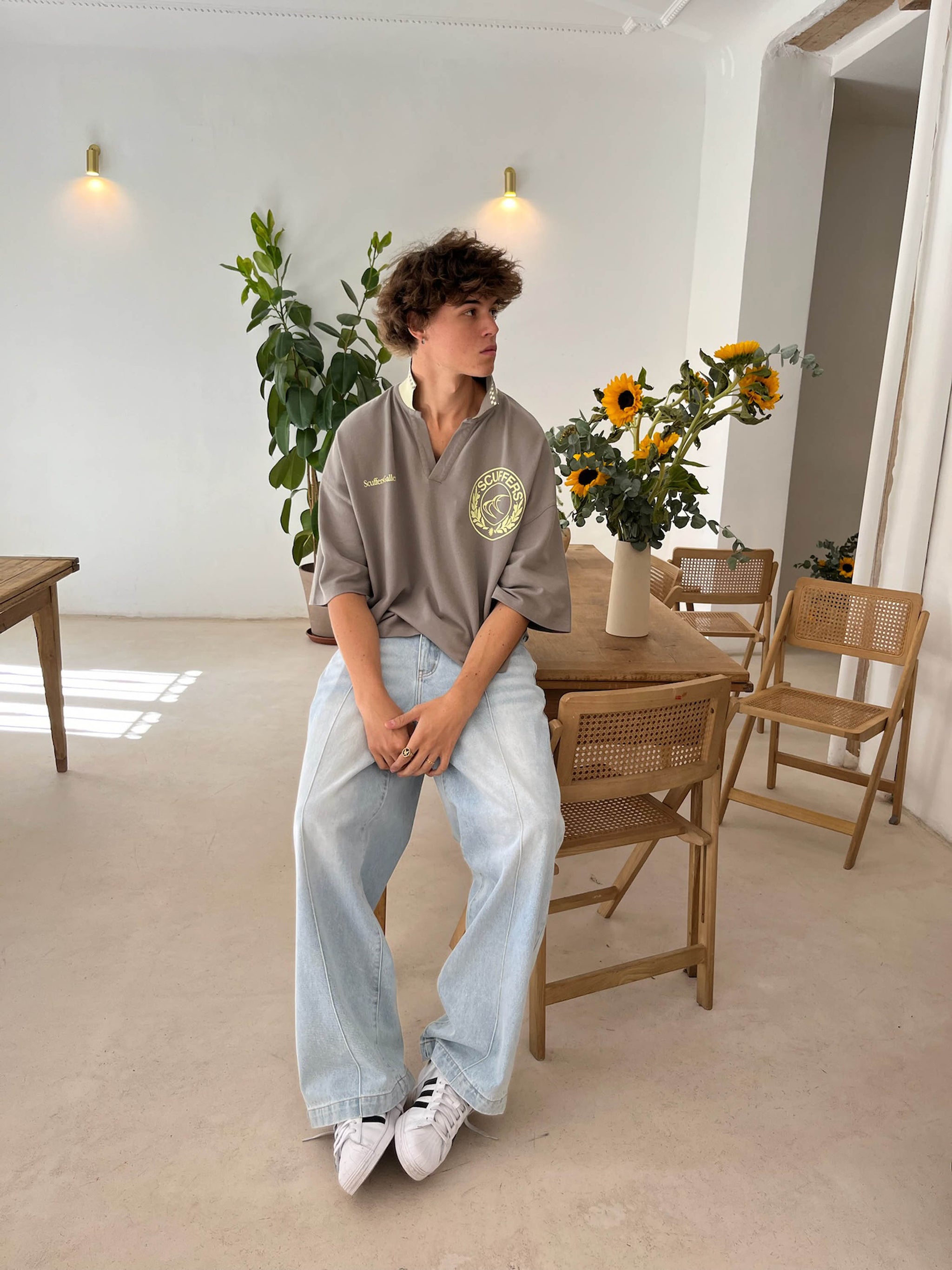 Polo verde con un ajuste suelto y un patrón a cuadros a lo largo del collar. El frente presenta un logotipo amarillo de "Scuffersgallery" en el cofre izquierdo y un gran emblema circular a la derecha, que incluye la palabra "Sfuffers" rodeada de hojas de laurel. La parte posterior es simple sin gráficos adicionales.