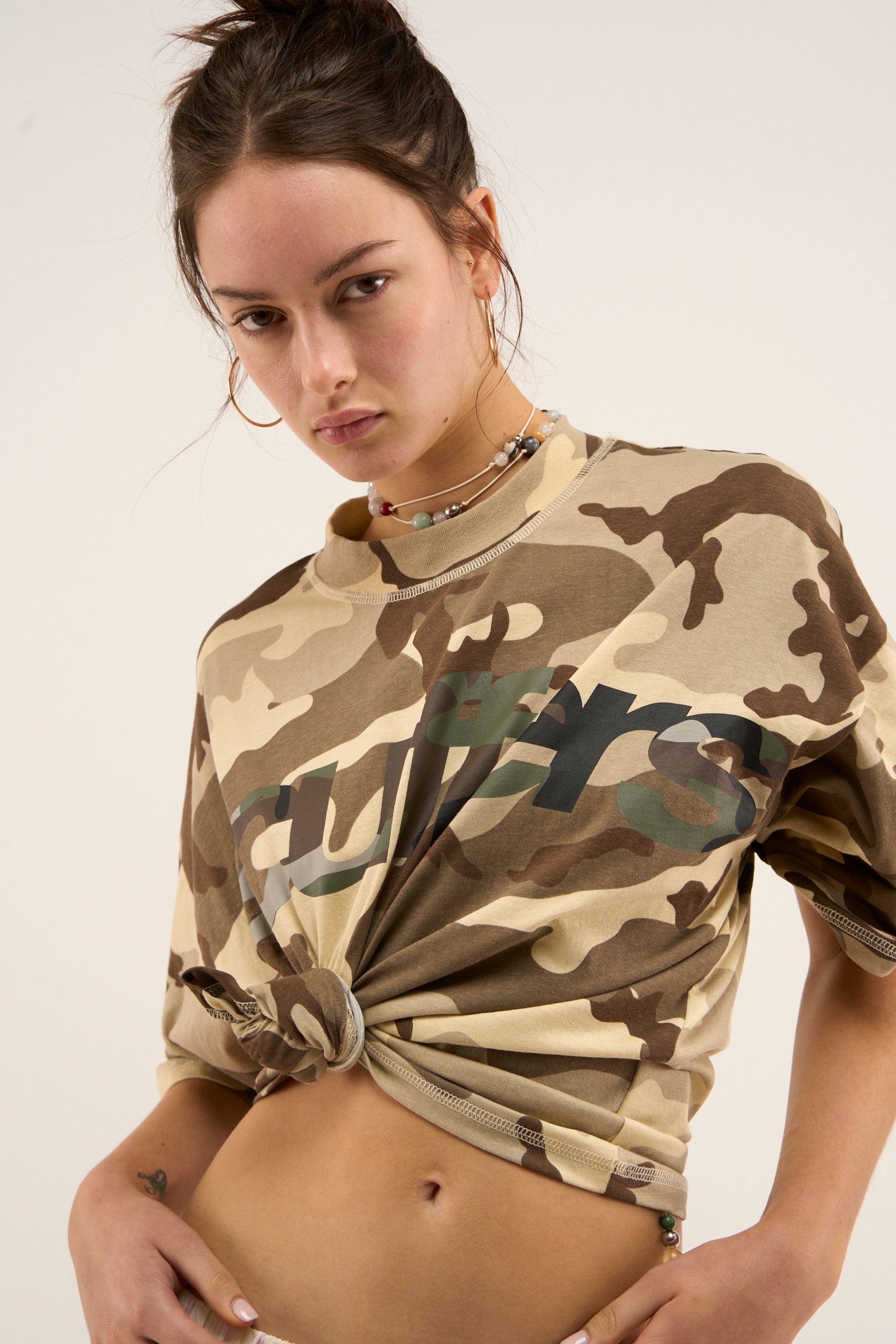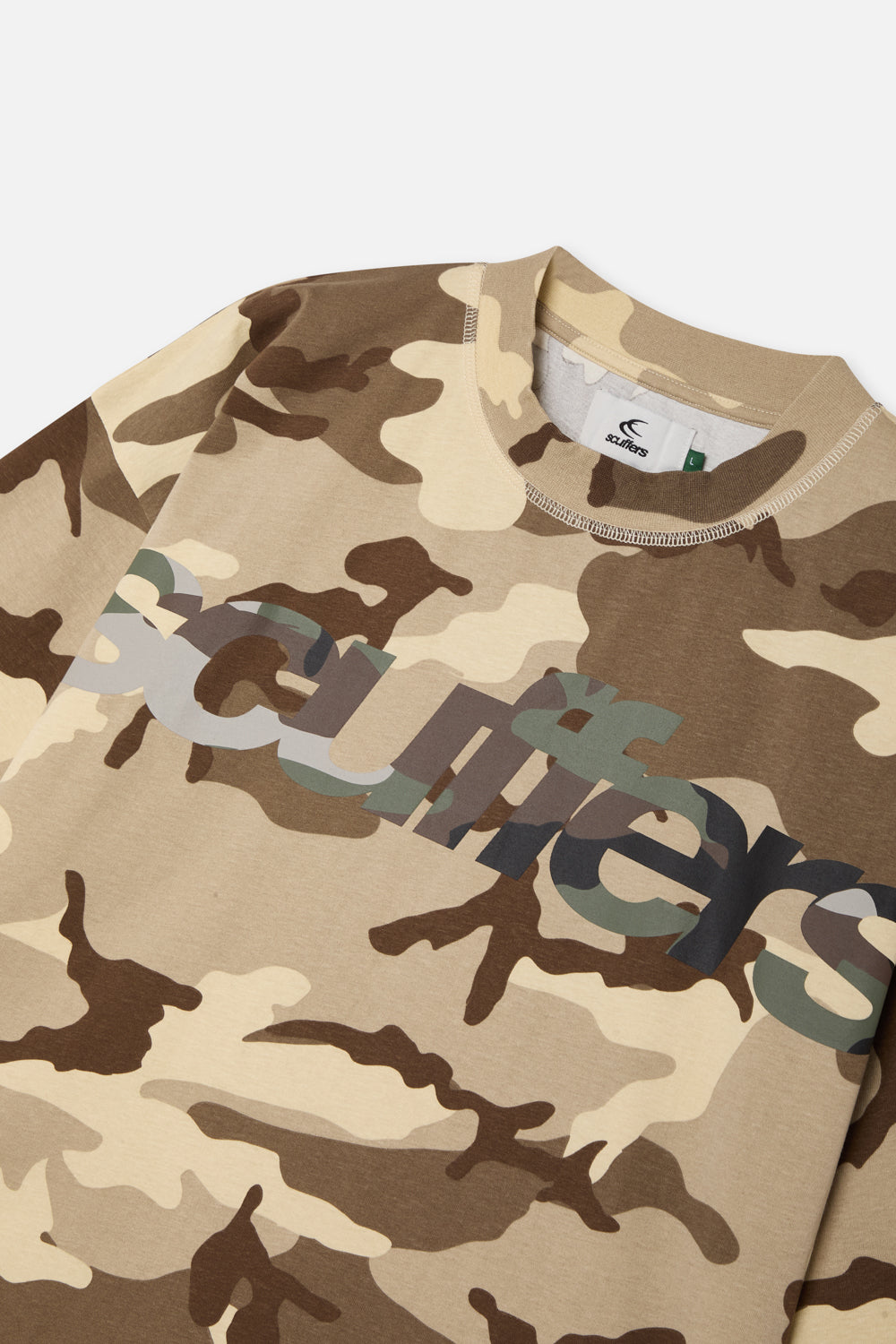 Camo Logo T-Shirt made from cotton jersey with a relaxed fit. Features an all-over desert camouflage print, ribbed crew neck, and layered-effect Scuffers logo printed across the chest in tonal shades.