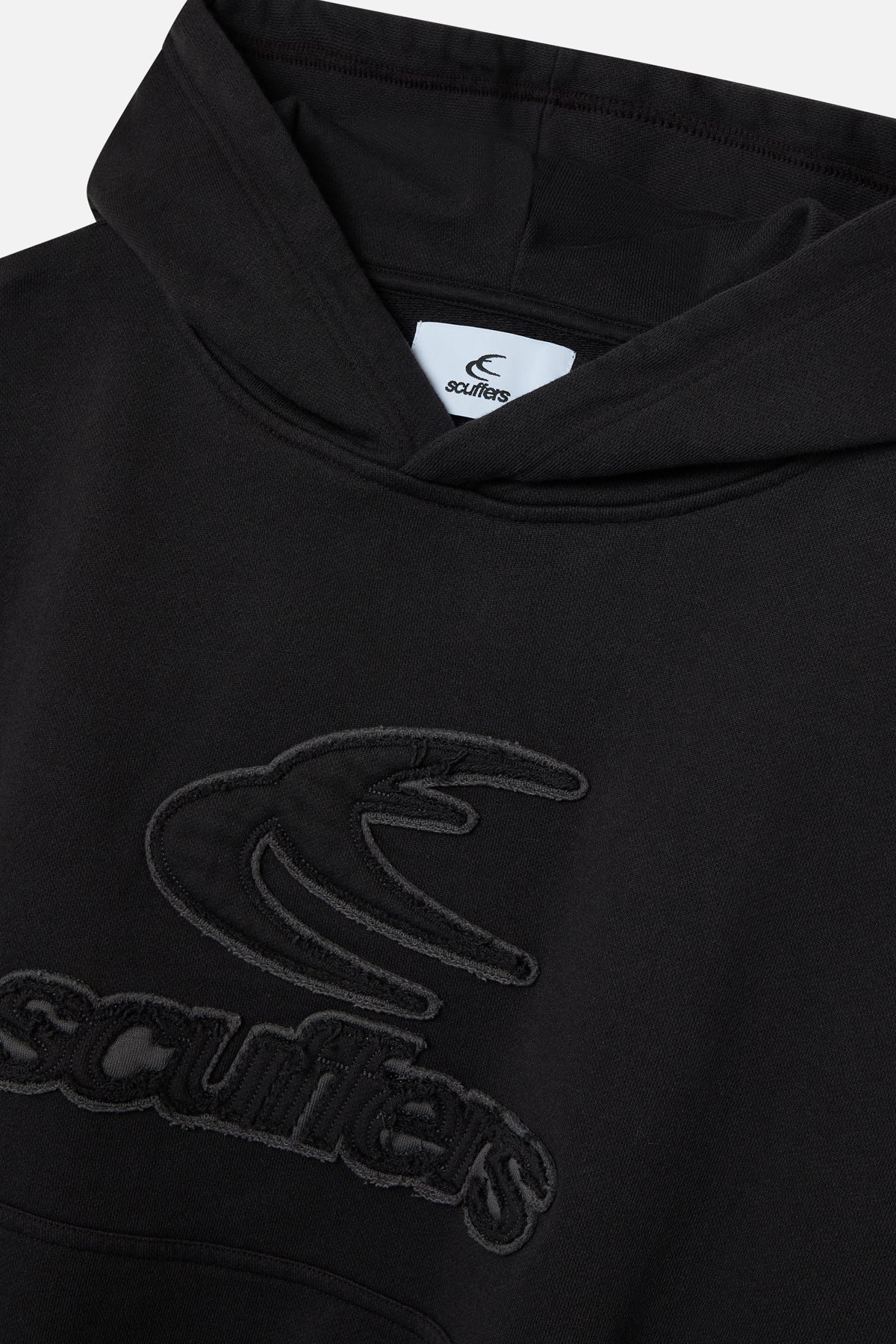 Dark Embossed Logo Hoodie made from soft, comfortable cotton fabric with a smooth finish. Features a relaxed fit, attached hood, and ribbed cuffs and hem. Subtle tonal Scuffers logo embossed on the chest. Finished with a front kangaroo pocket.