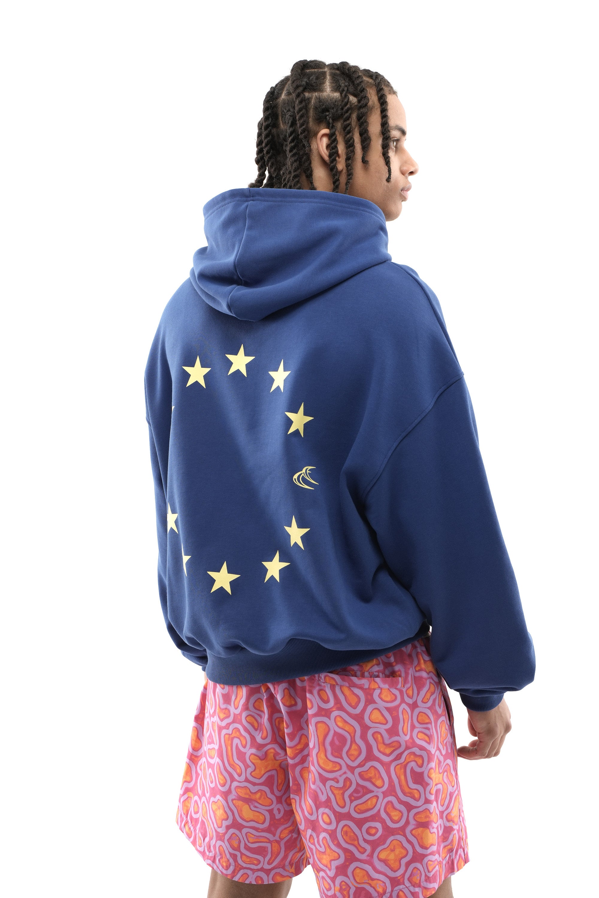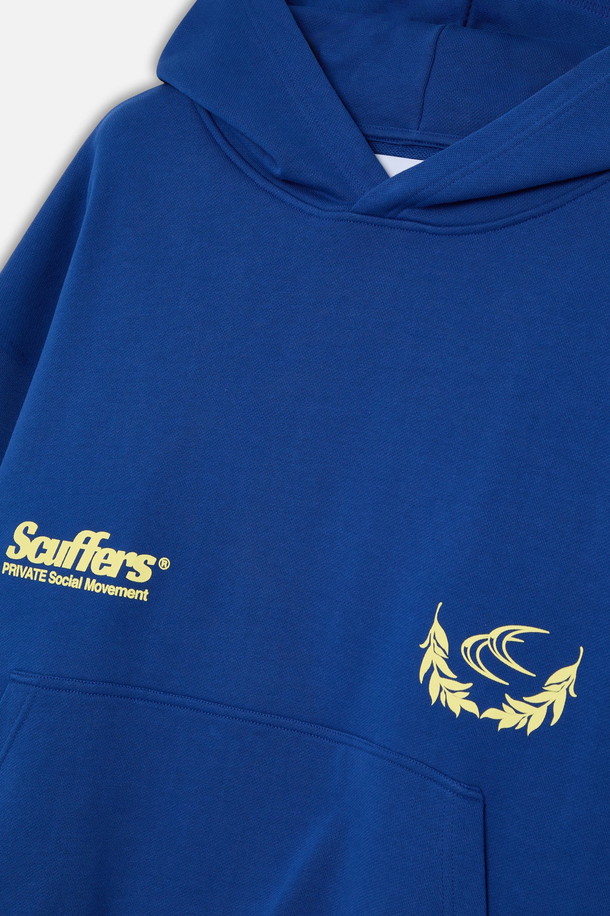 Blue Graphic Hoodie made from heavyweight cotton fleece with a brushed interior. Relaxed fit with ribbed cuffs and hem, kangaroo pocket, and drawstring hood. Printed logos at chest and back, featuring Scuffers branding, laurel motif, and circular star graphic.