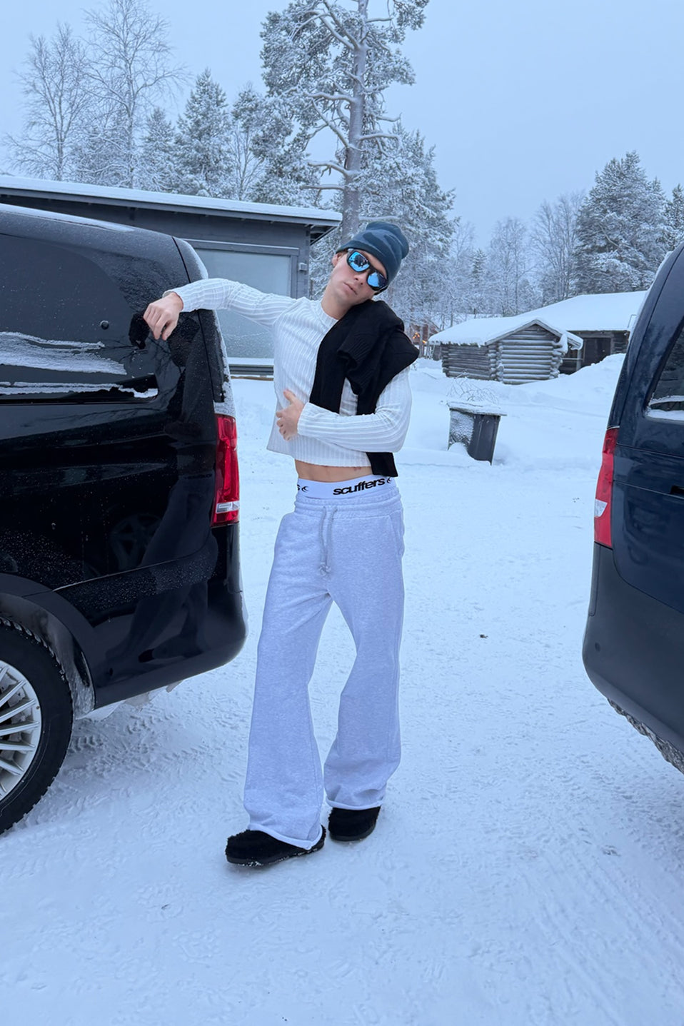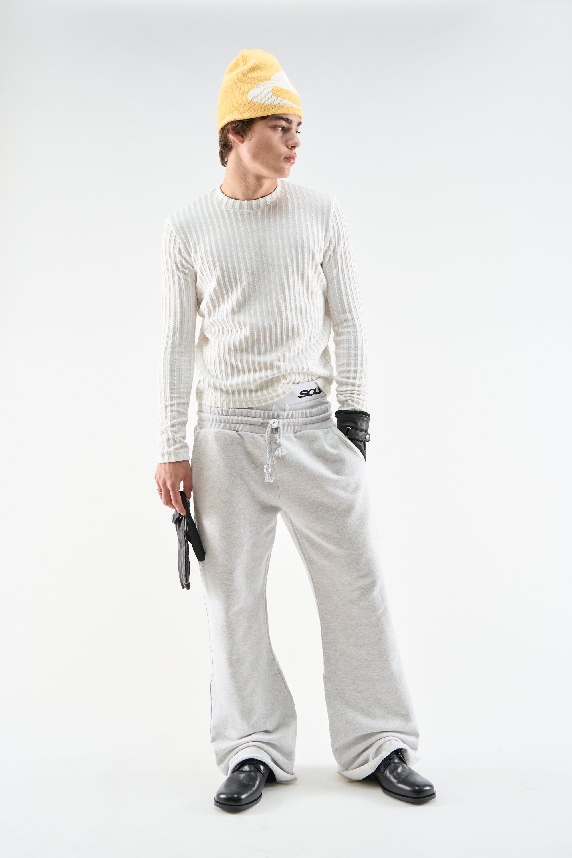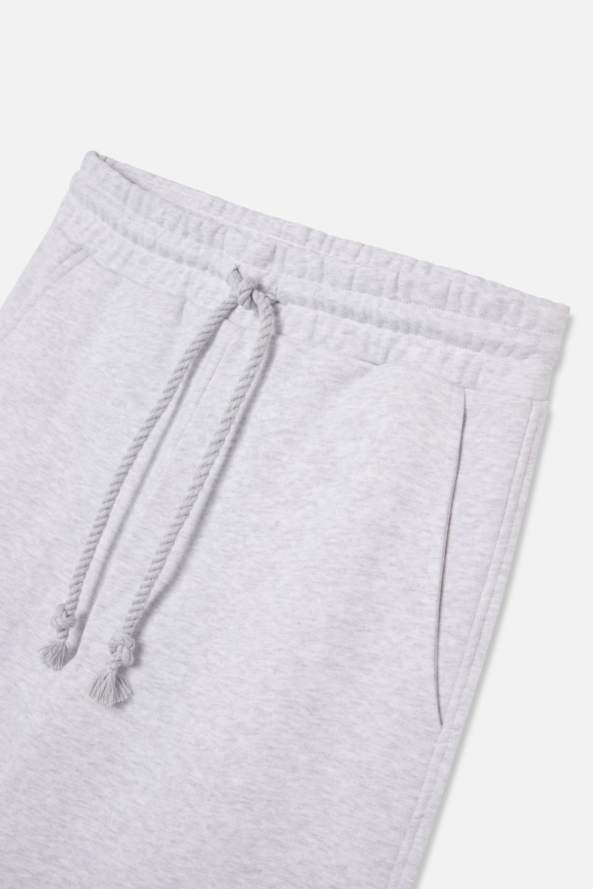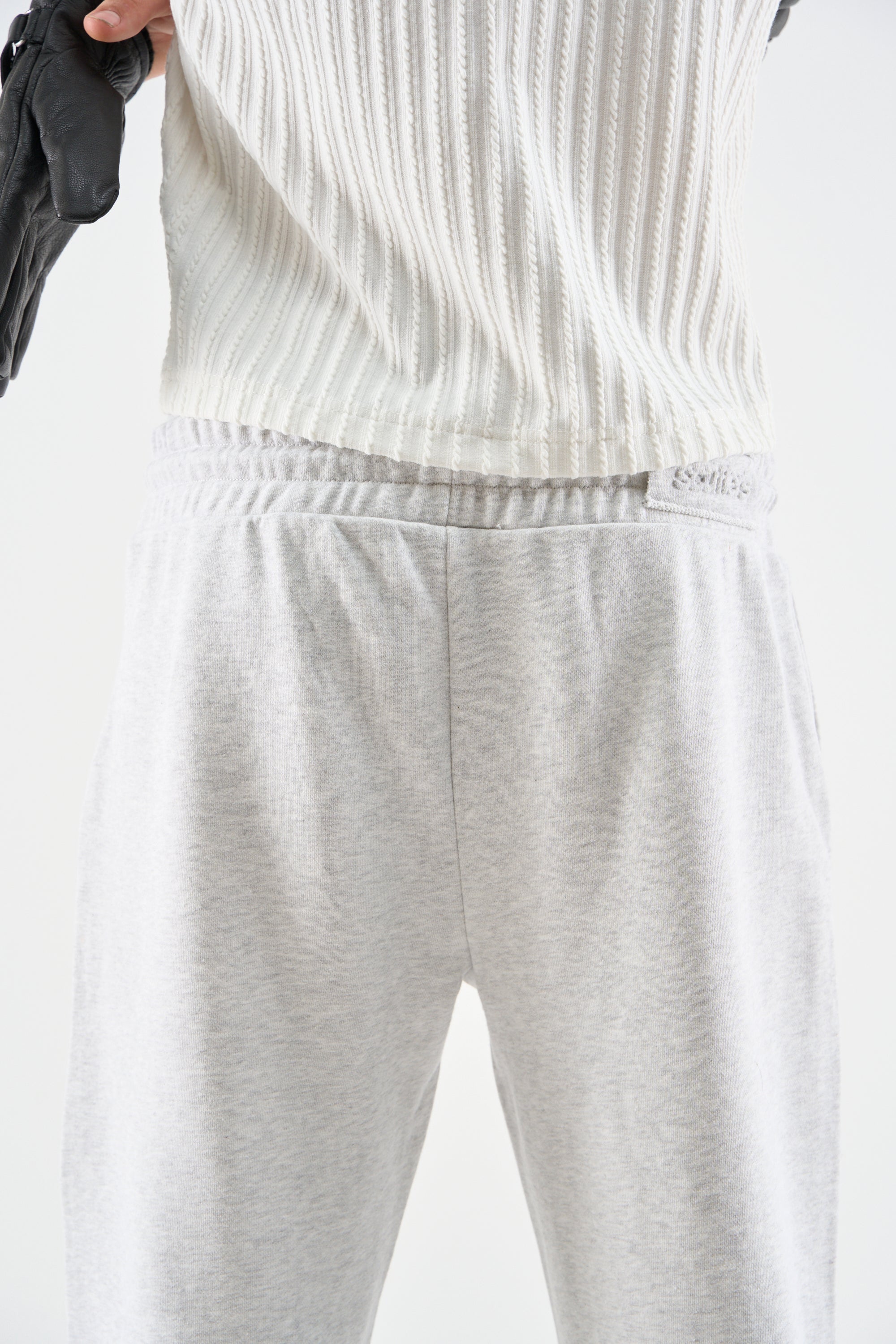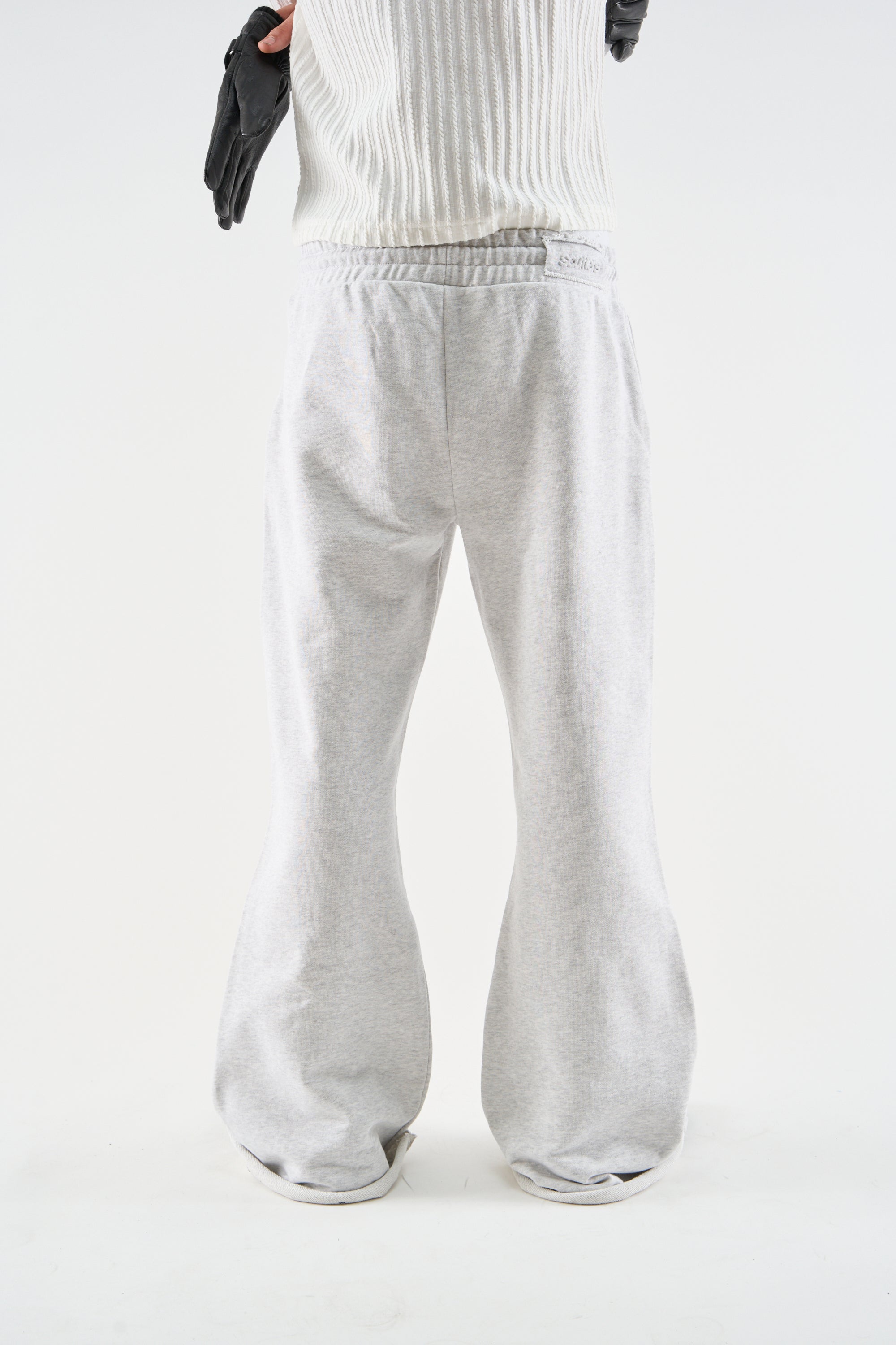 Grey Flared Sweatpants made from a soft cotton blend with a smooth finish. Features a flared leg cut, elasticated waistband with an adjustable drawstring and metal tips. Includes side pockets for added practicality. The pants offer a relaxed fit with a flattering flared silhouette.