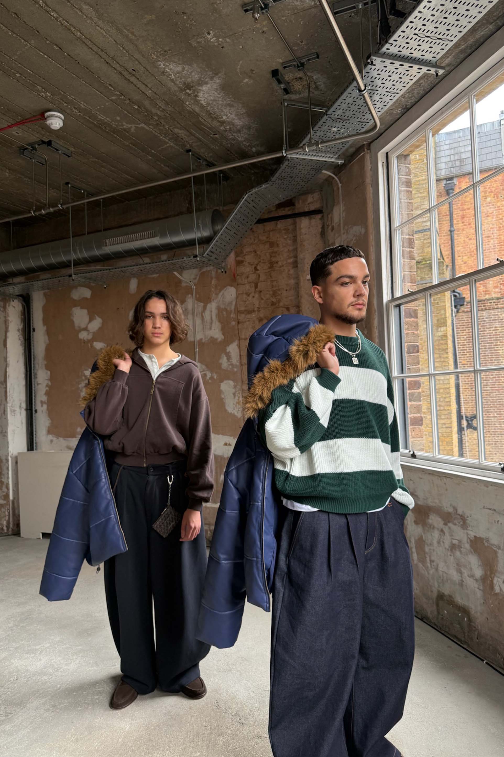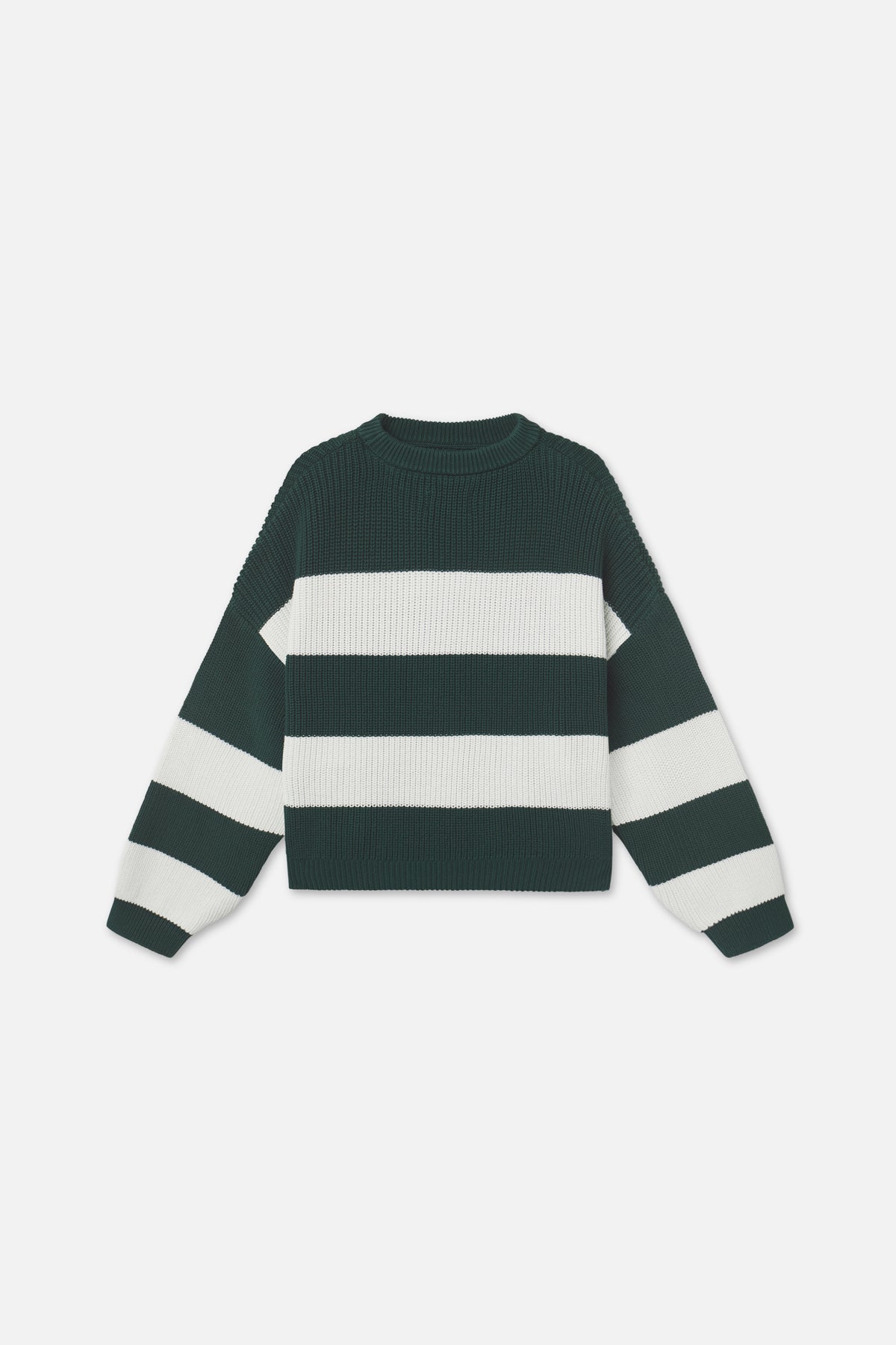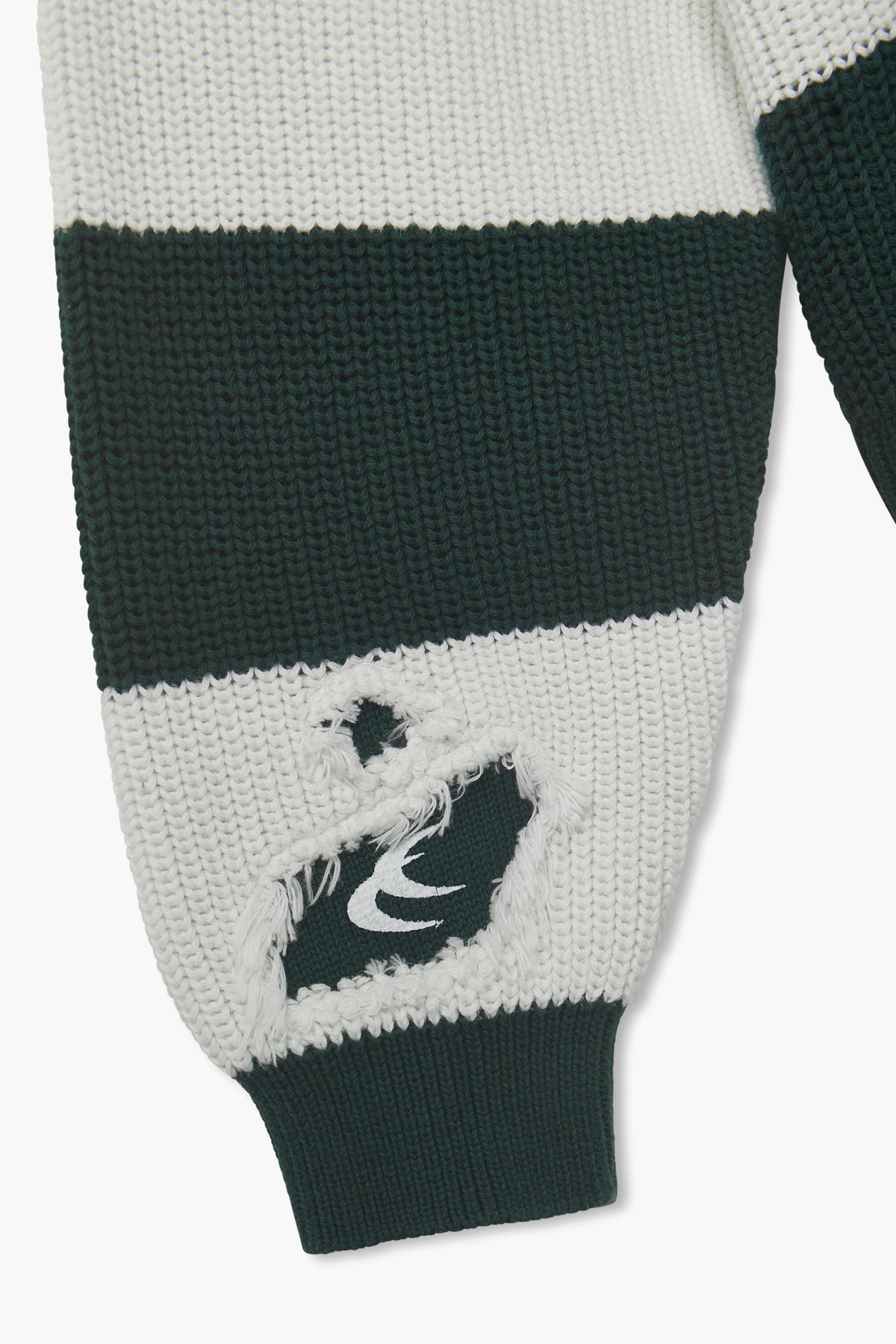 Green and White Striped Knit Sweater made from cotton with a ribbed crew neckline, cuffs, and hem. Features wide horizontal stripes and a distressed patch on the left sleeve revealing a printed Scuffers logo underneath. Relaxed fit.