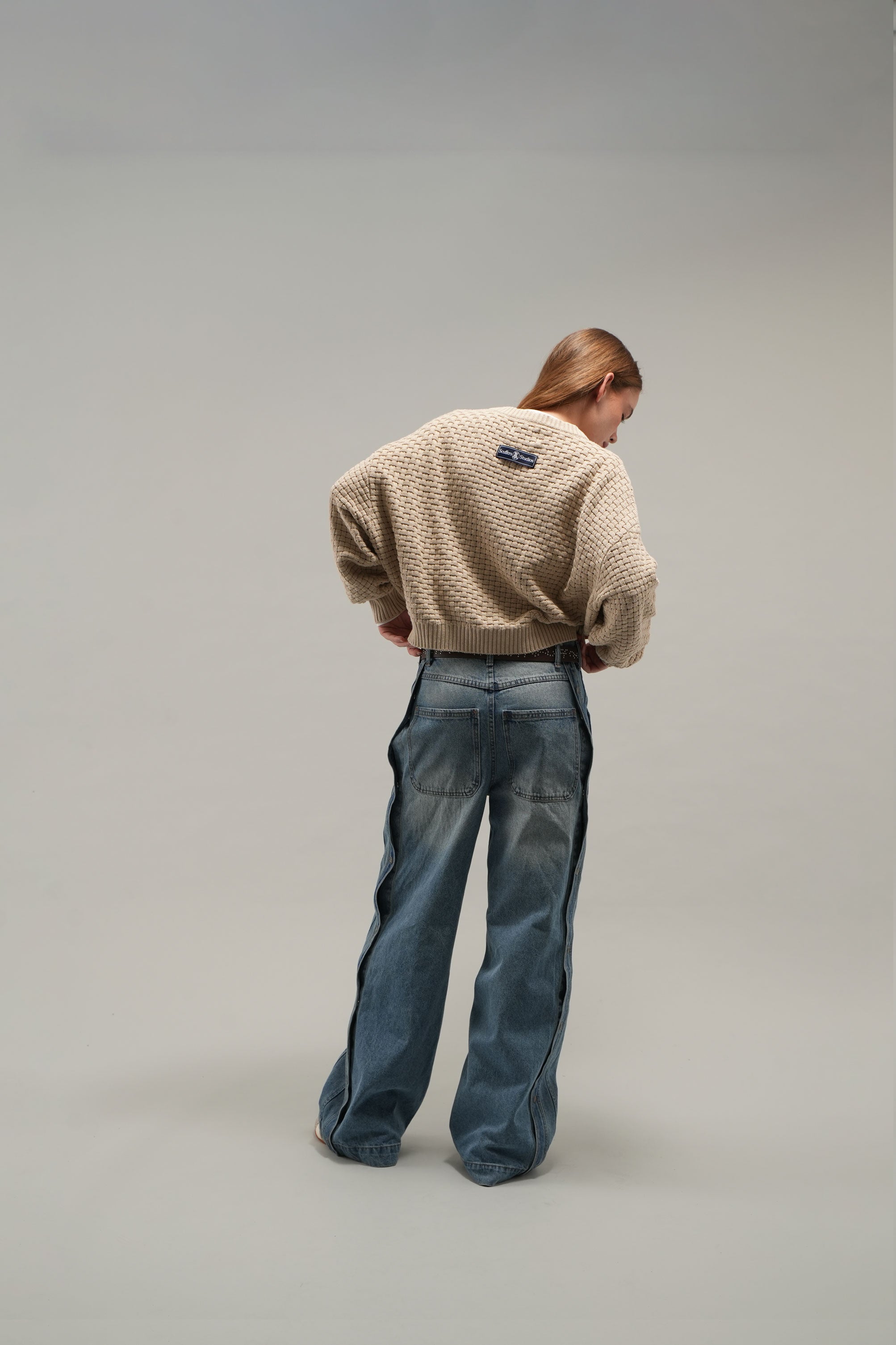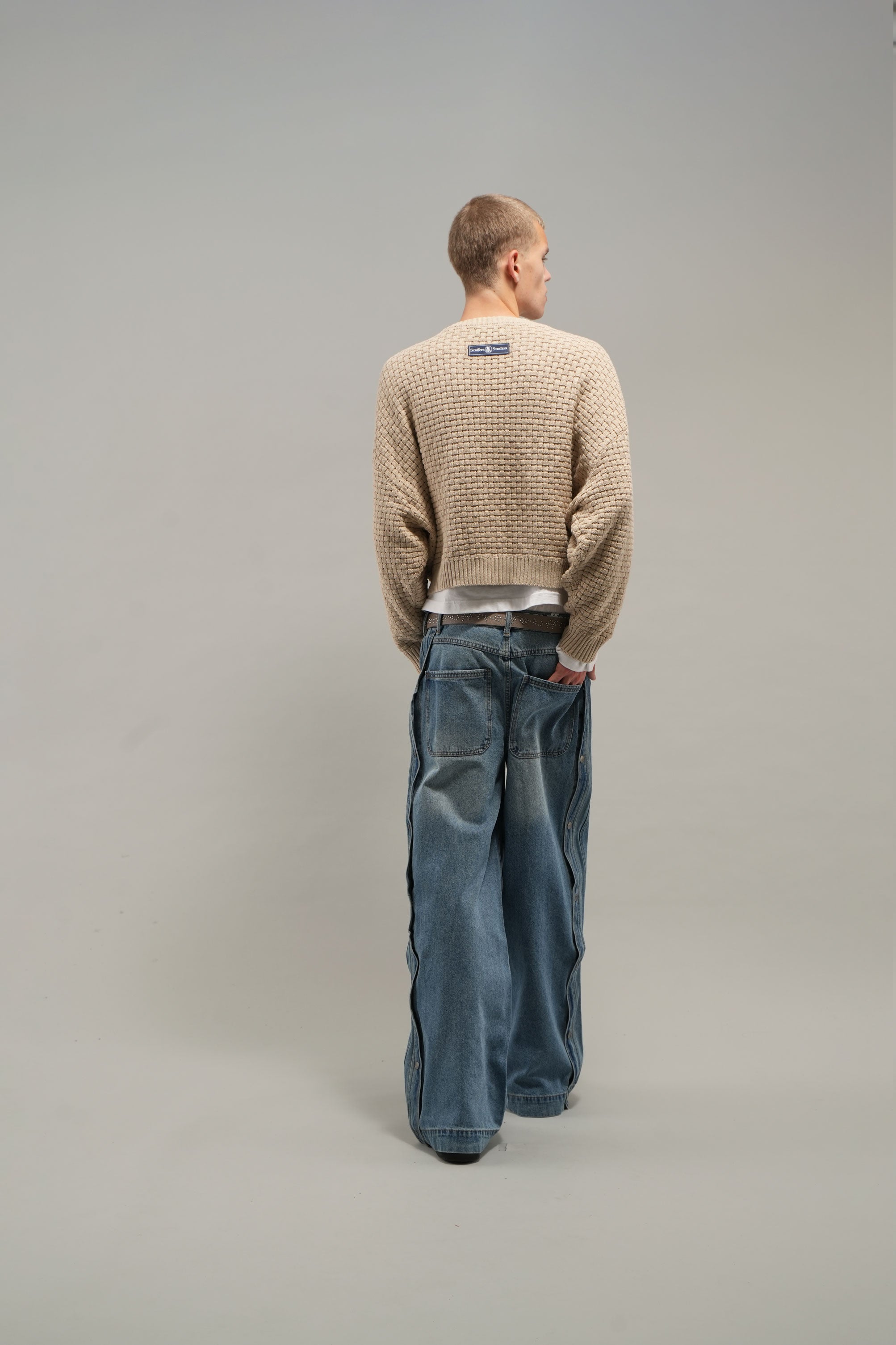 Wide-Leg Snap Button Jeans in Light Blue. Made from durable denim with a washed finish for a vintage look. Features a high waist, relaxed wide-leg fit, and contrast stitching. Snap button details along the side seams add versatility and style. Classic five-pocket design with embroidered branding on the front and a logo patch on the back waistband.