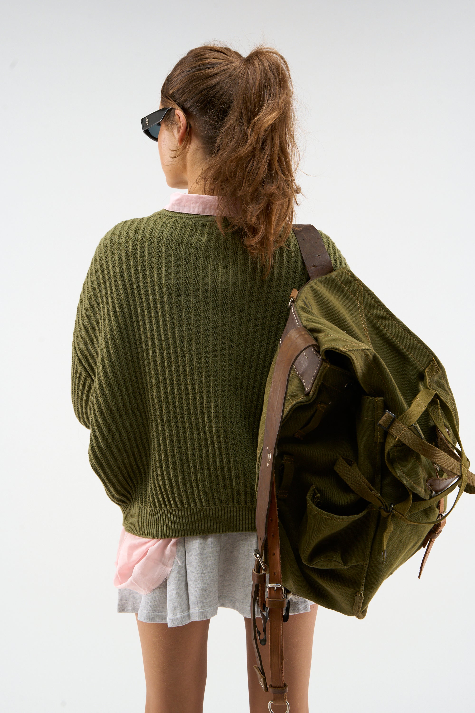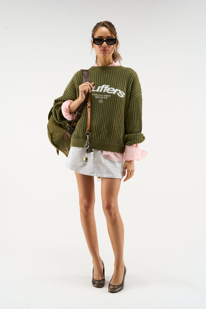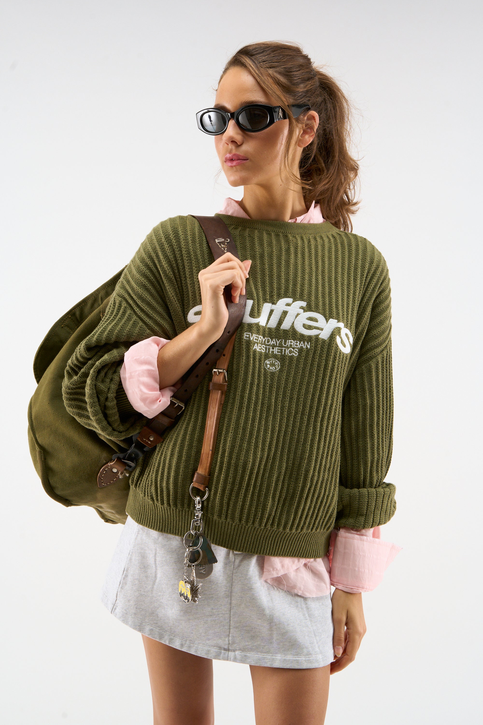 Oversized unisex caqui knit jersey. 'Scuffers', 'Everyday Urban Aesthetic' and 'With Love' logo on the front embroided in white.