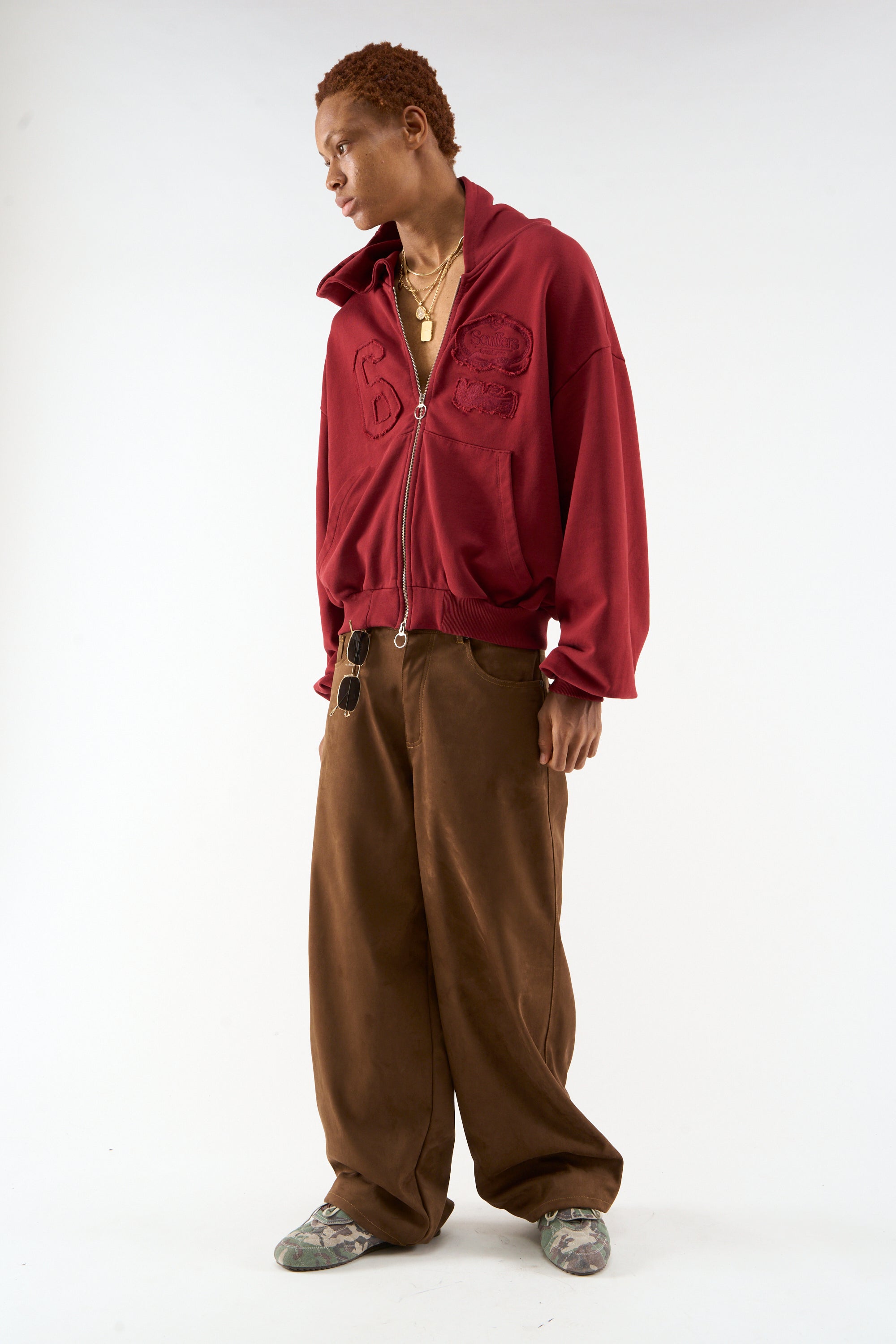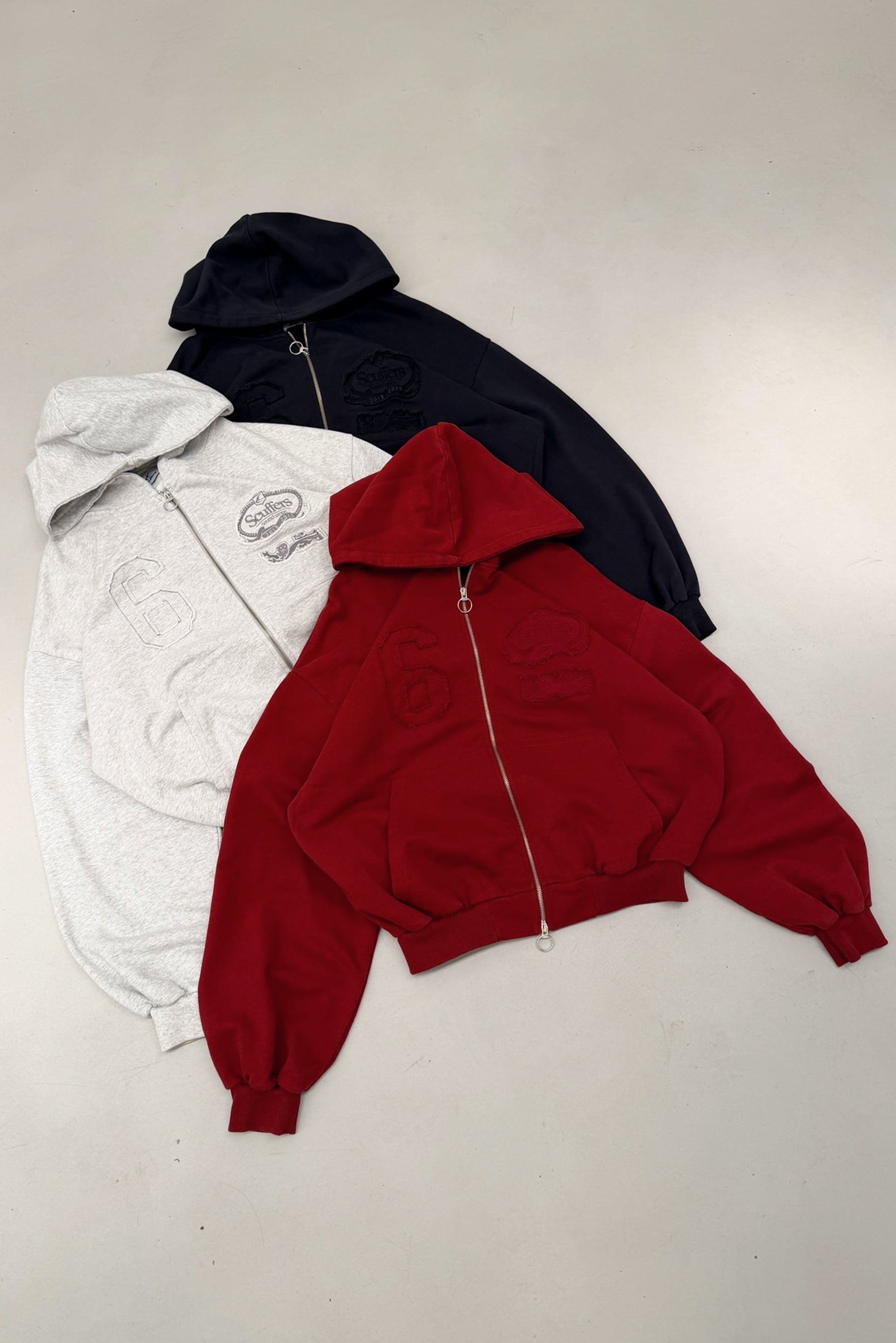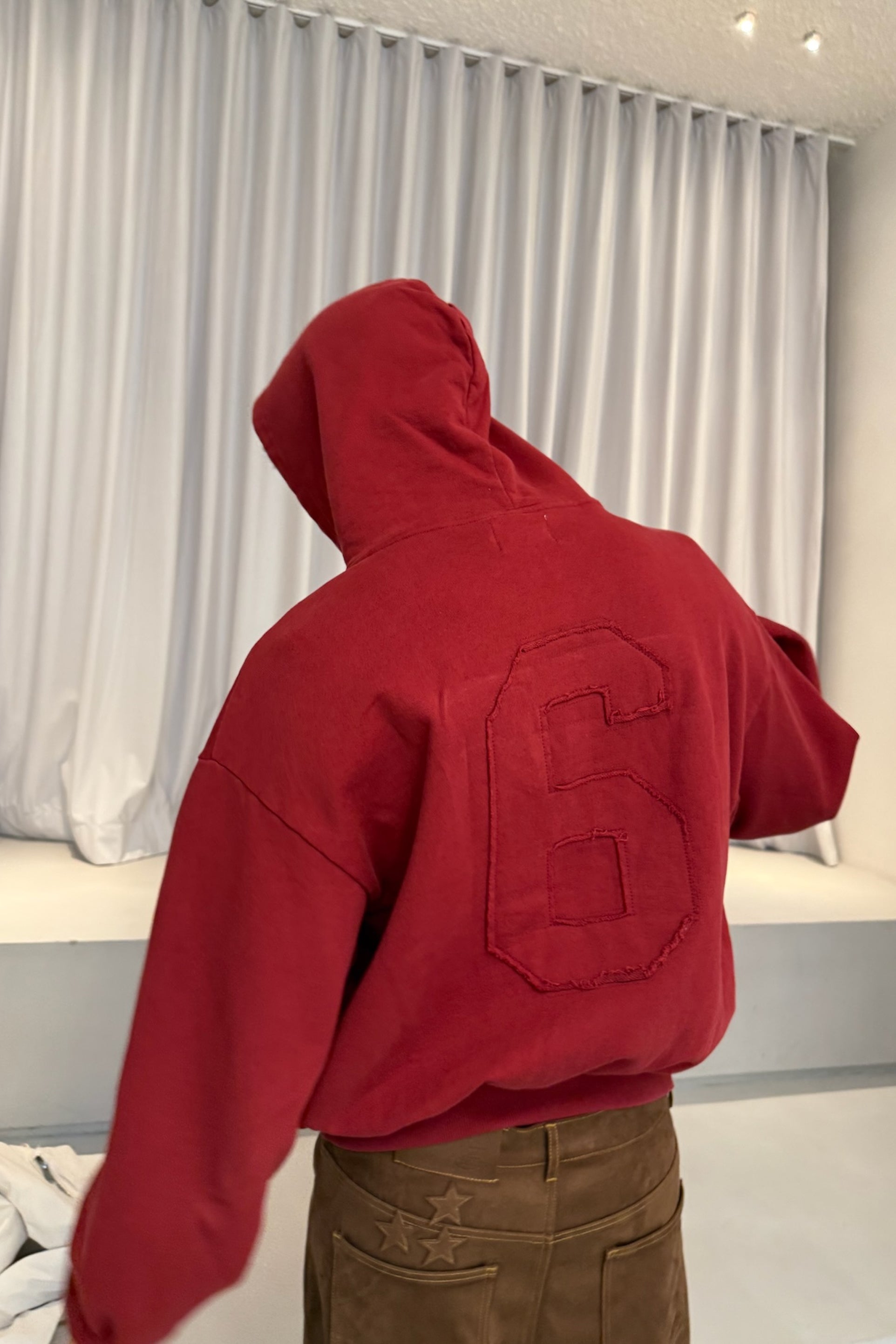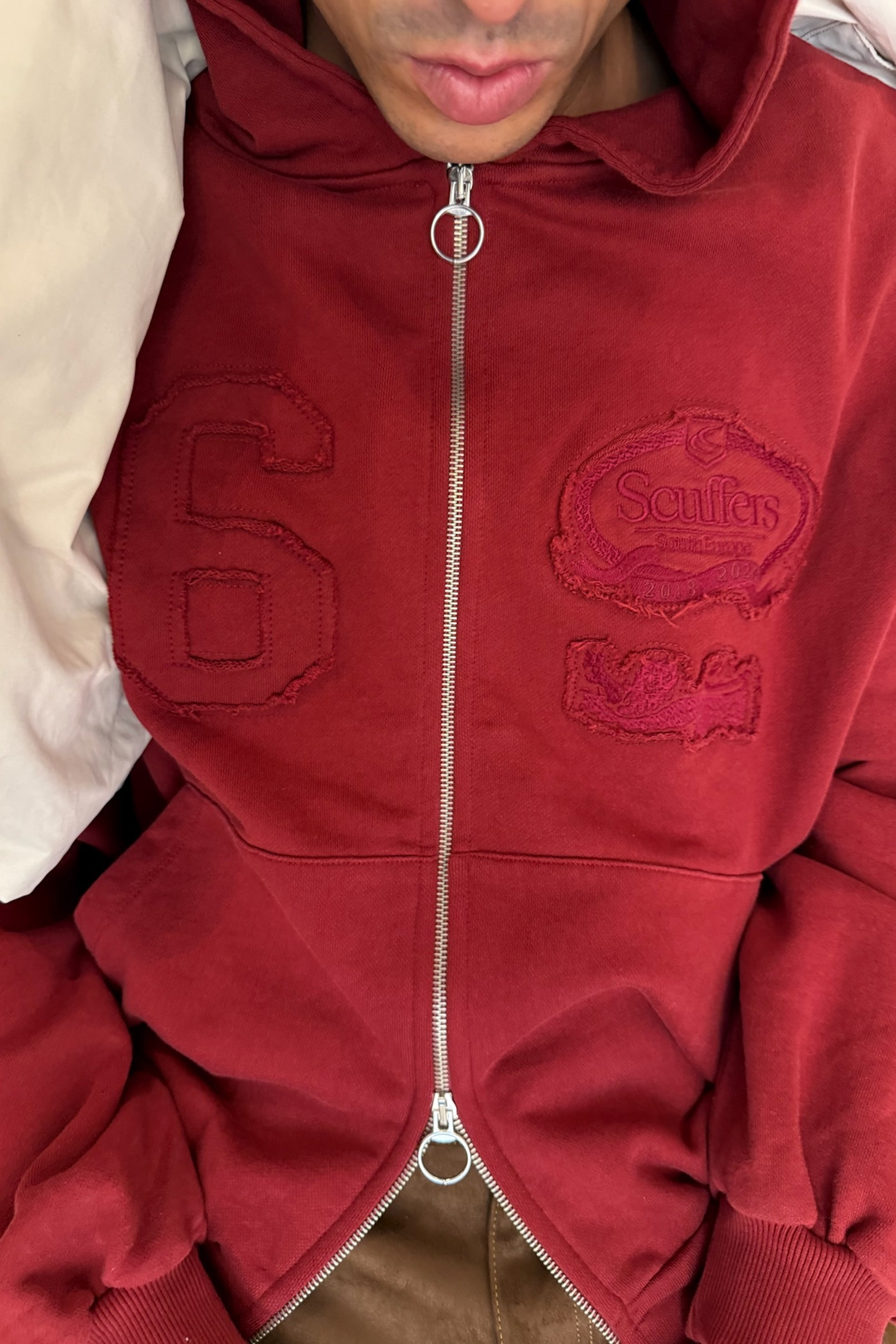 Jam Red Zipper Hoodie crafted from soft cotton, featuring a bold "6" and Scuffers logo embroidery on the front. The jacket has a full zip closure with a ring pull, ribbed cuffs, and an adjustable drawstring hood. The subtle distressed details add to its urban feel, perfect for relaxed styling with a sporty edge.