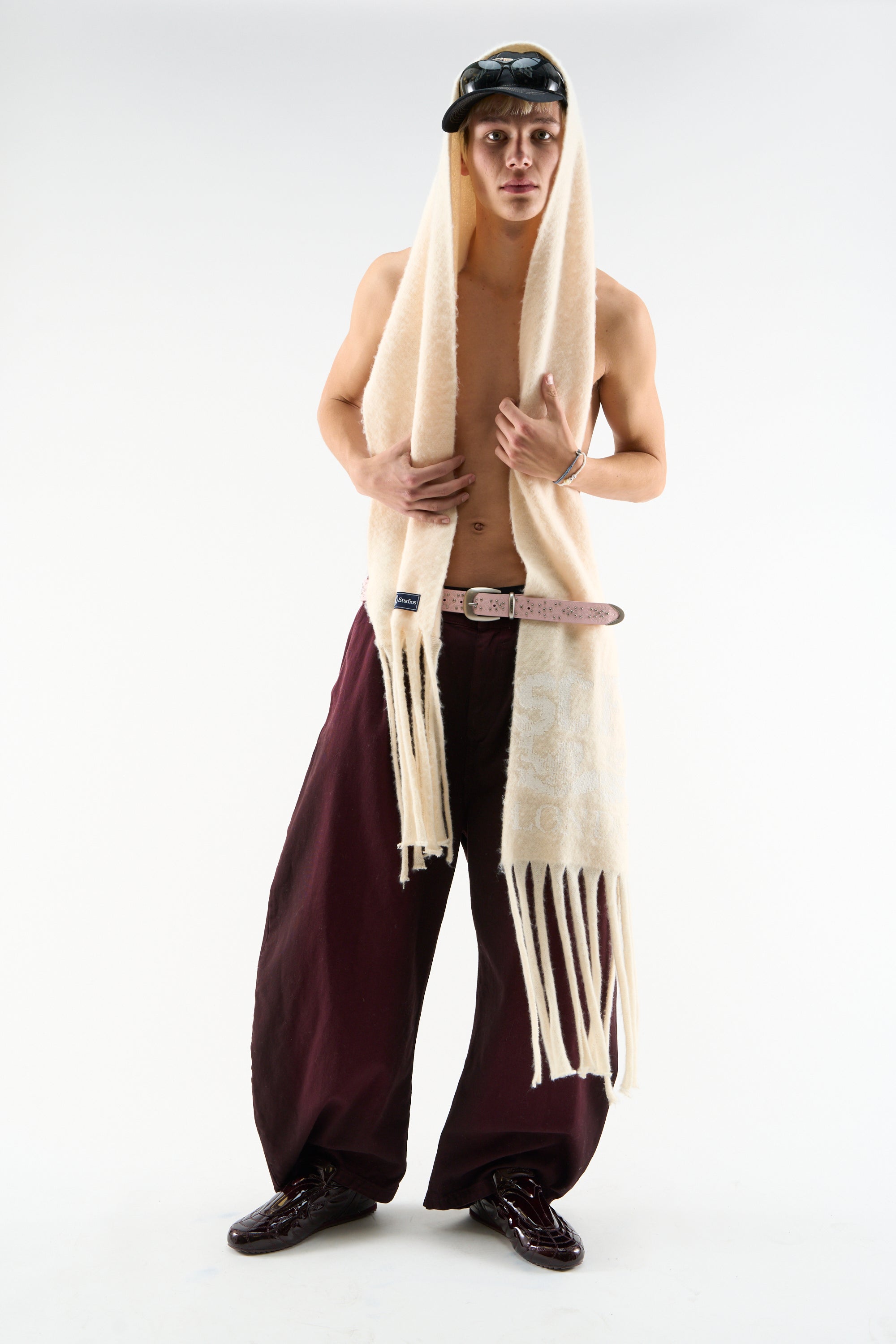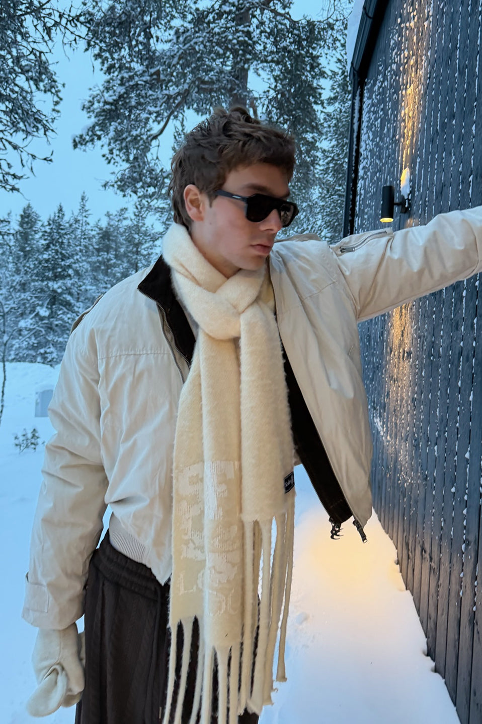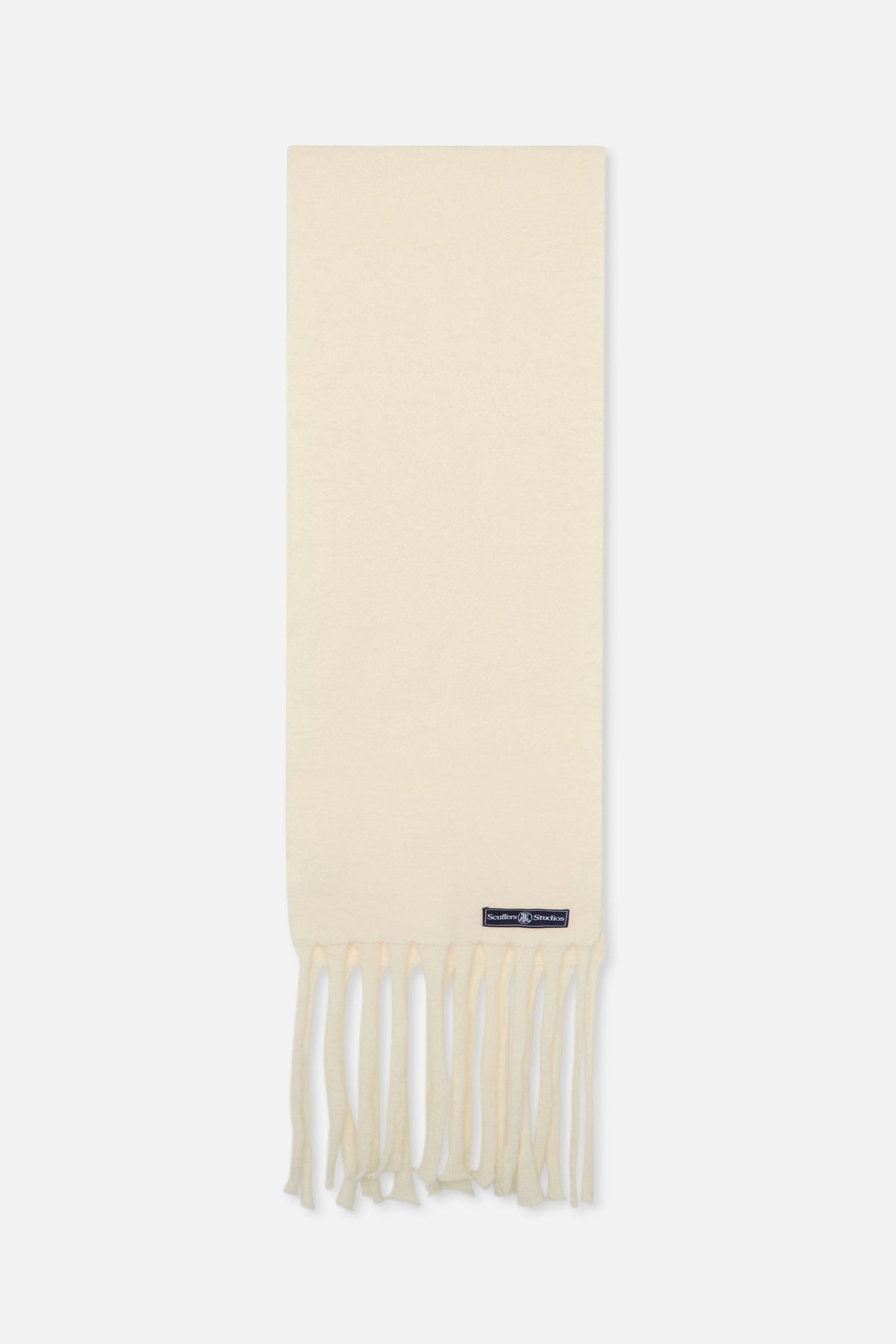 Fringed Scarf made from soft knitted fabric, featuring a bold "SCFF LONDON" logo woven across the bottom. The scarf has delicate fringed edges and comes in a creamy off-white color.
