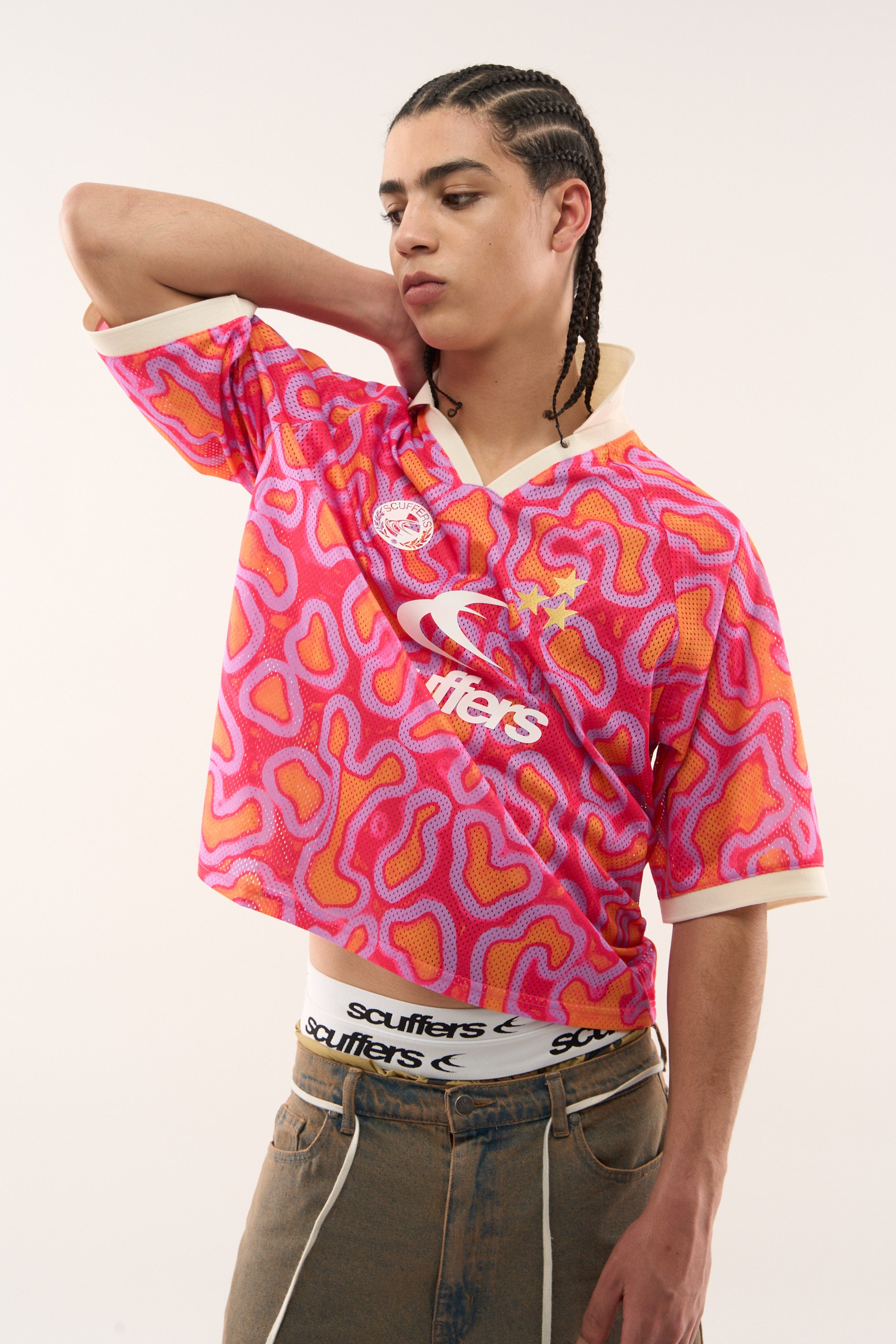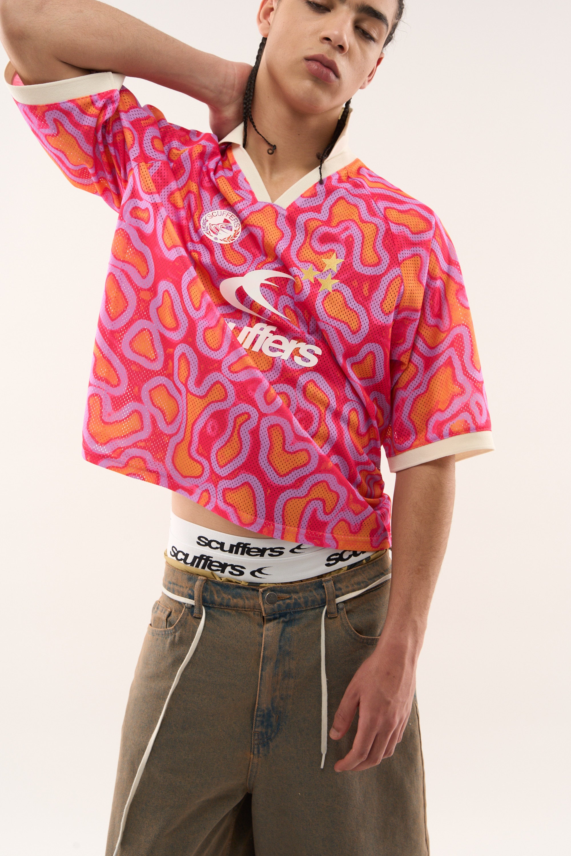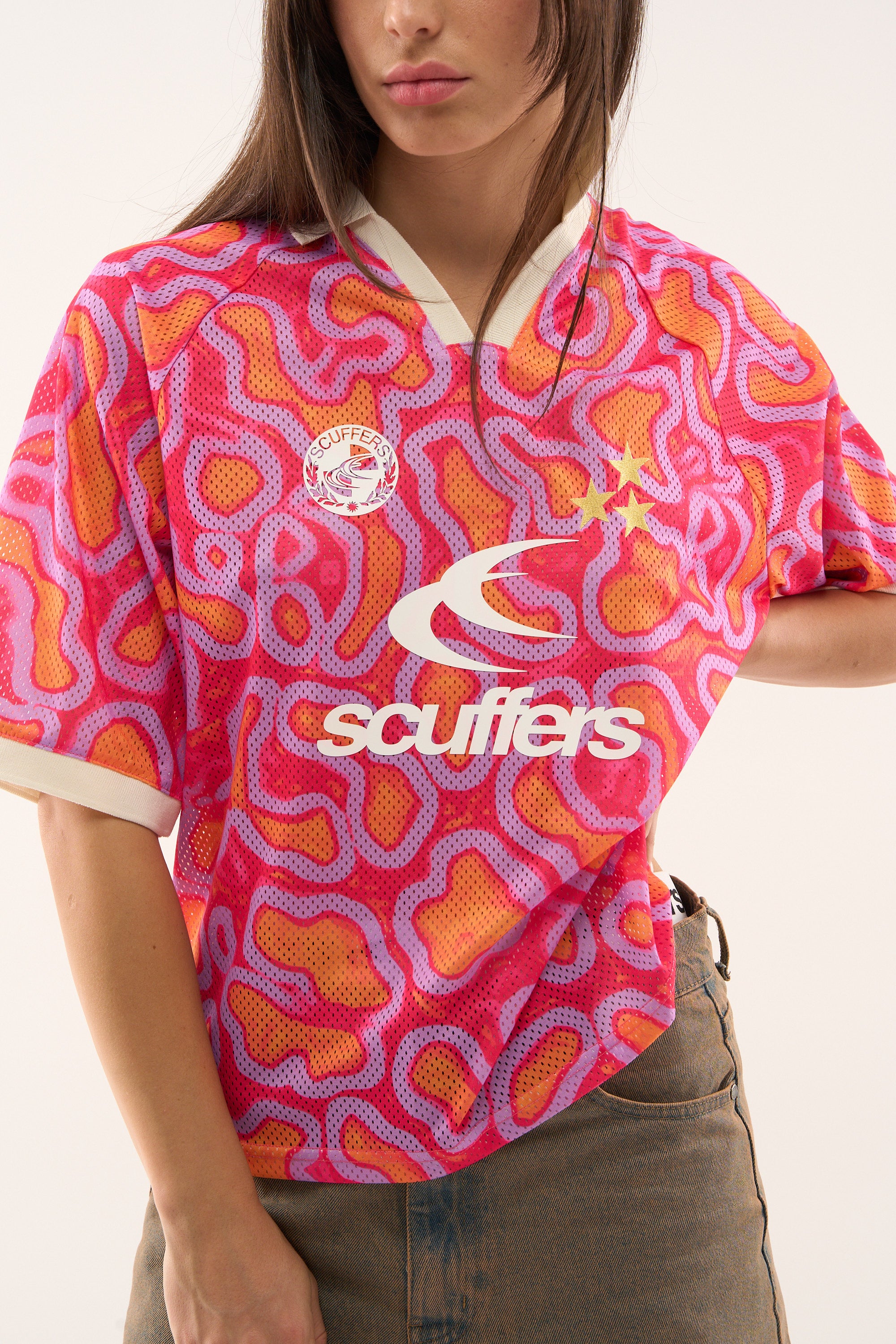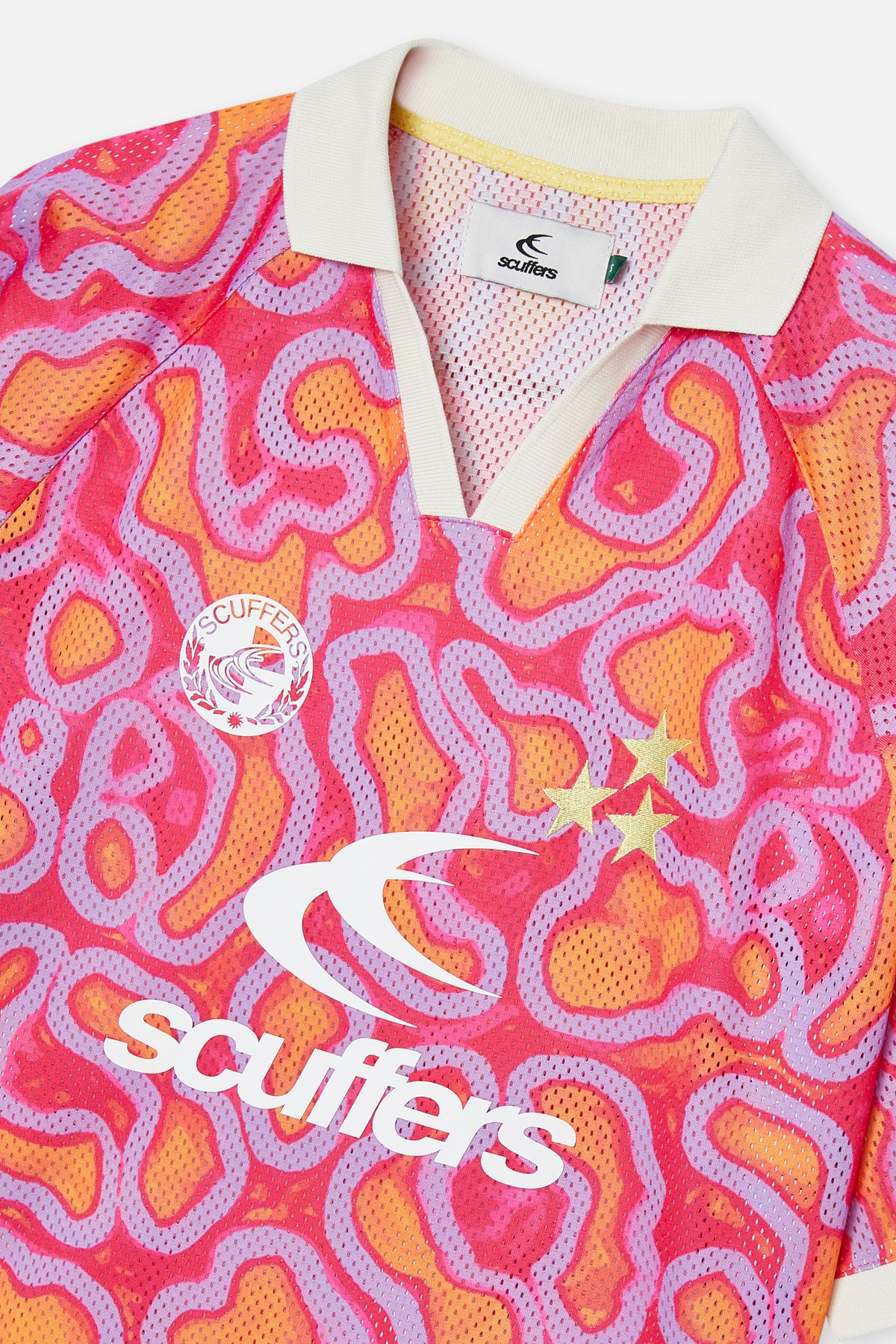 Vibrant mesh football t-shirt with a bold abstract pattern in pink, orange, and purple tones. Features a contrasting white ribbed collar with a V-neck design and matching white sleeve cuffs. The front displays a white Scuffers logo, a circular Scuffers crest, and two gold star appliqués. Made from breathable mesh fabric for comfort and ventilation.