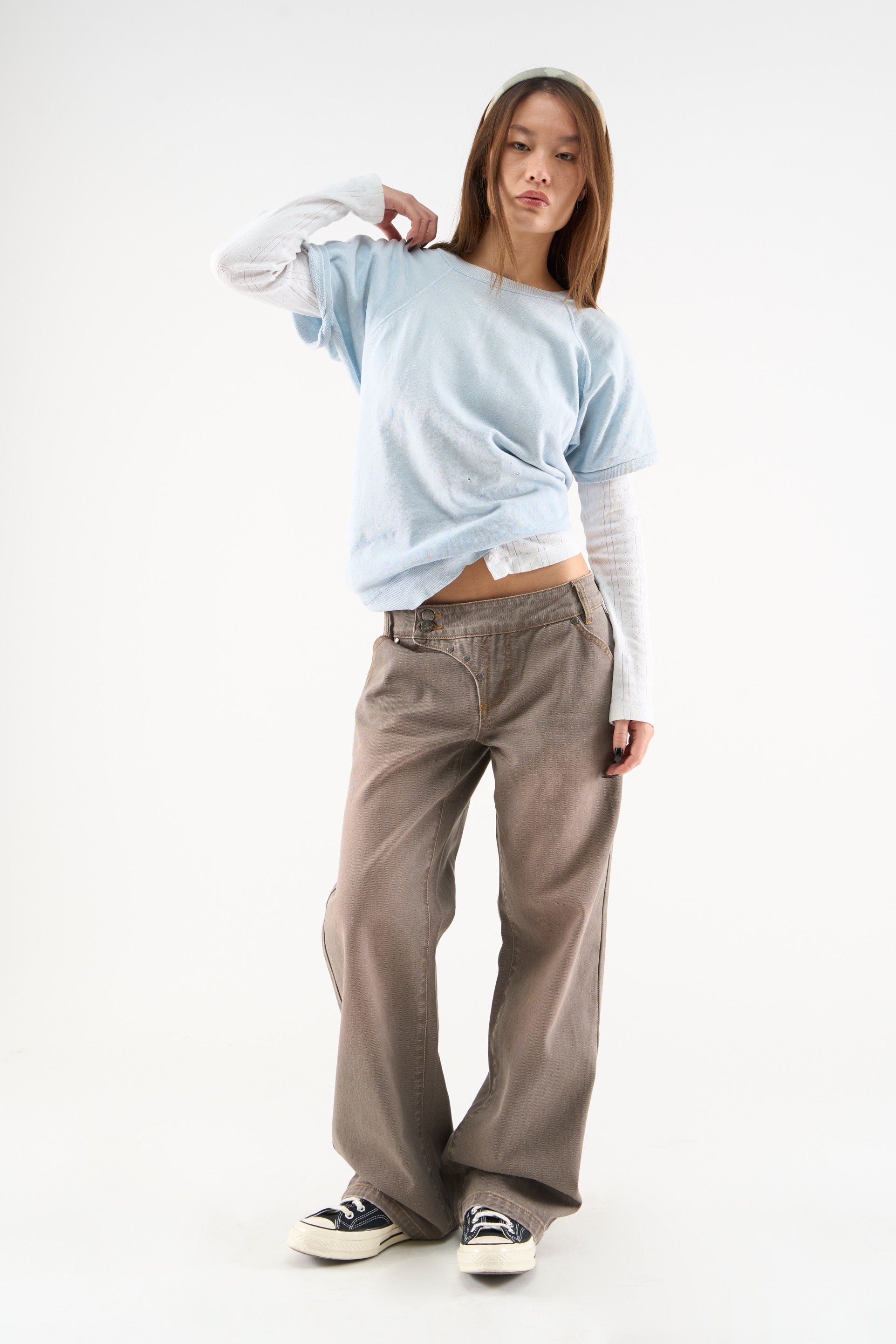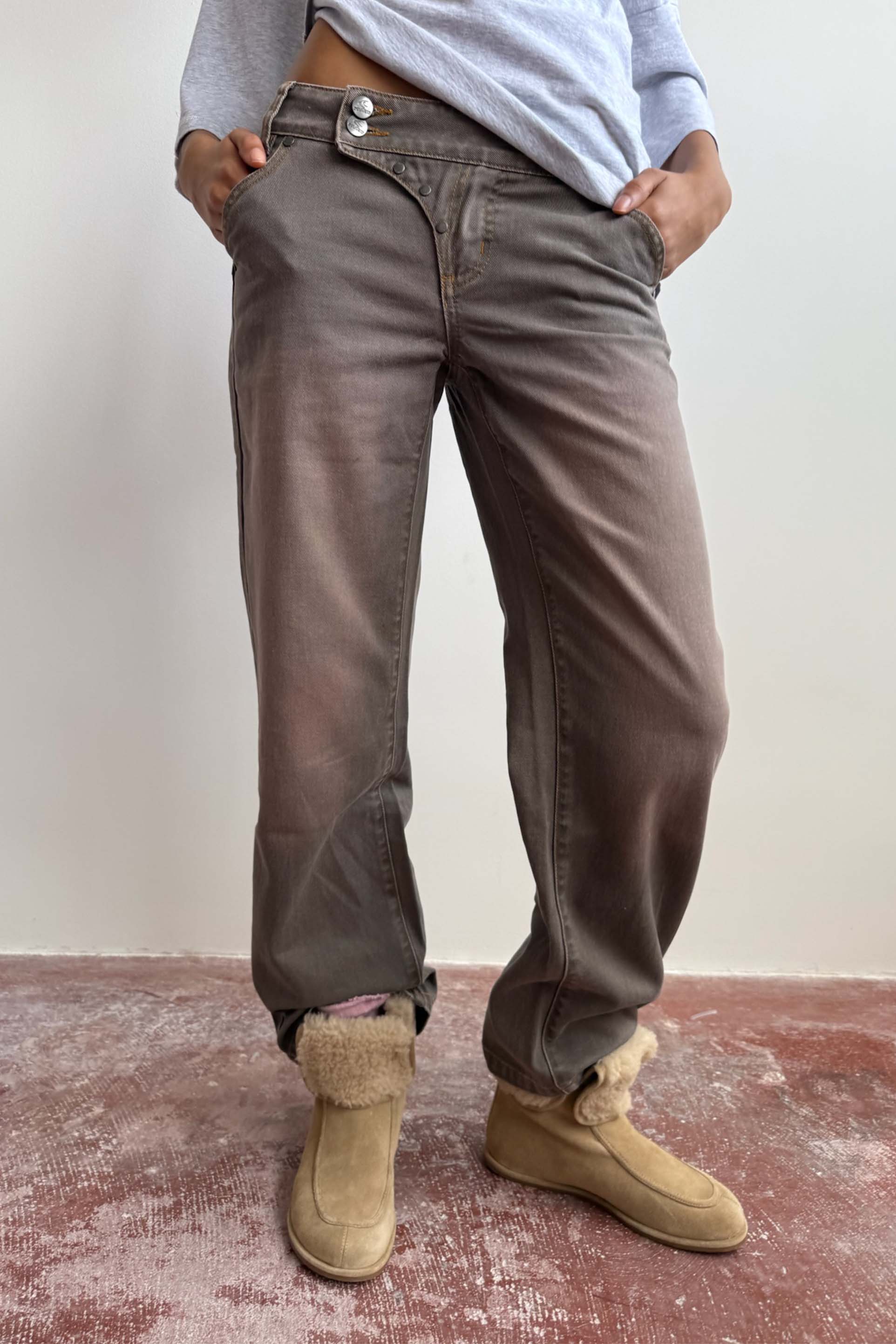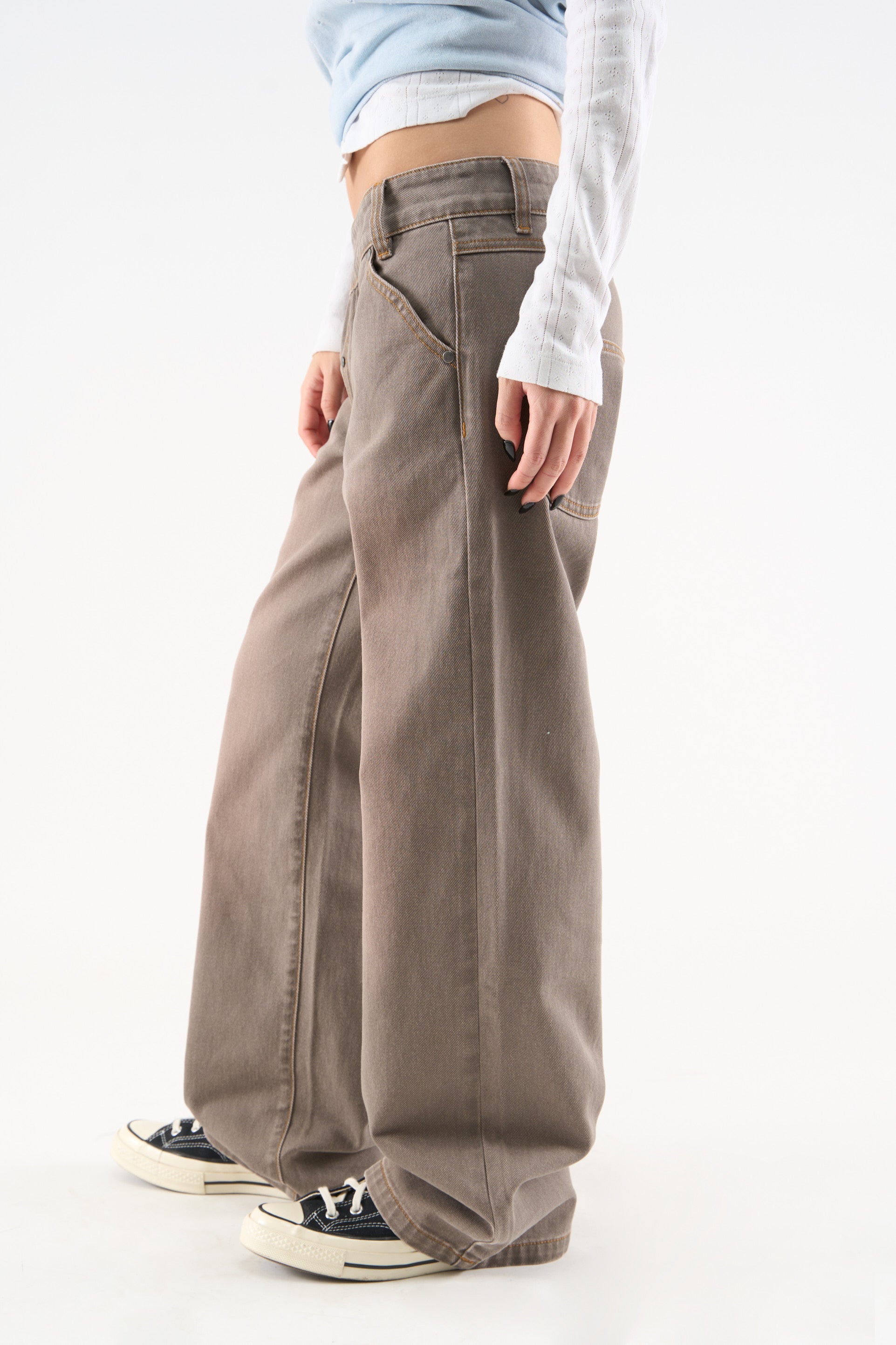 Faded Taupe Wide-Leg Jeans – Mid-weight denim with washed front fade effect and contrast stitching. Features low-rise waist with curved yoke seam, asymmetrical triple-button fly, and five-pocket styling. Silver-tone rivets and logo-embossed hardware. Loose, full-length fit.
