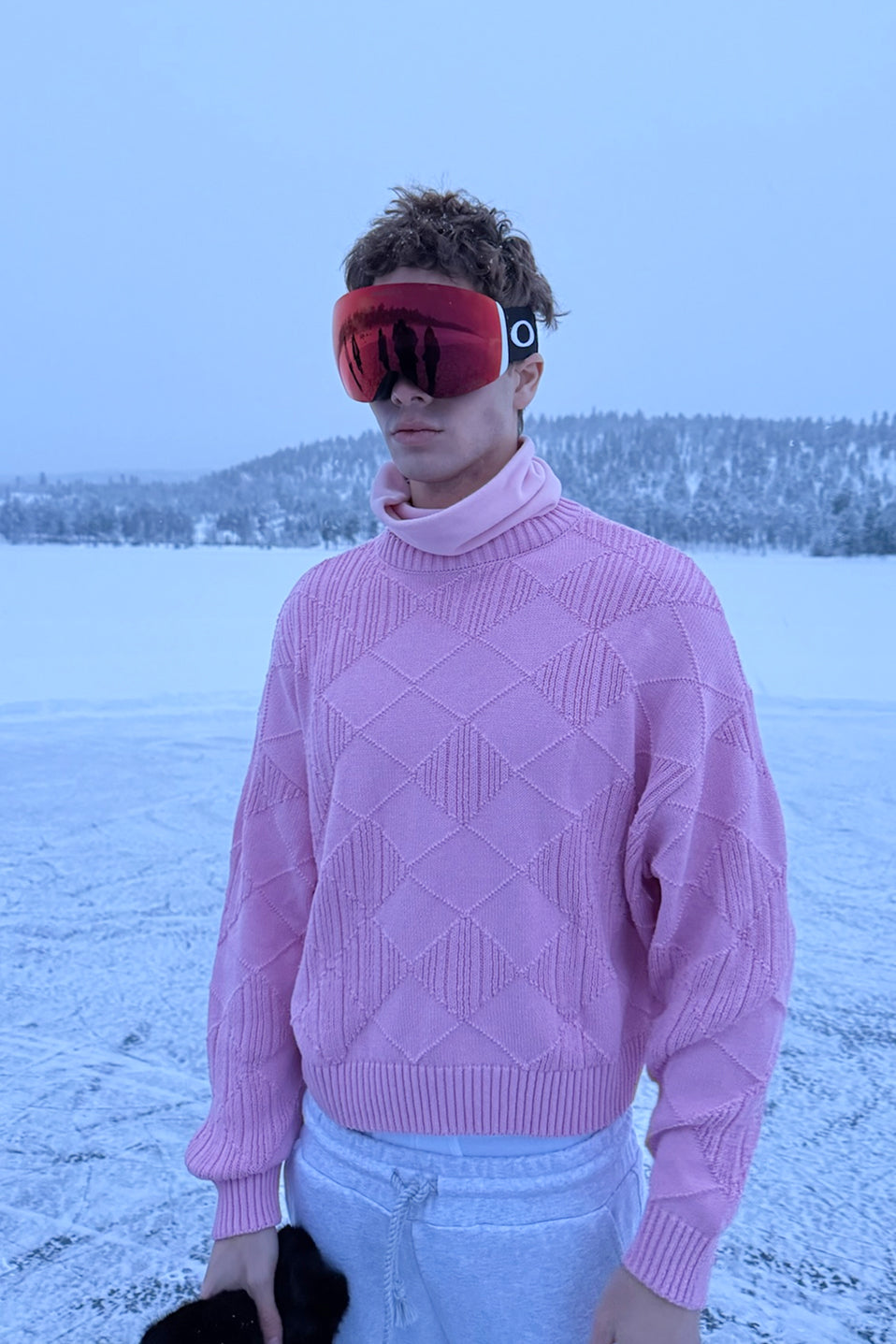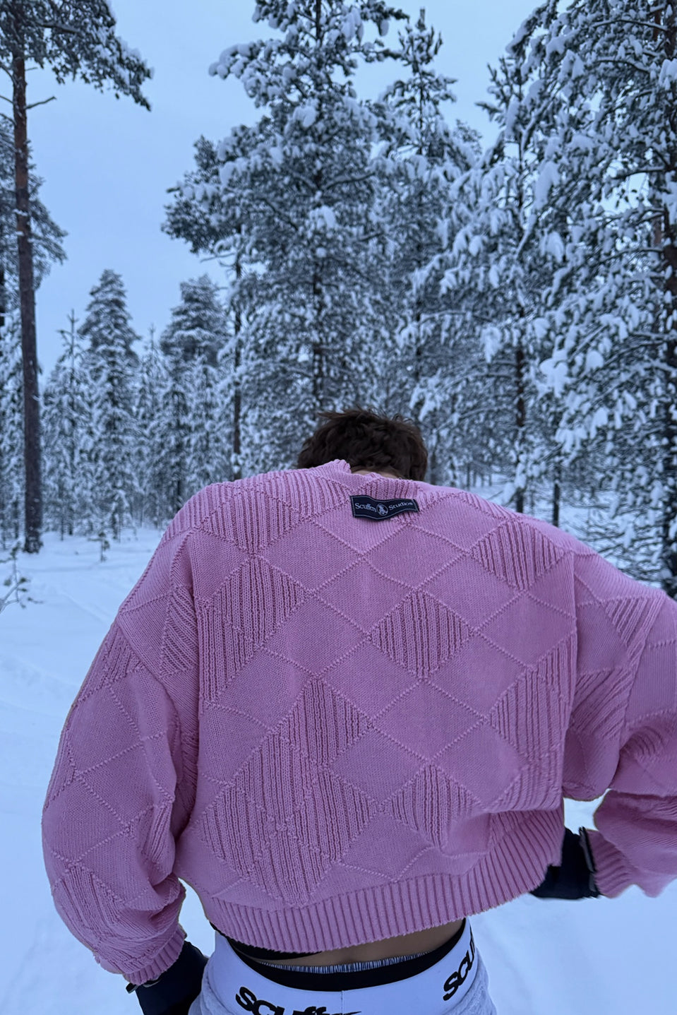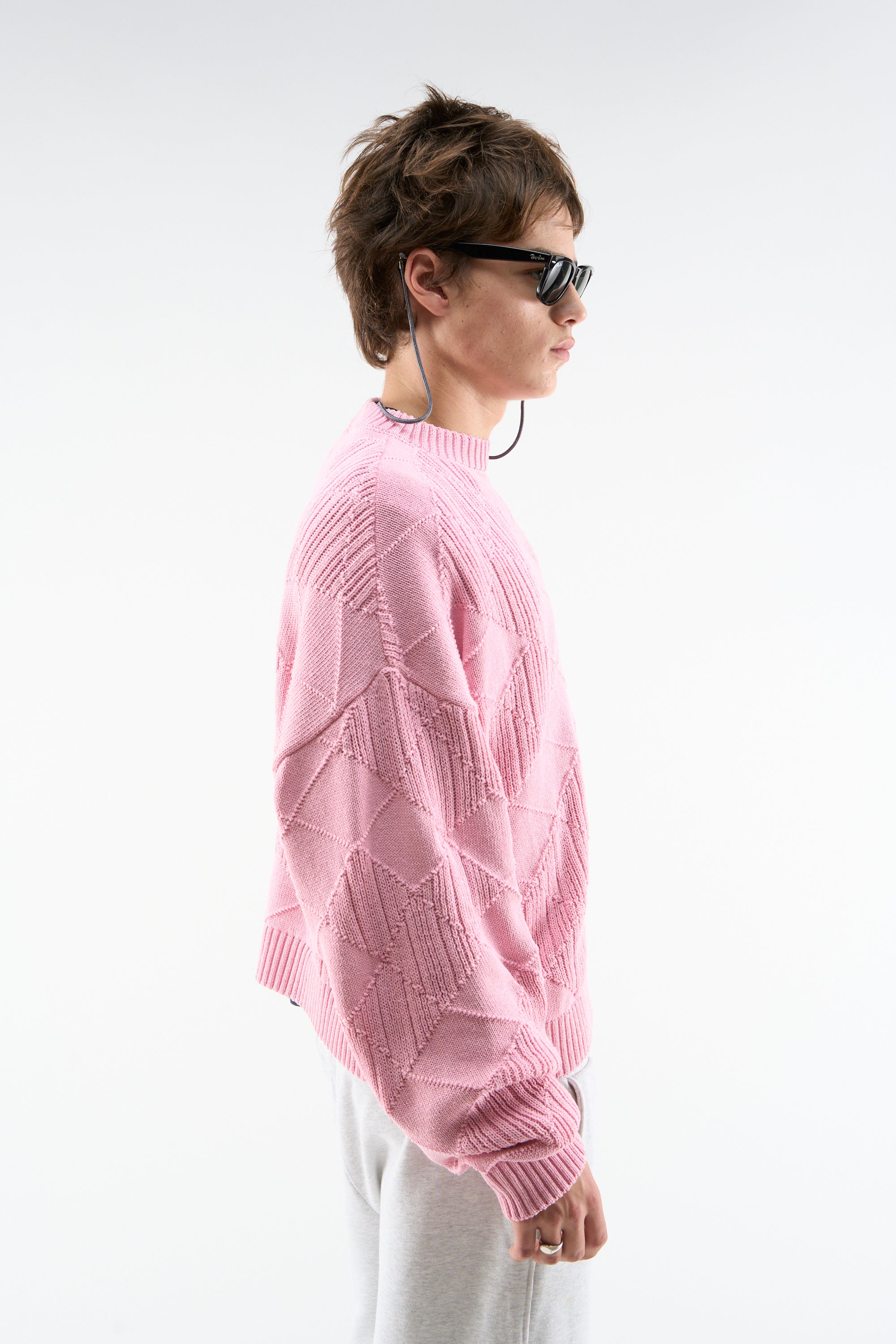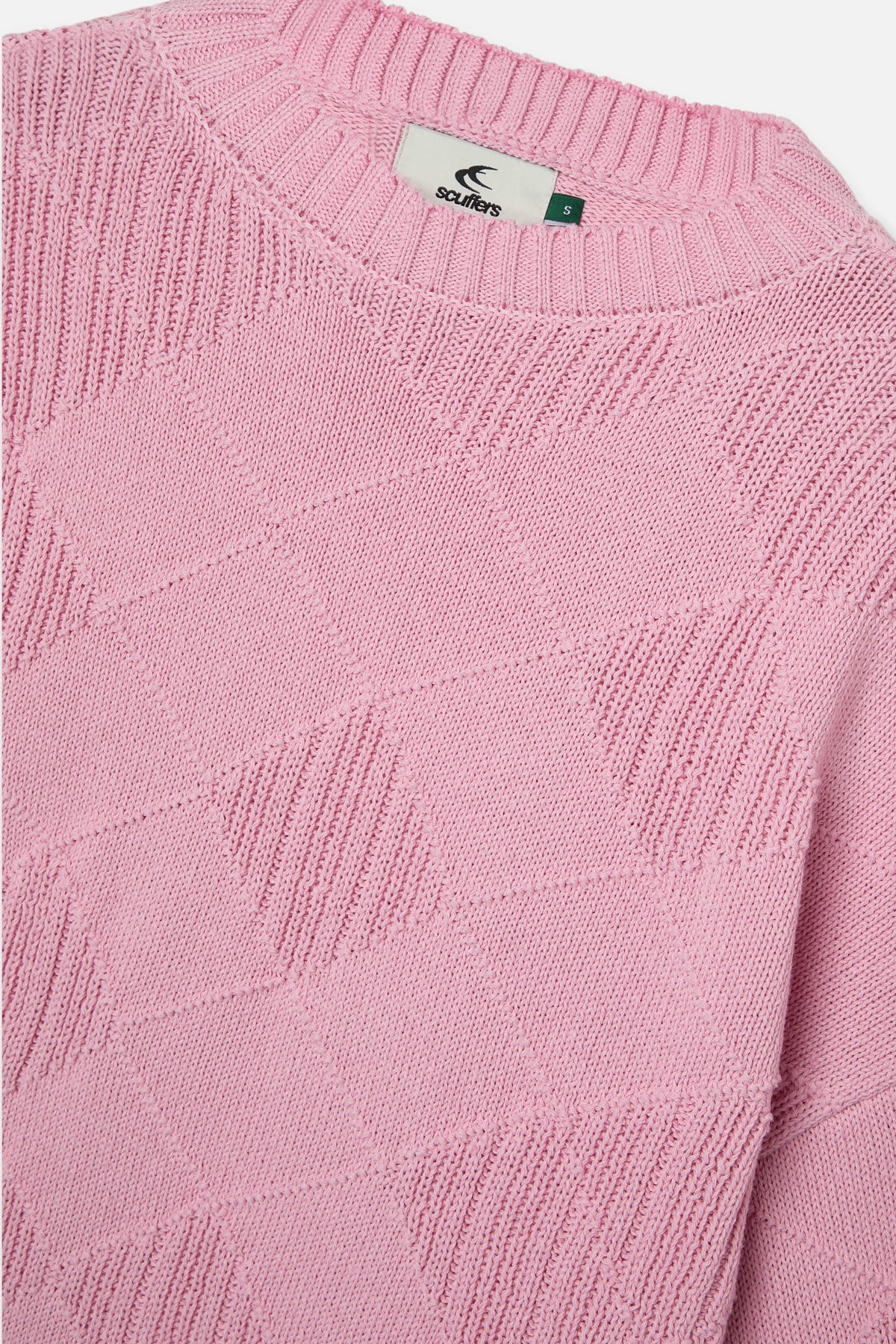 Pink knit sweater made from soft cotton blend fabric. Features a diamond pattern woven throughout the front and sleeves. The sweater has a ribbed crew neckline, cuffs, and hem for a fitted finish. A small "Scuffers Studio" logo patch is stitched on the back. The back and sleeves maintain the same textured pattern as the front, with no additional design details.