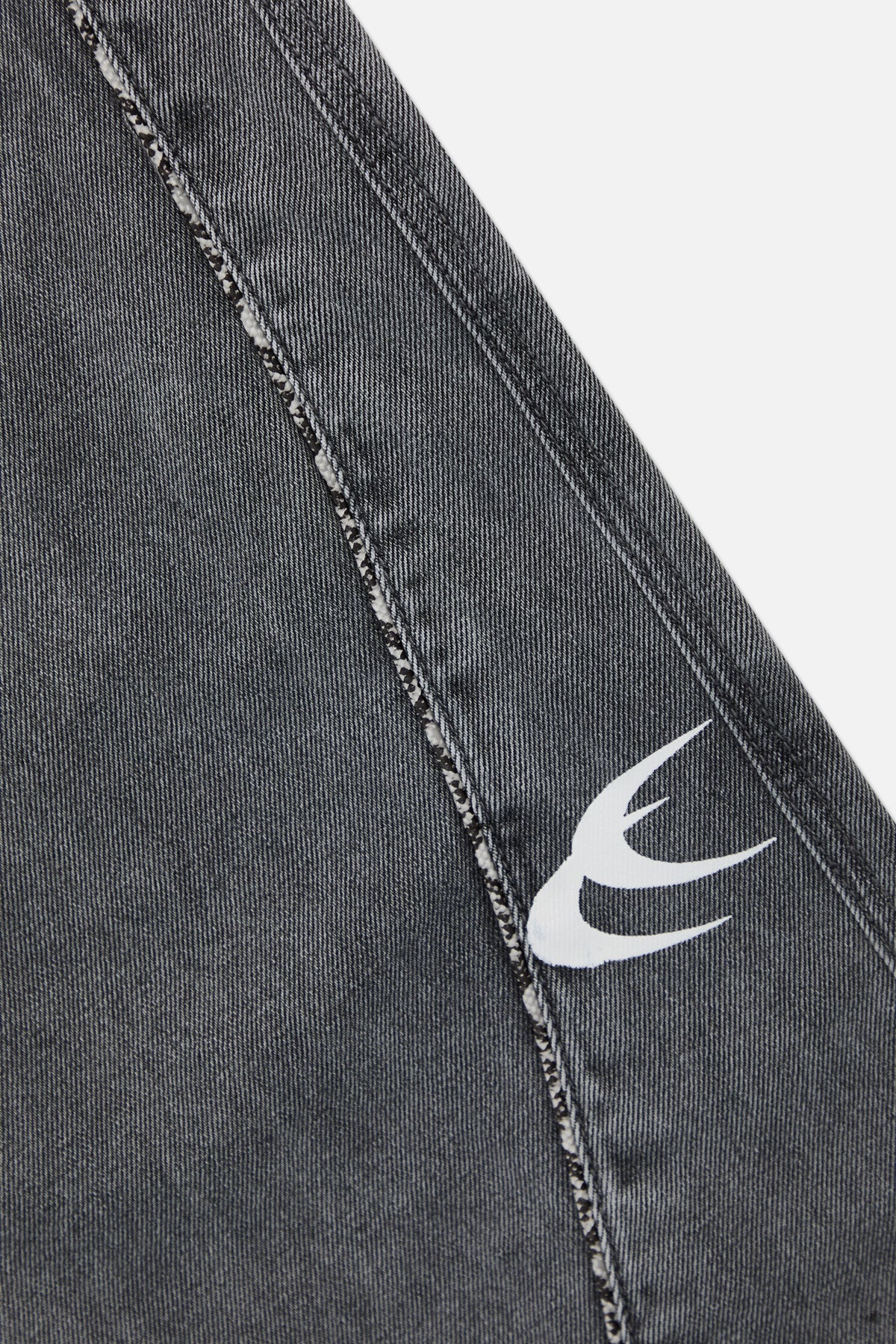 Wide-Leg Jeans in Grey denim with contrast white piping along curved seams. Made from sturdy cotton fabric with a structured finish. Features a high-rise waist, five-pocket construction, zip fly with button closure, and logo detail near the hem.