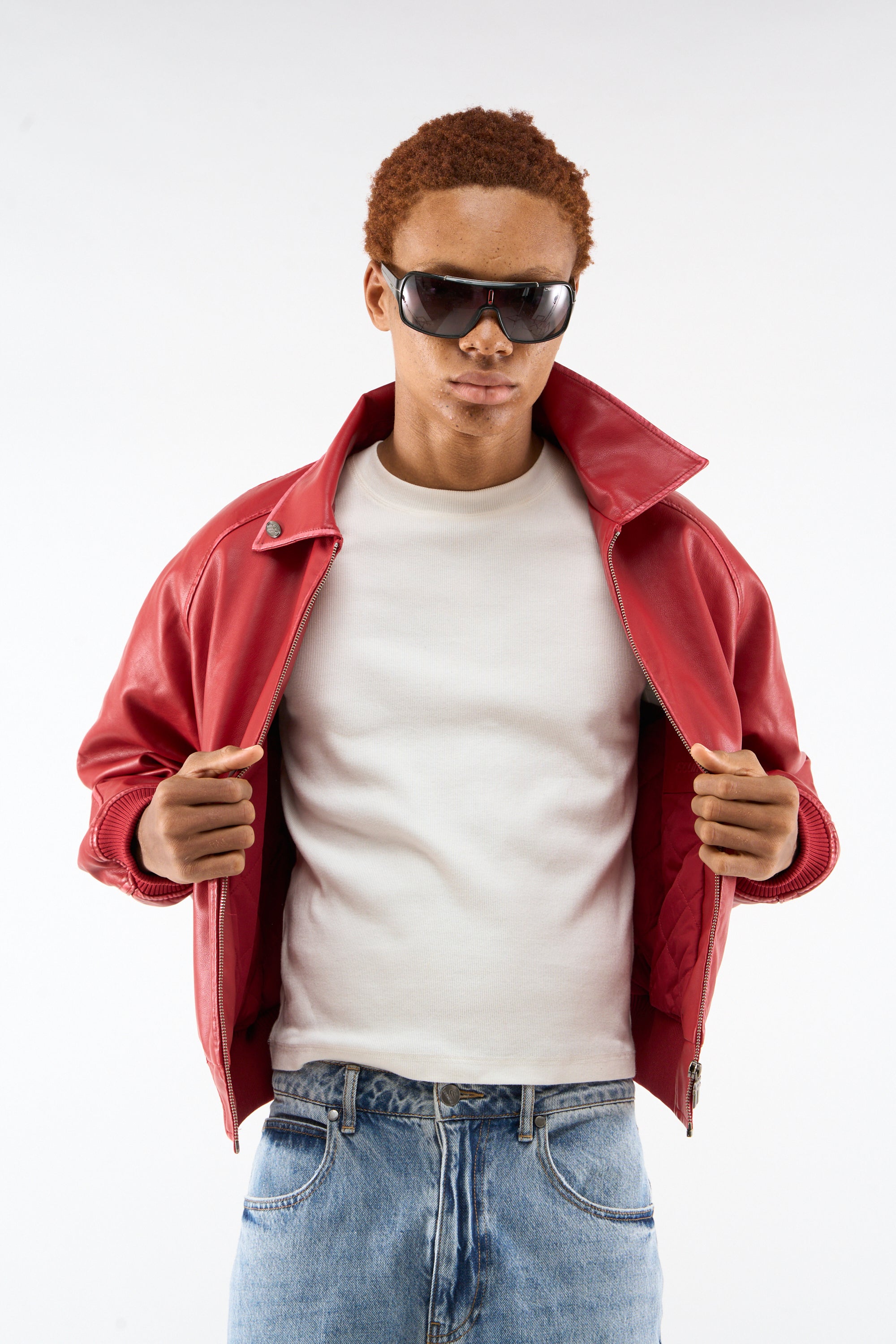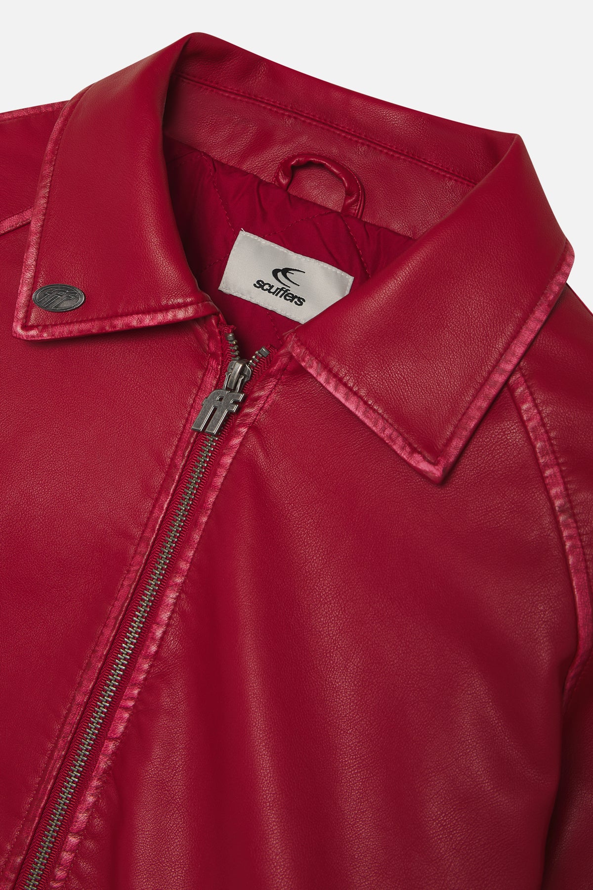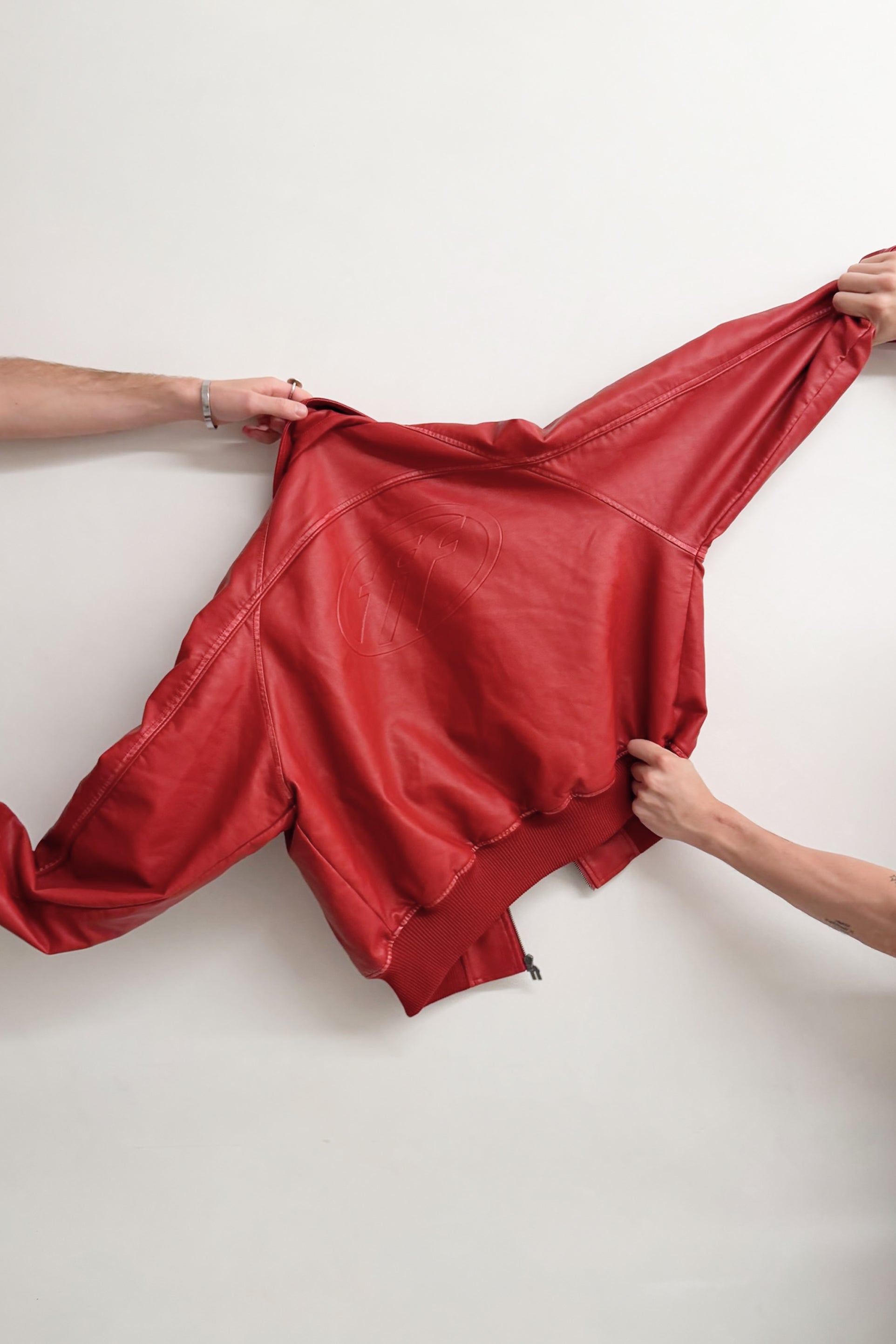 New Red Raw Jacket made from smooth faux leather, featuring a bold embossed logo on the back. The jacket has a full zip closure, ribbed cuffs, and hem for a sporty look. The collar and sleek silhouette provide an edgy yet classic feel, perfect for adding a pop of color to any outfit.