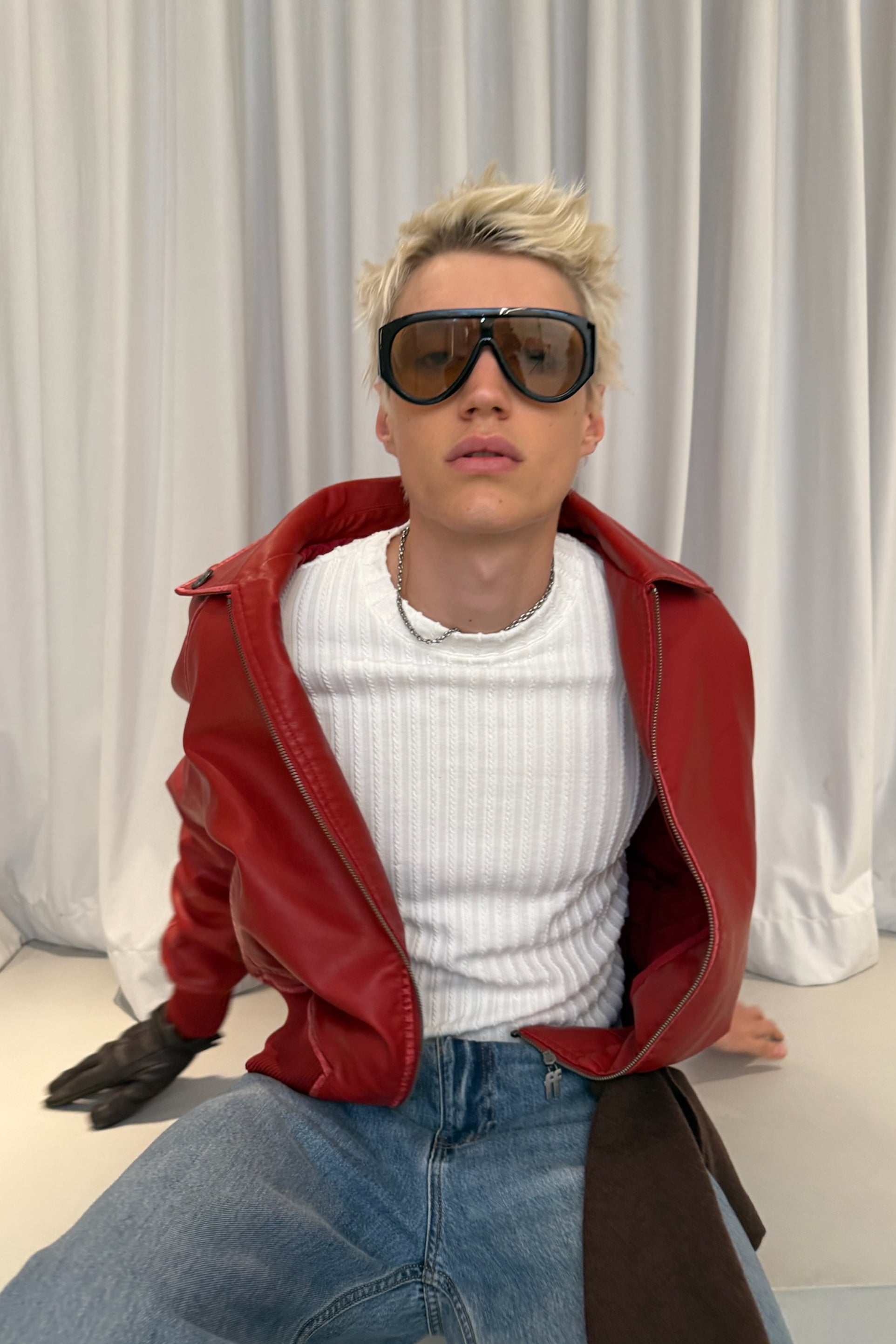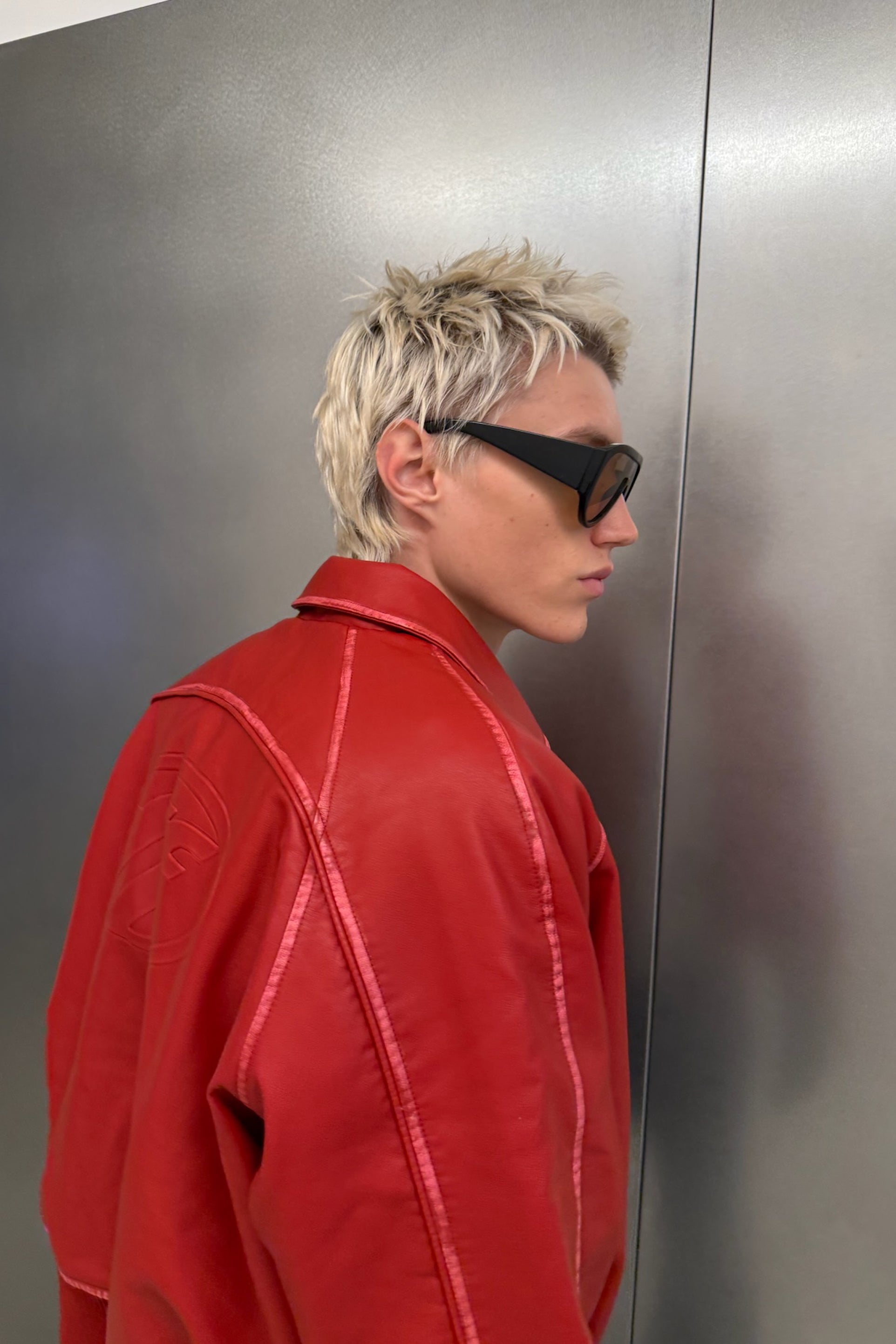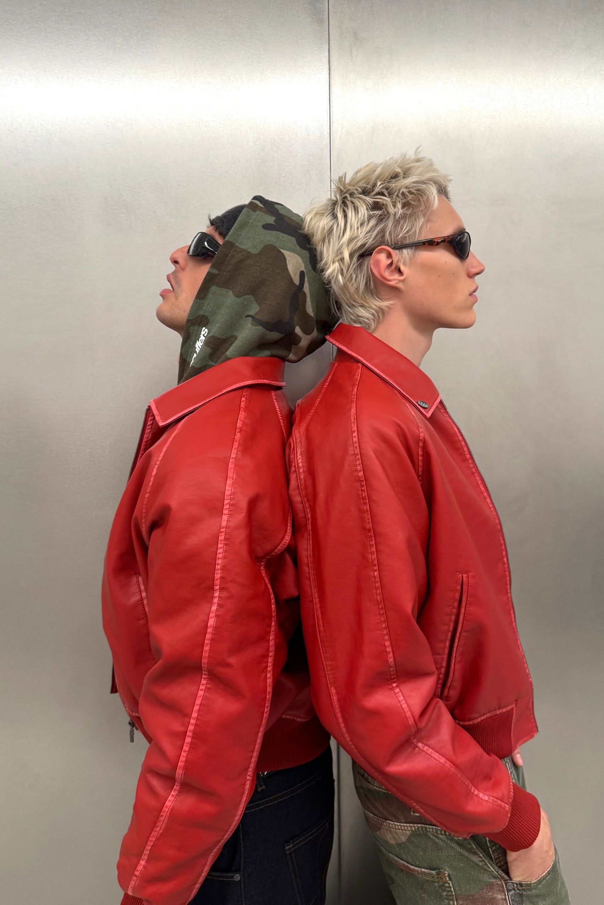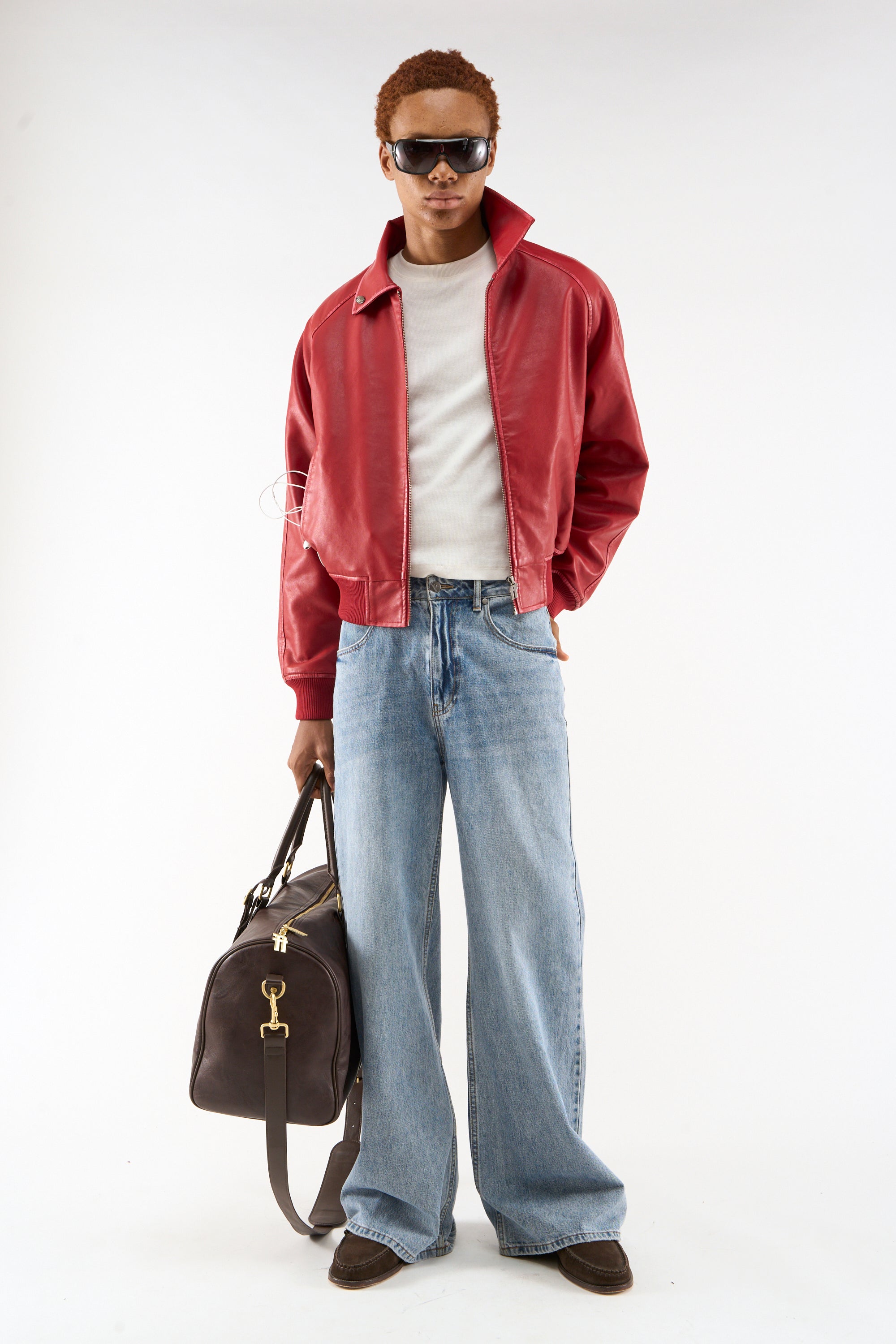 New Red Raw Jacket made from smooth faux leather, featuring a bold embossed logo on the back. The jacket has a full zip closure, ribbed cuffs, and hem for a sporty look. The collar and sleek silhouette provide an edgy yet classic feel, perfect for adding a pop of color to any outfit.