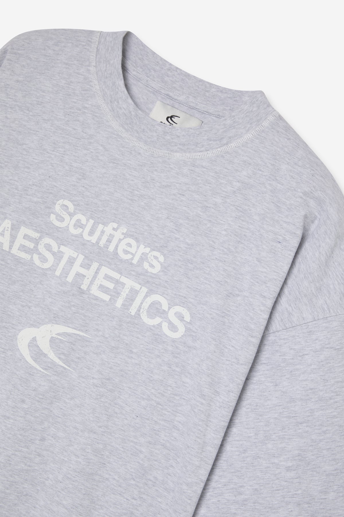 Nobrand Light Grey Melange T-Shirt made from soft cotton fabric, featuring bold "Scuffers AESTHETICS" text on the front in contrasting white. The relaxed fit and minimalistic design make it a versatile piece, perfect for casual wear. A classic style with a modern touch.