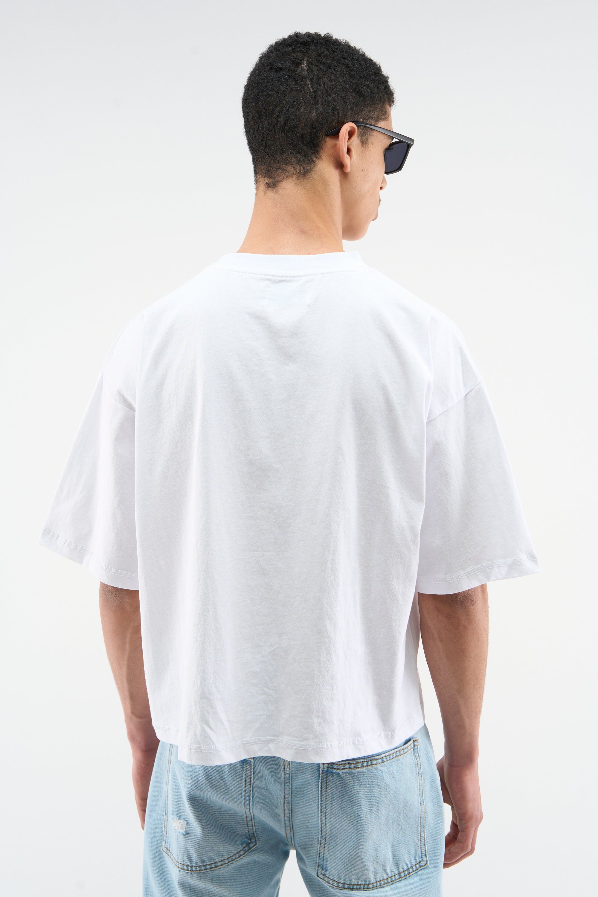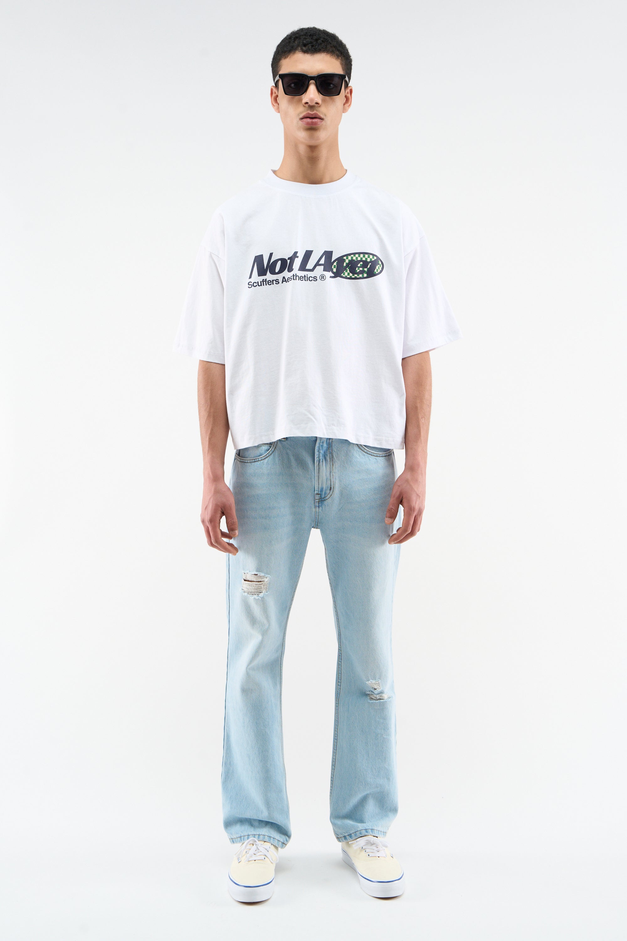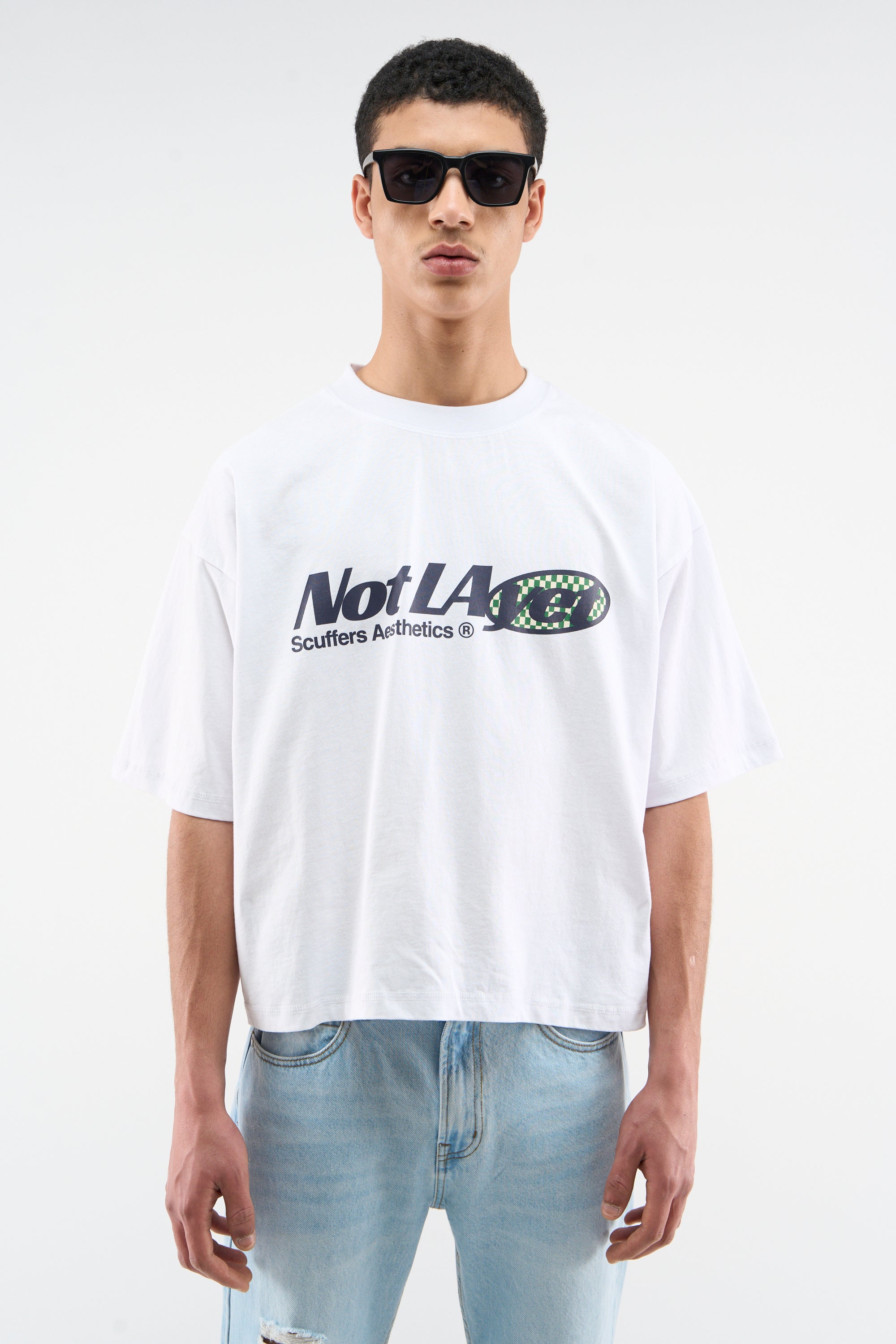 Not LA Yet T-Shirt in white made from cotton jersey with a soft, midweight feel. Features a regular fit, ribbed crew neckline, and short sleeves. Front graphic includes “Not LA yet” text with Scuffers Aesthetics branding. Back is unprinted.