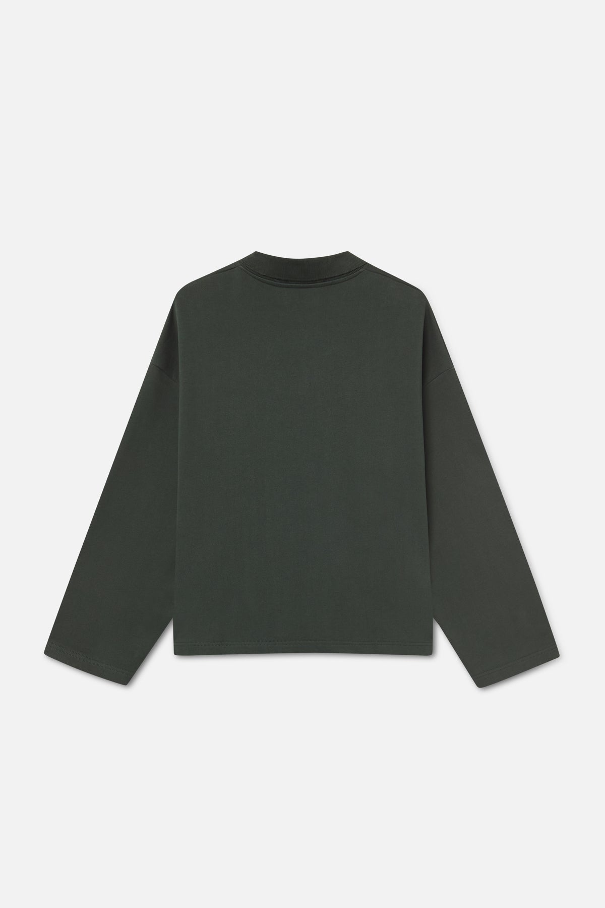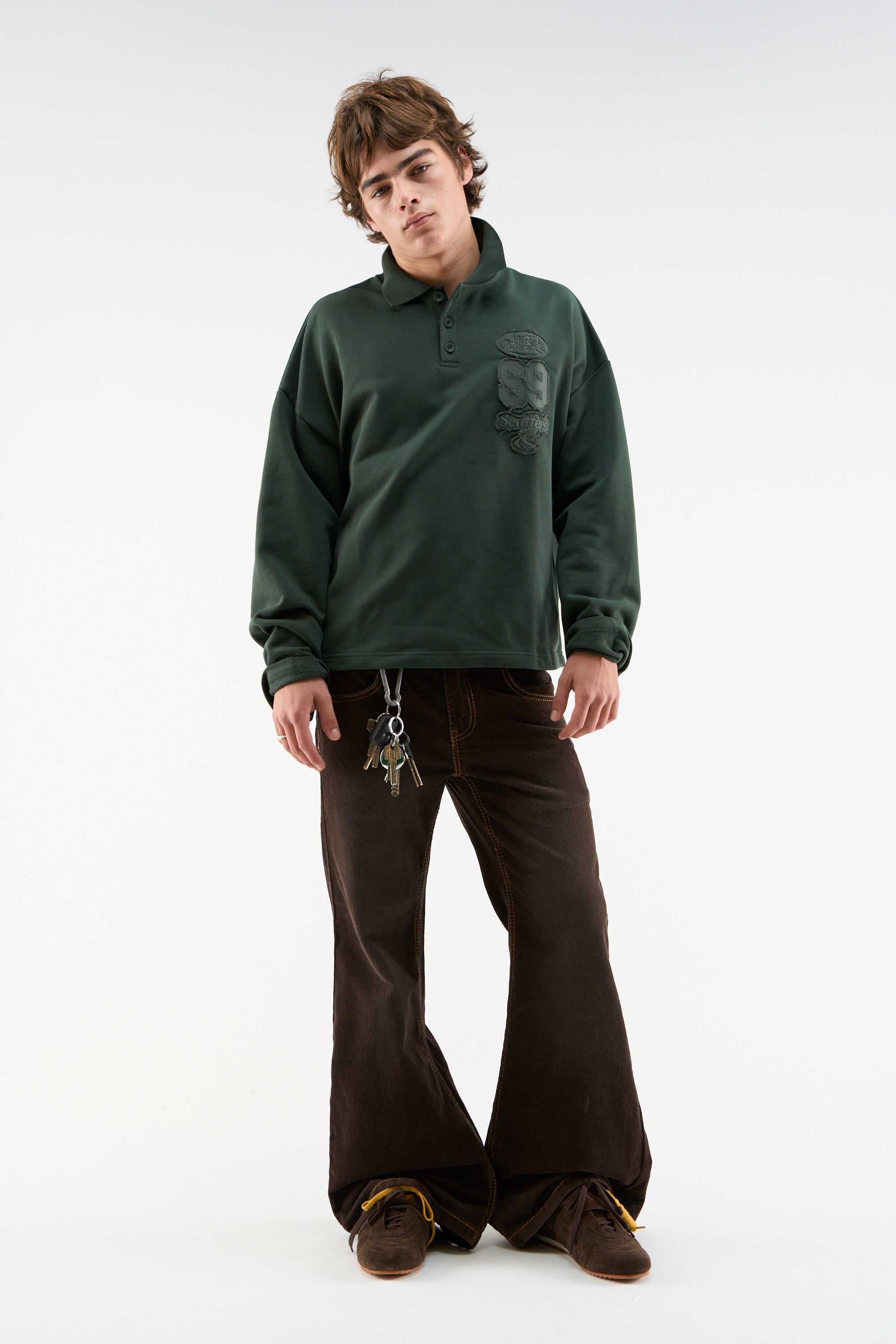 Green Long Sleeve Polo Shirt in cotton piqué with a relaxed fit. Features a classic collar, three-button placket, and tonal varsity-style embroidery on the chest including "S9", "Scuffers", and "with love" motifs. Straight hem and set-in sleeves.