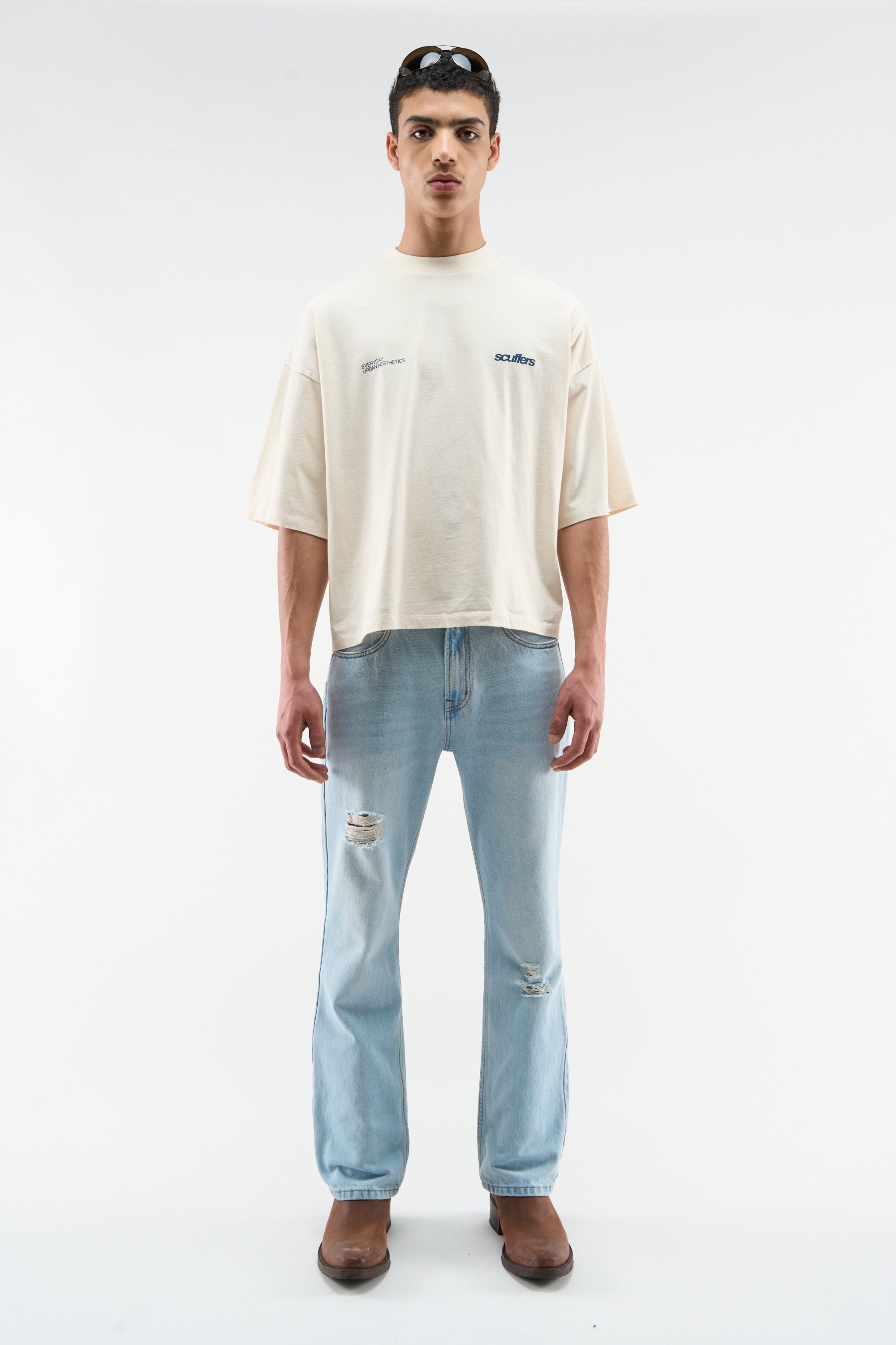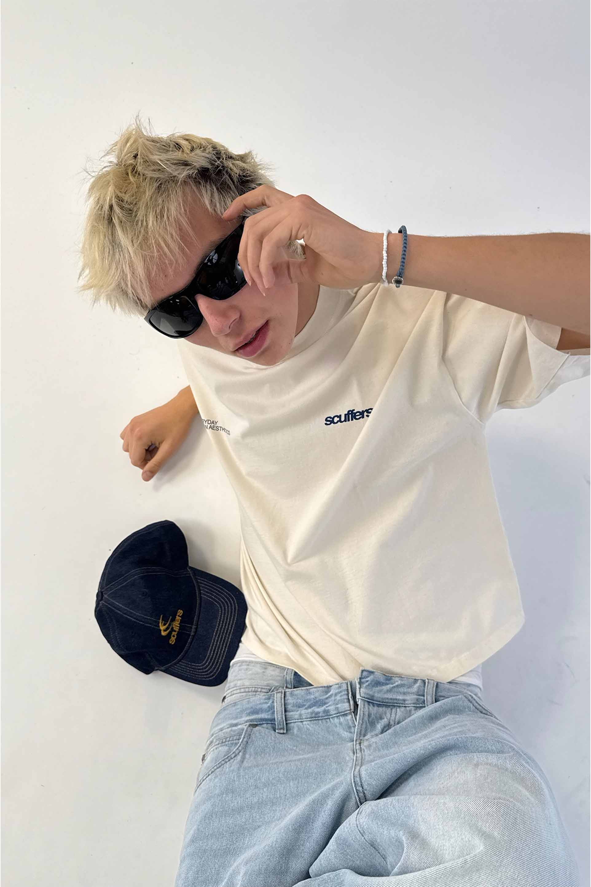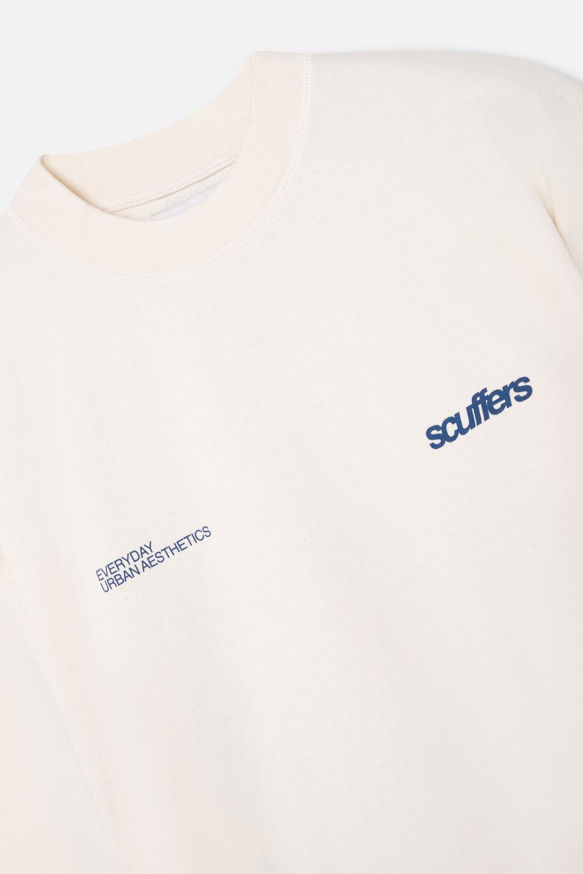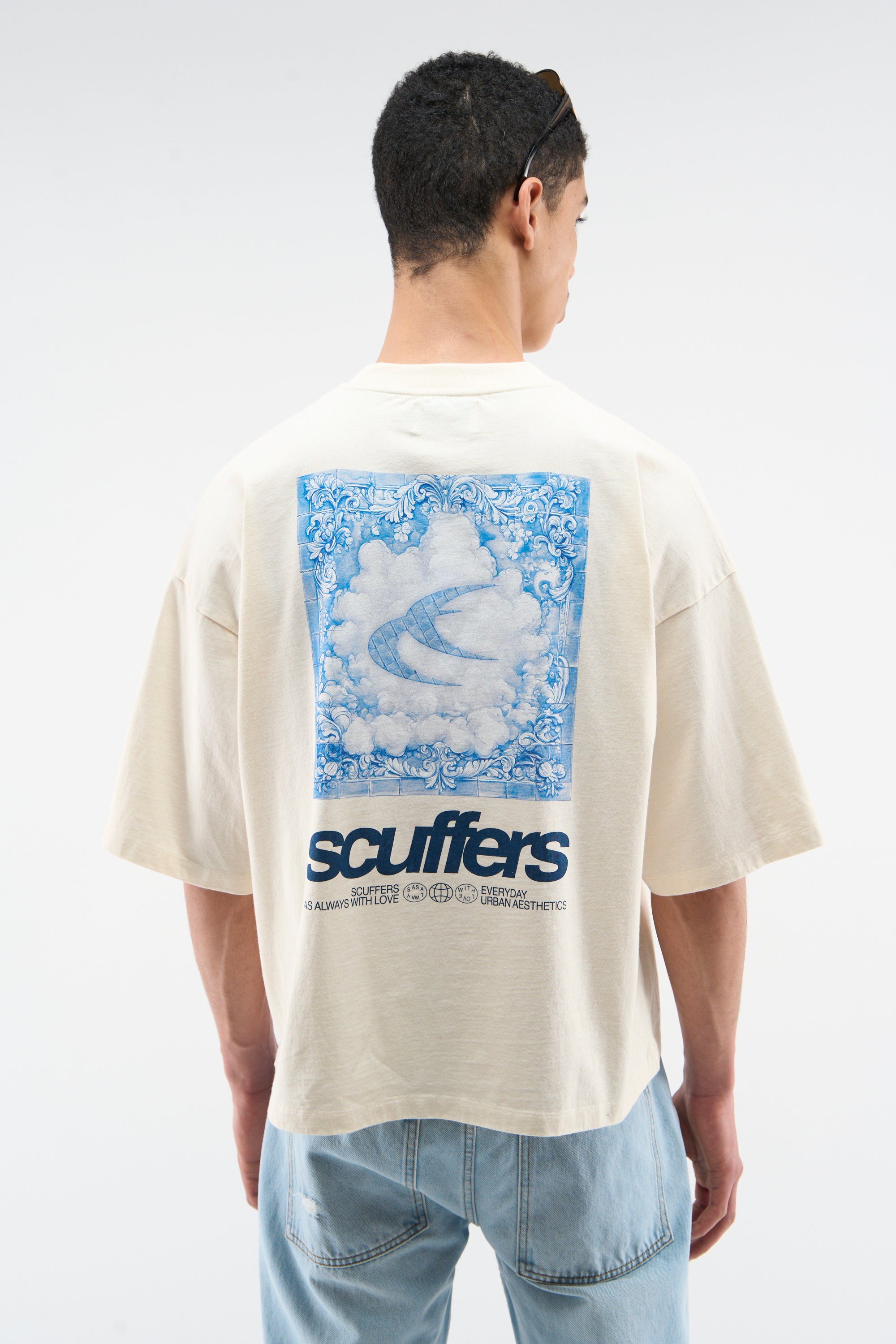 Ecru Graphic T-Shirt made from mid-weight cotton with a relaxed fit. Features small chest prints and large back graphic with baroque-inspired tile artwork and Scuffers branding. Ribbed crewneck and short sleeves.