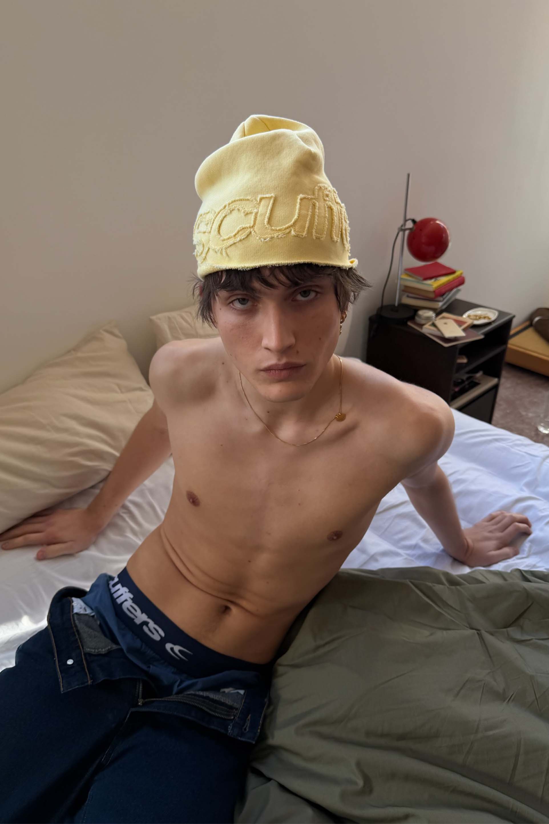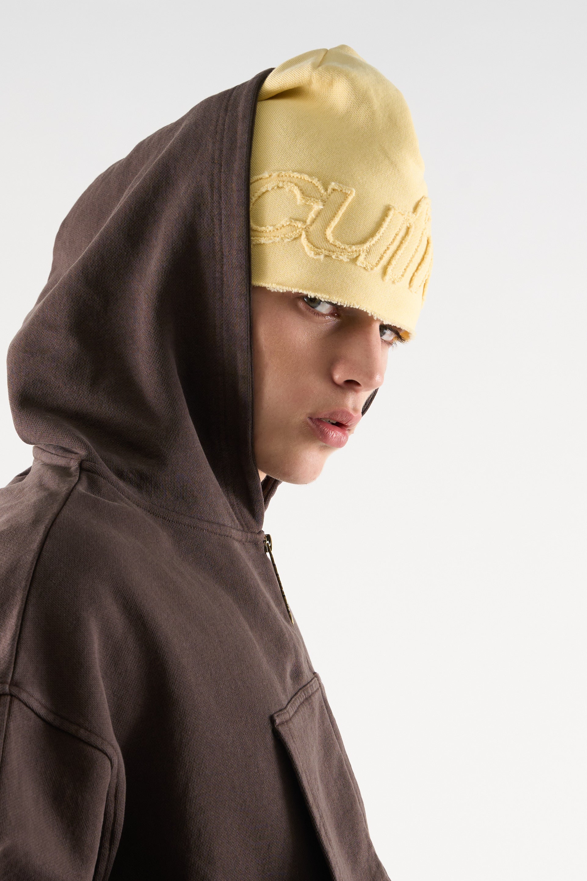 Yellow Logo Beanie – Stretch cotton knit with tonal terry-texture Scuffers logo embroidery across front. Seamless crown construction with soft finish. Lightweight and fitted shape.