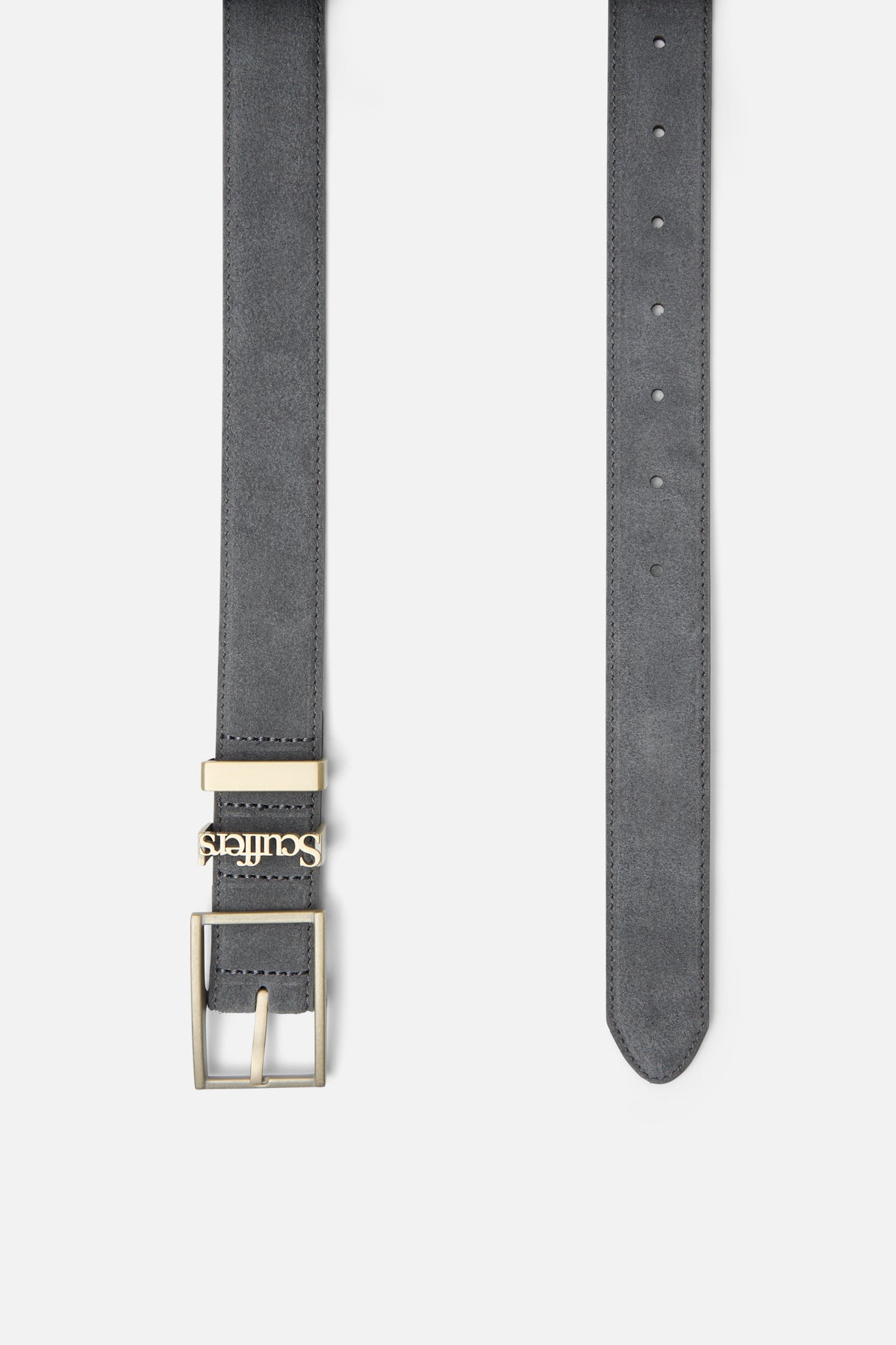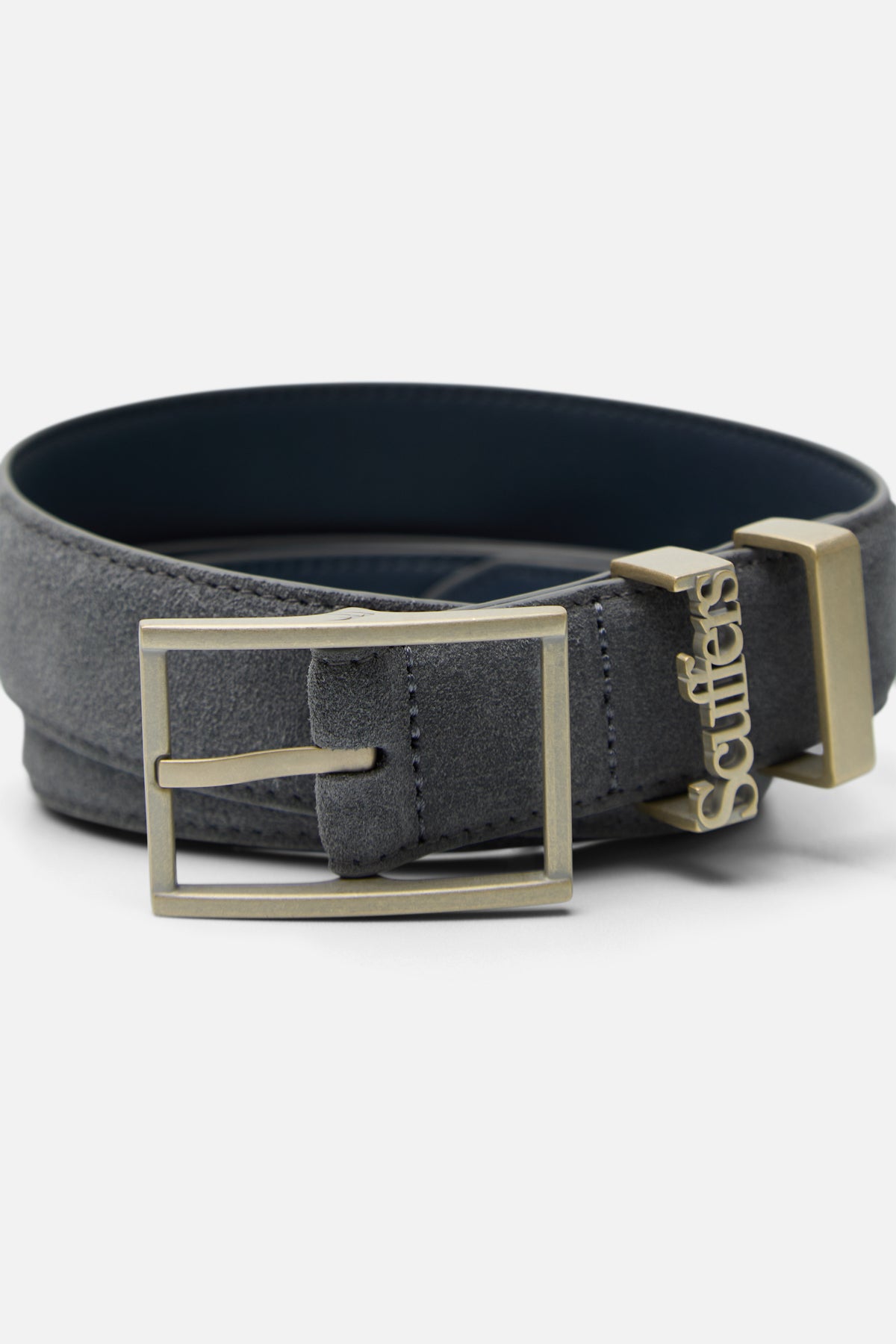 Blue suede belt with a slim profile and smooth leather backing. Designed with an adjustable fit, pointed tip, and polished gold-tone square buckle. Finished with matching metal keeper loops, including a logo detail.