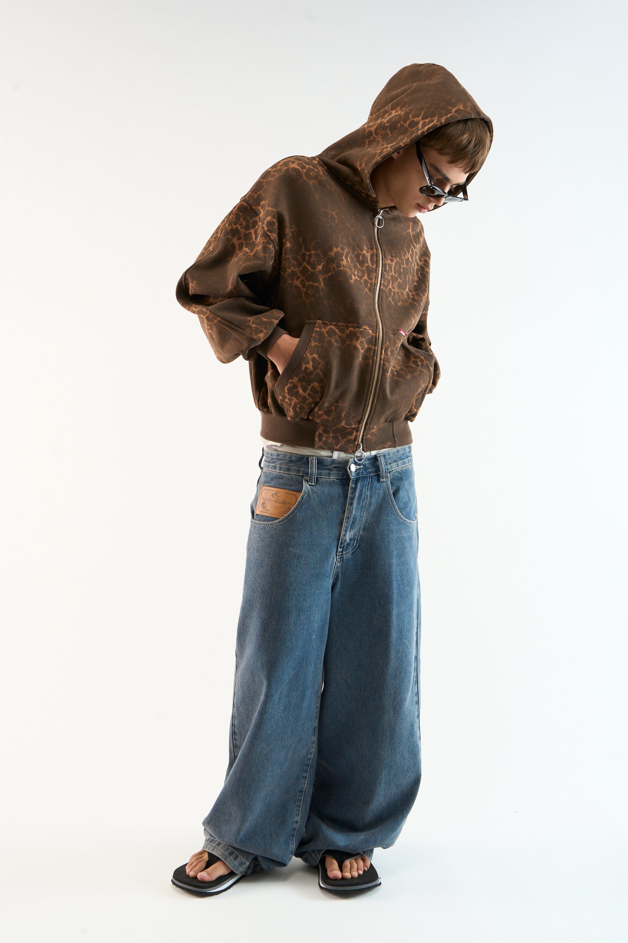 Animal Print Zip Hoodie made from heavyweight cotton fleece with an all-over brown leopard pattern. Features a relaxed fit, two-way ring zip closure, and split kangaroo pockets. Ribbed cuffs and hem with woven Scuffers label at front pocket.