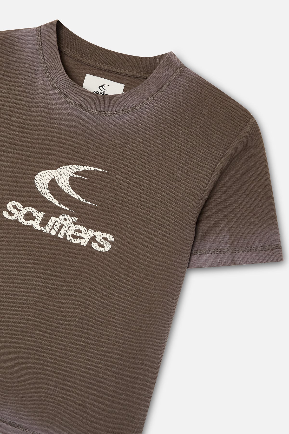 Brown Fitted T-Shirt made from stretch ribbed cotton with a cropped cut and cap sleeves. Features front contrast Scuffers logo in textured white print. Ribbed crew neckline and tonal stitching throughout.