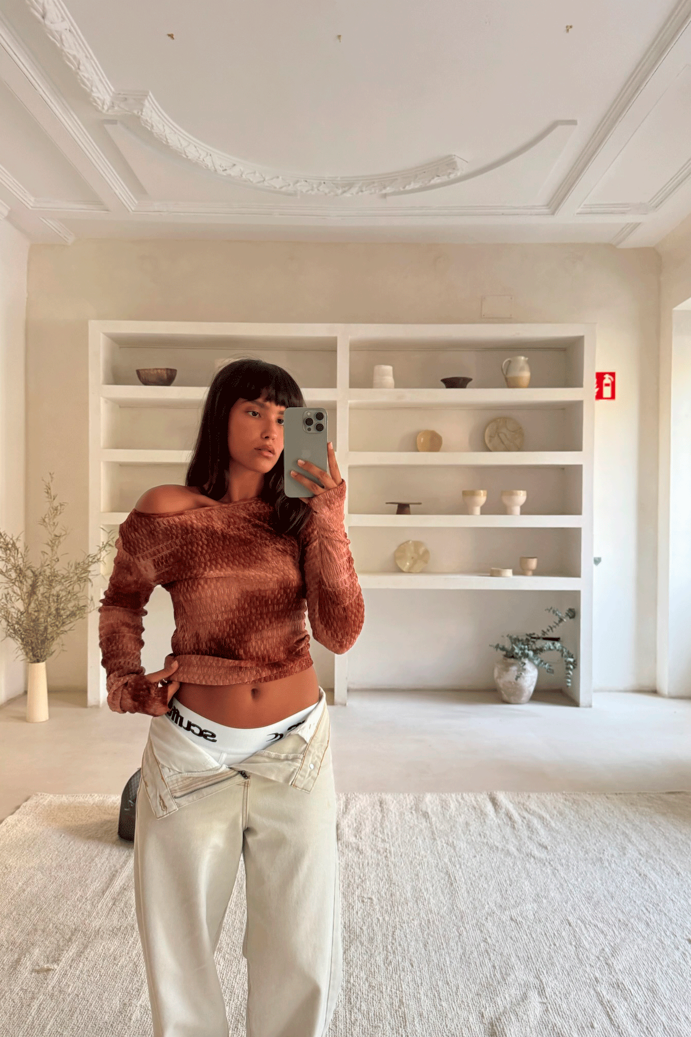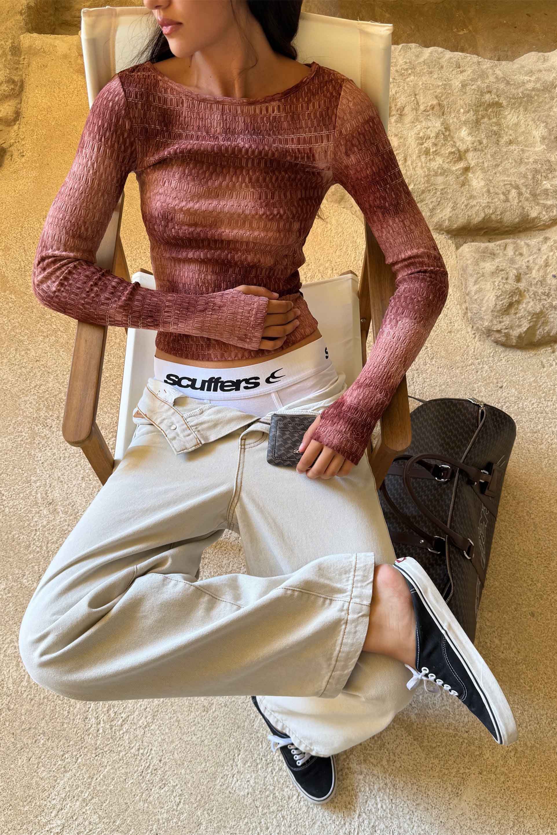 Mesh Longsleeve in stretch mesh with tonal all-over geometric print and pink tie-dye wash. Slim fit with crew neckline and straight hem. Small Scuffers logo detail at sleeve cuff.