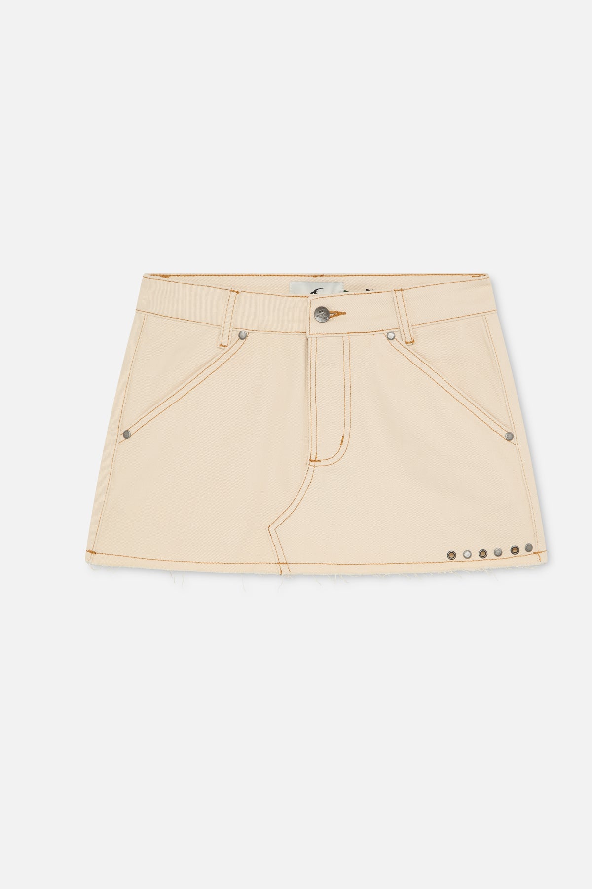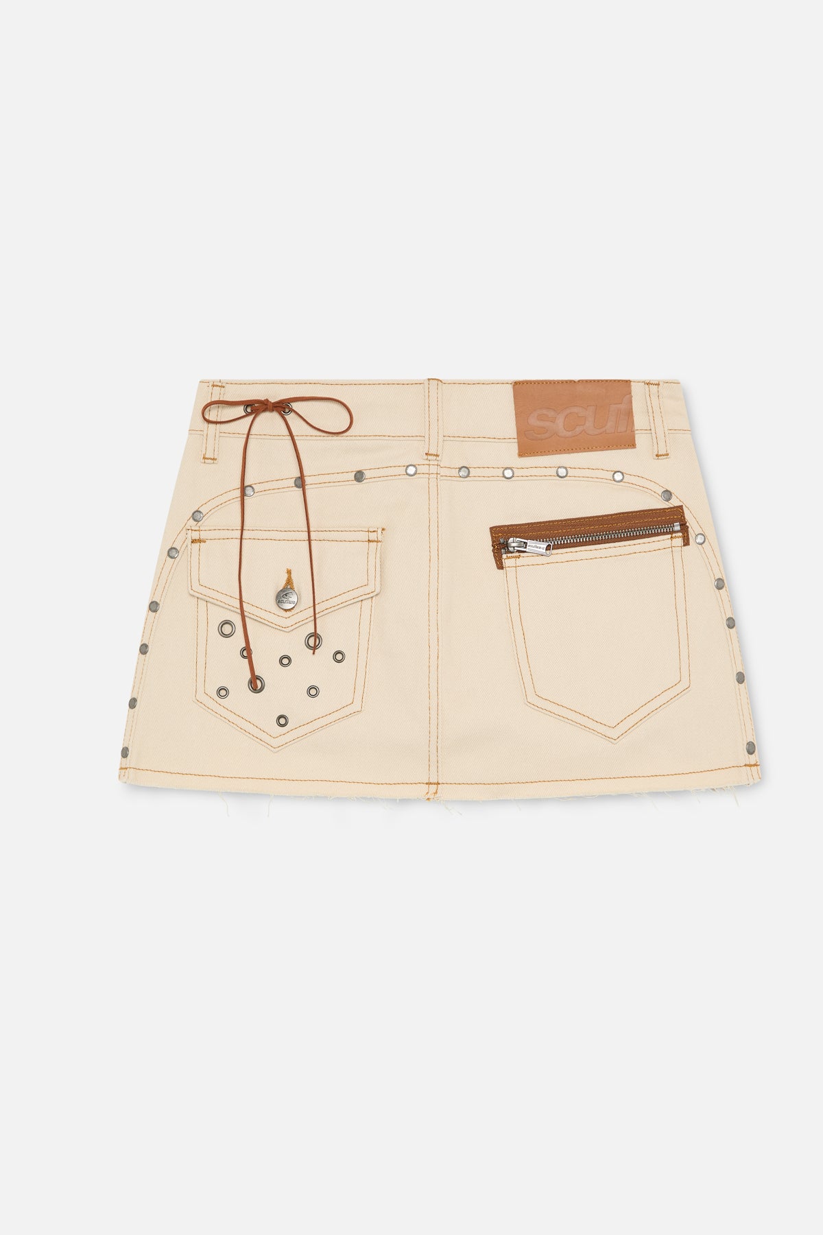 Cream denim mini skirt with a structured fit and contrast stitching. Designed with belt loops, angled front pockets, and a raw hem. Finished with metal rivet detailing, a decorative back tie, mixed back pockets including a zip pocket, and a branded leather patch.