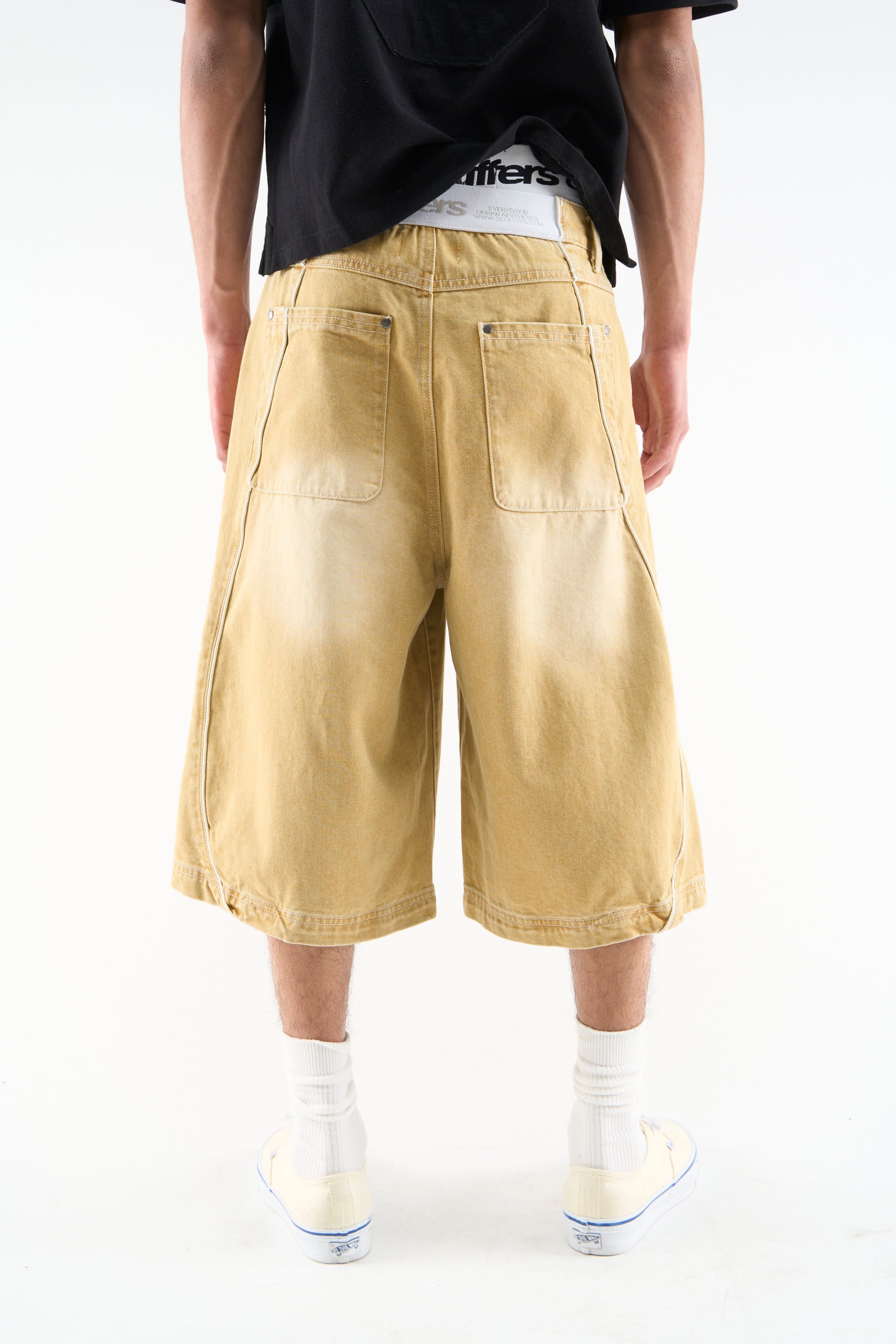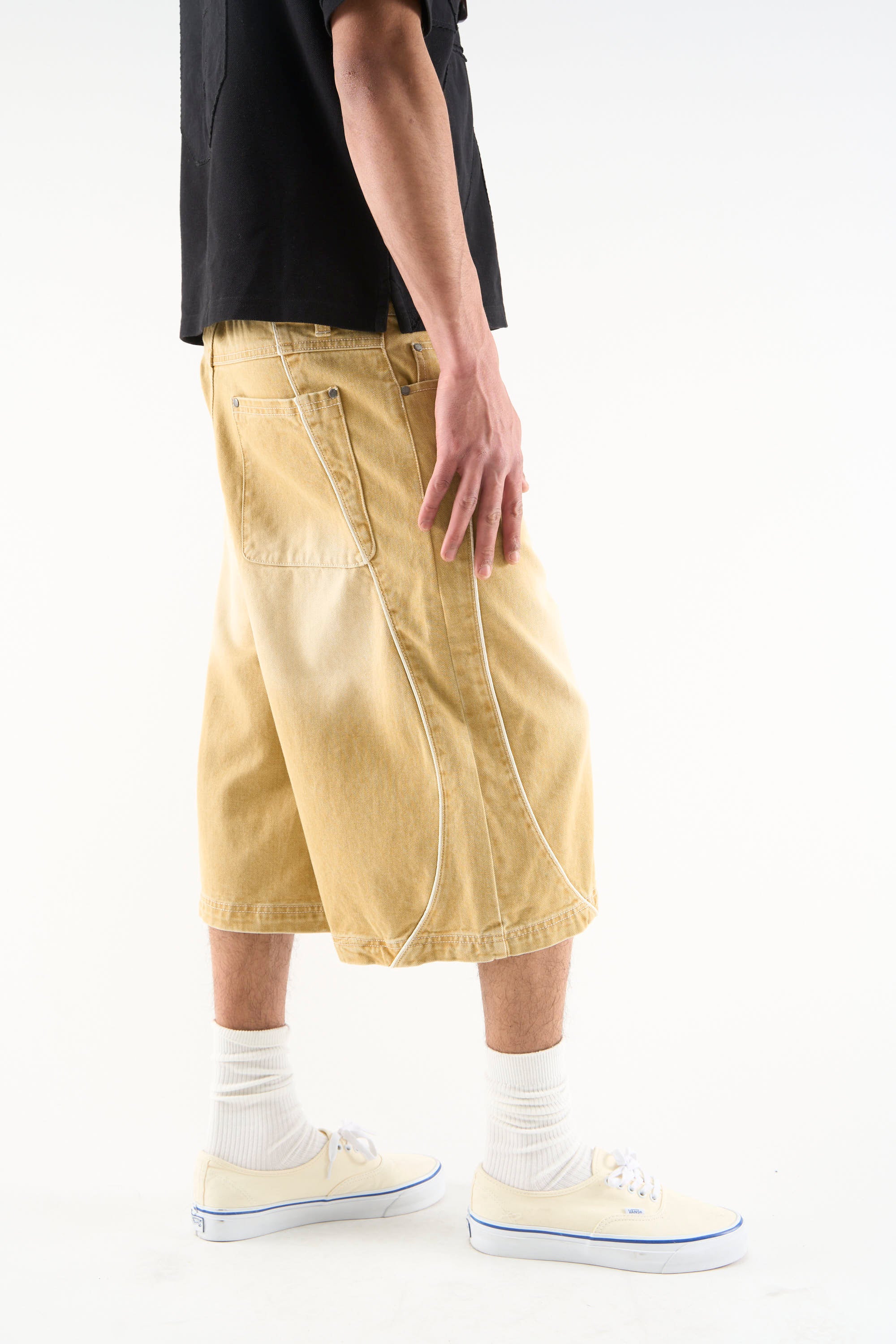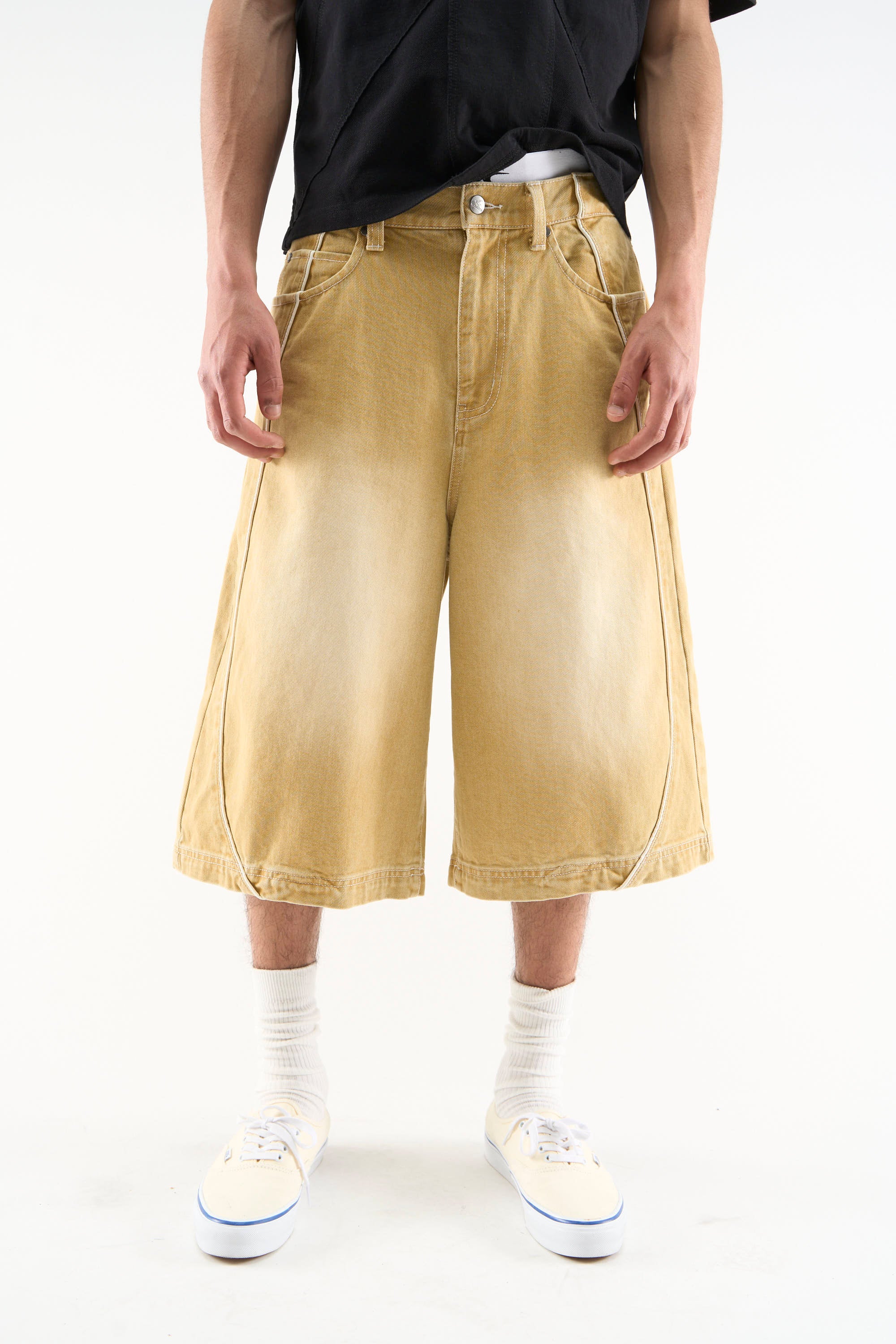Mustard denim shorts with a long wide-leg fit and faded wash finish. Designed with a classic five-pocket construction, belt loops, and button closure. Finished with contrast piping, curved panel detailing, and a branded back patch.