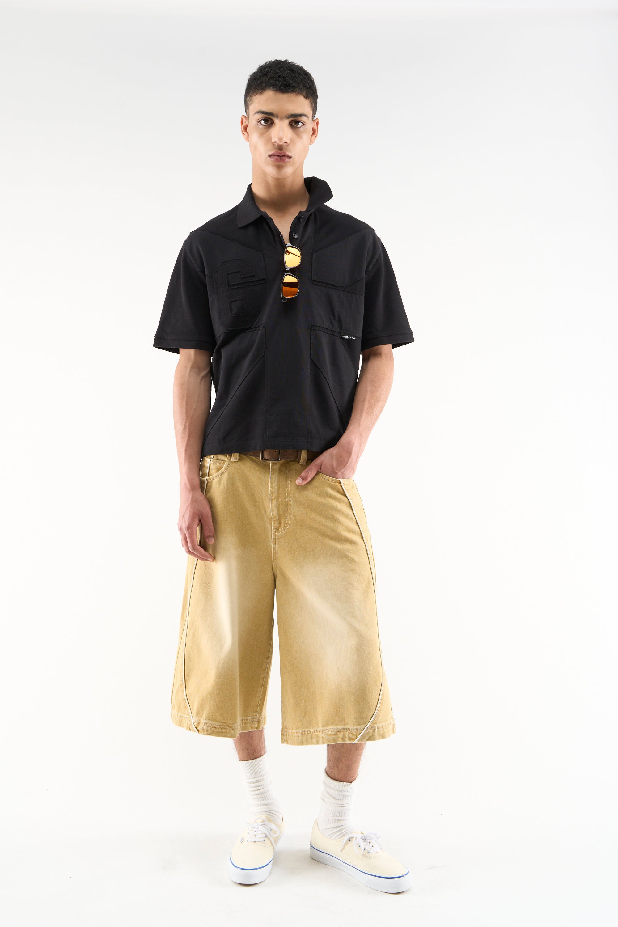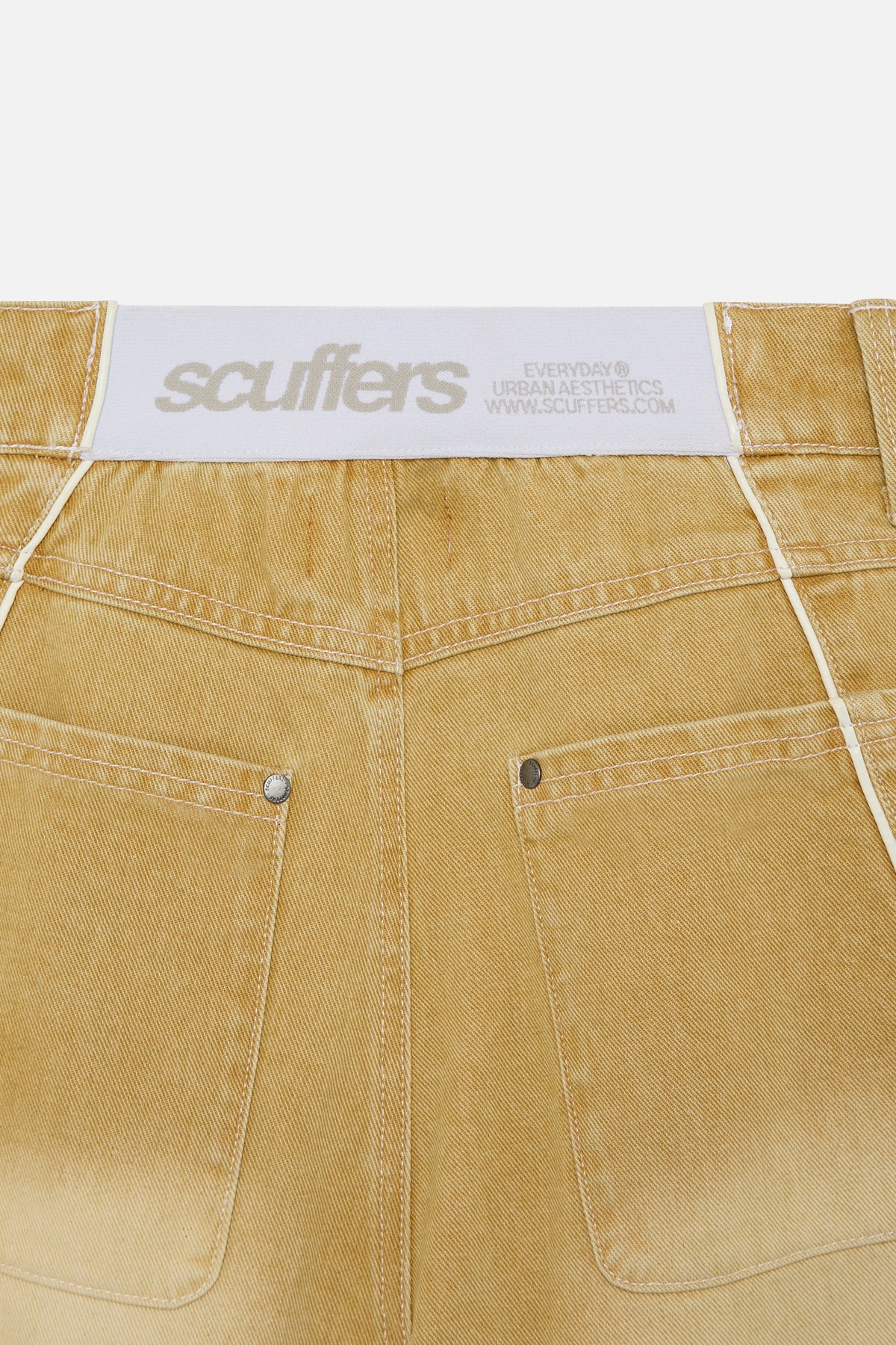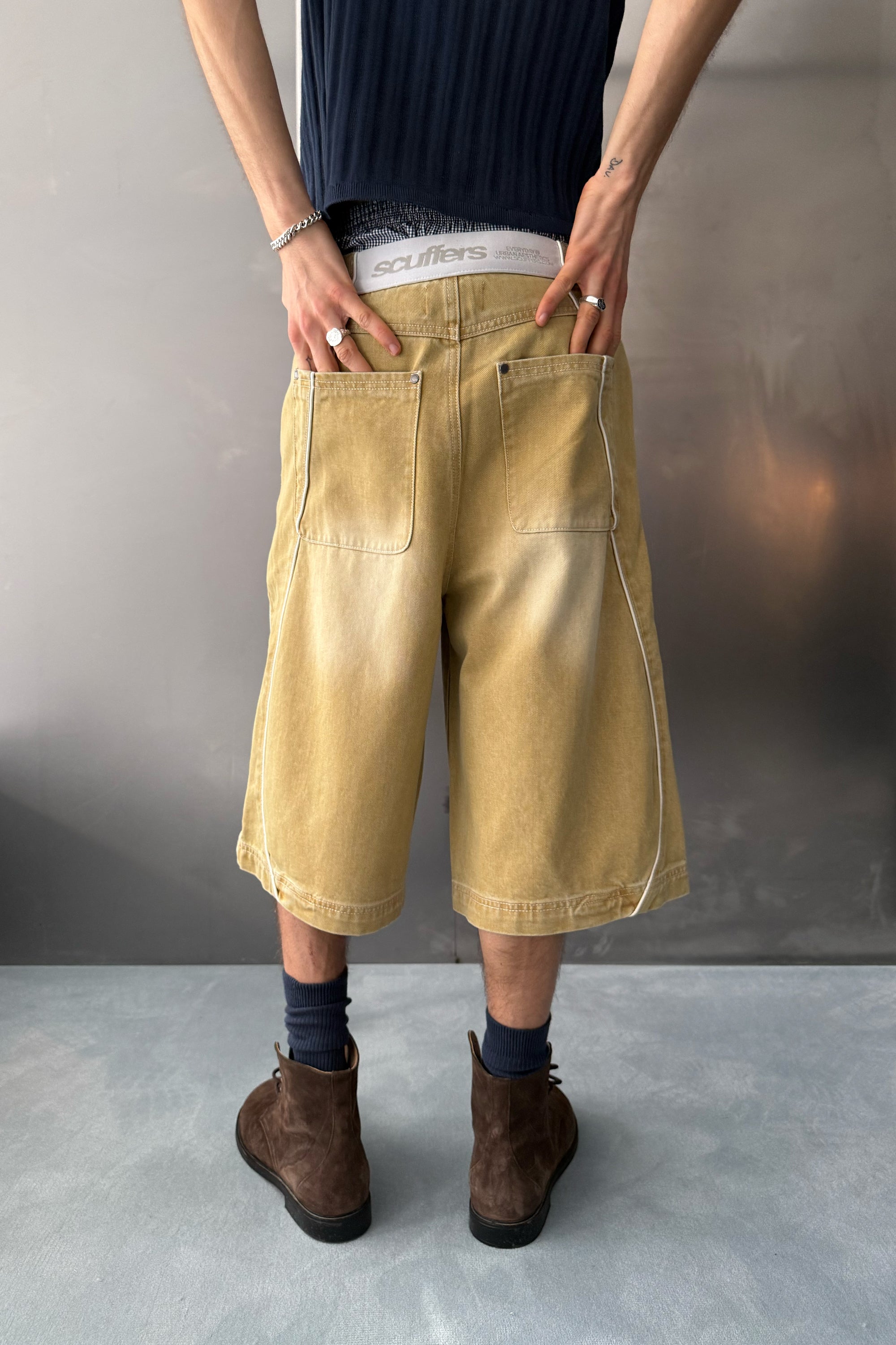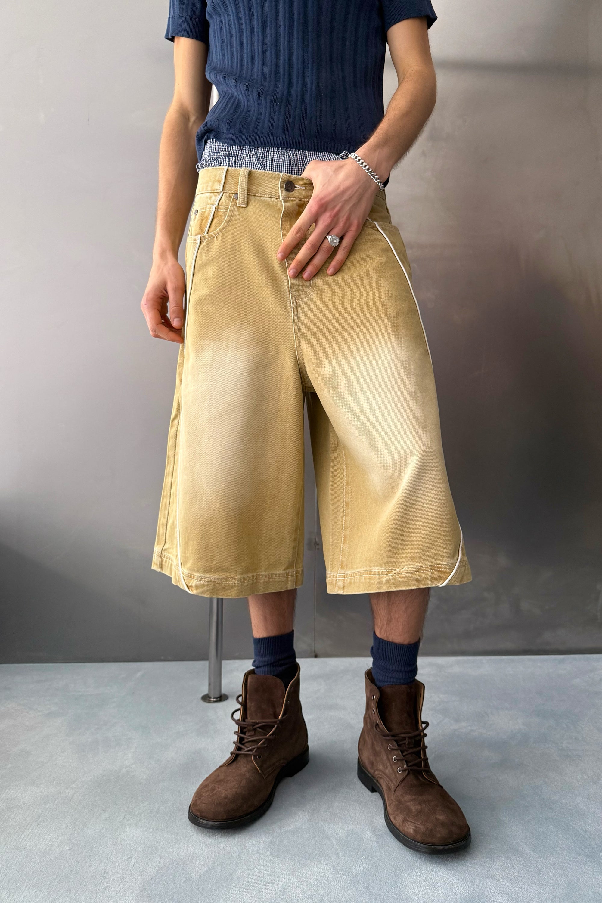 Mustard denim shorts with a long wide-leg fit and faded wash finish. Designed with a classic five-pocket construction, belt loops, and button closure. Finished with contrast piping, curved panel detailing, and a branded back patch.