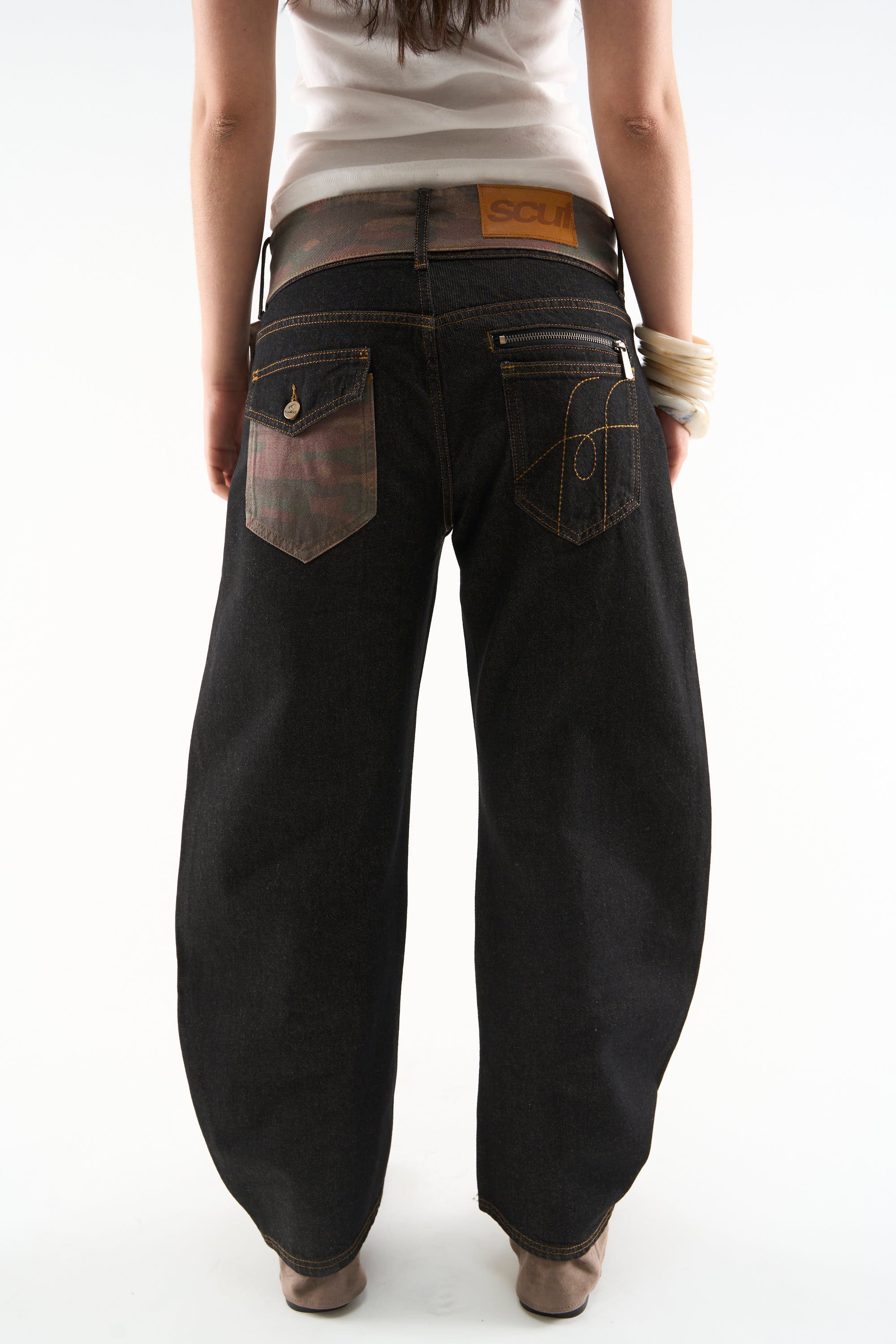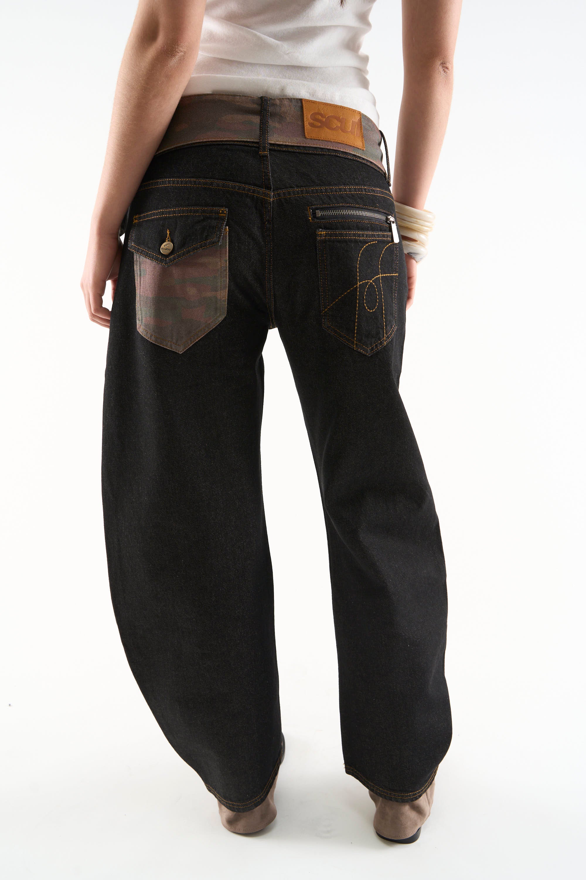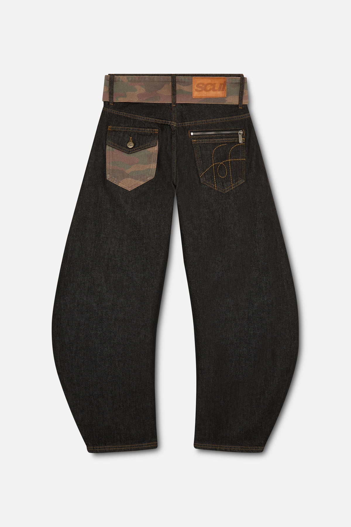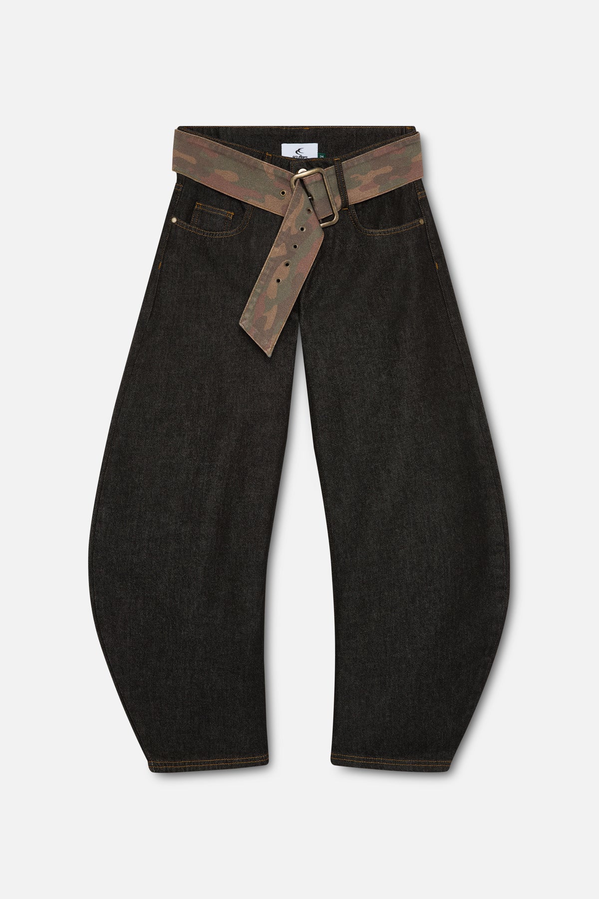Dark brown wash balloon jeans with a relaxed wide-leg shape and structured curved silhouette. Designed with a classic five-pocket construction and contrast stitching. Finished with a removable camo belt, mixed back pockets including a zip pocket, and a branded leather patch.