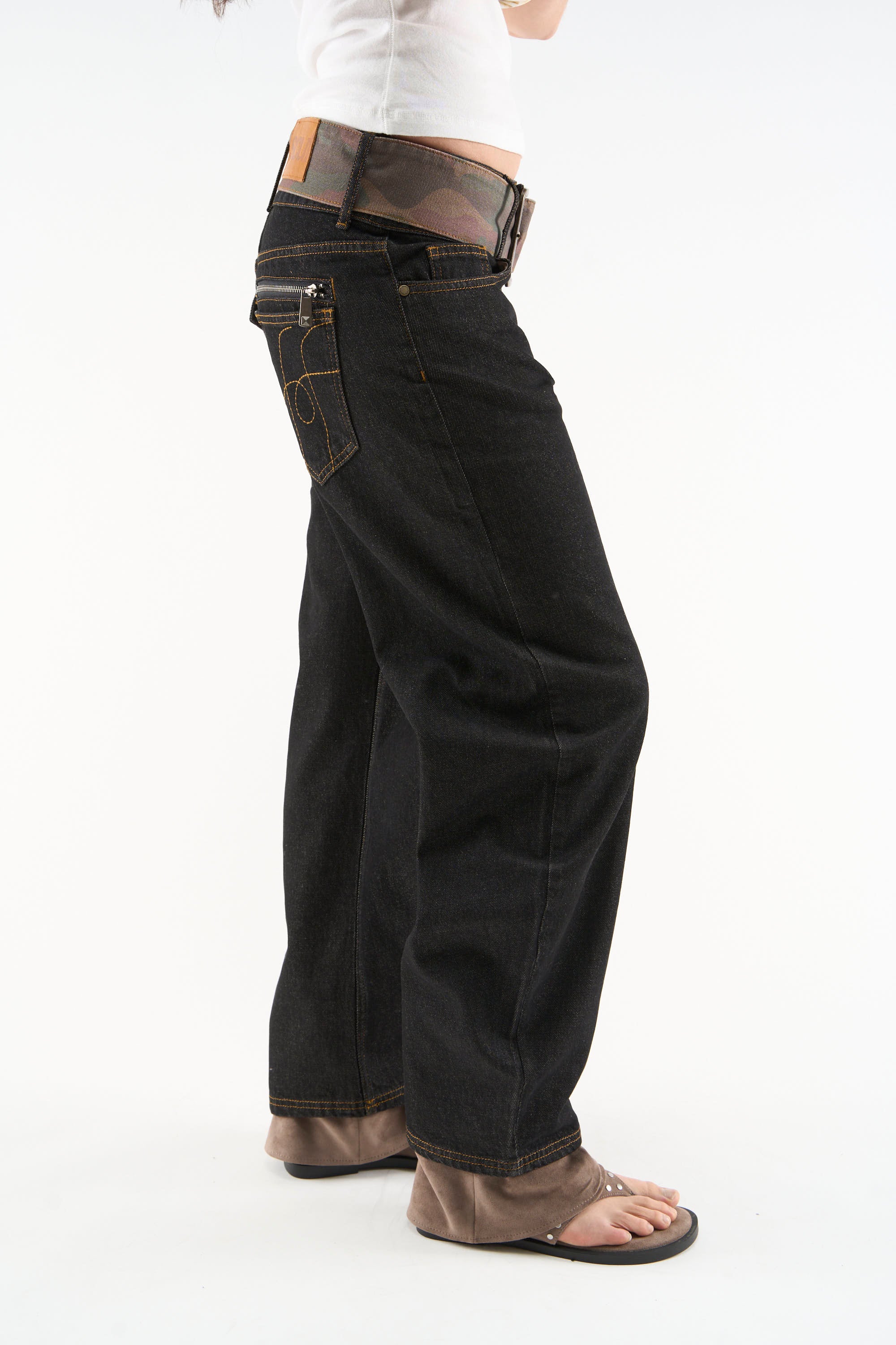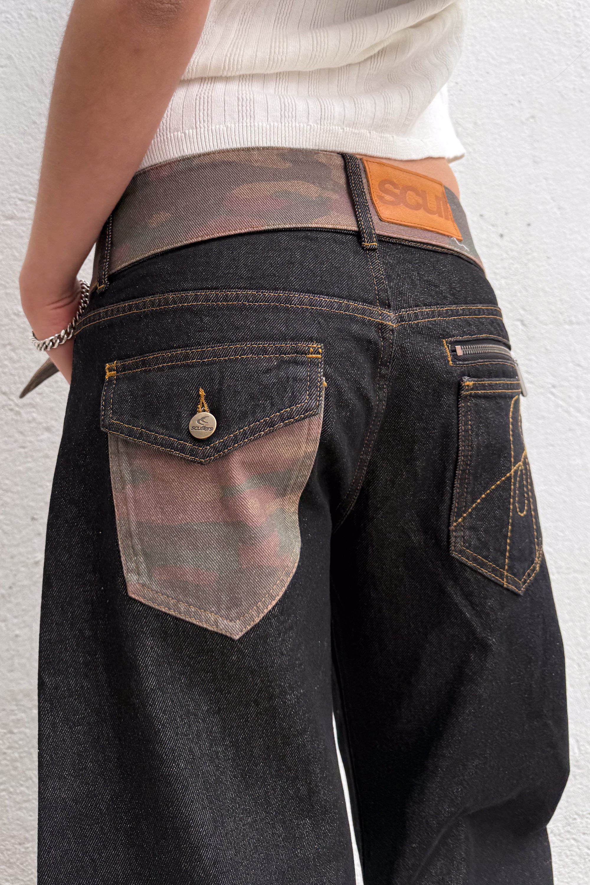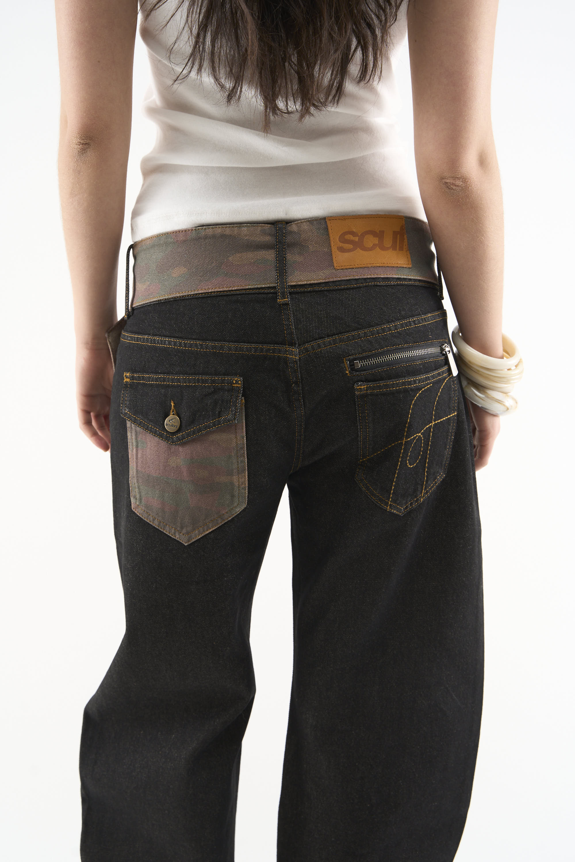 Dark brown wash balloon jeans with a relaxed wide-leg shape and structured curved silhouette. Designed with a classic five-pocket construction and contrast stitching. Finished with a removable camo belt, mixed back pockets including a zip pocket, and a branded leather patch.