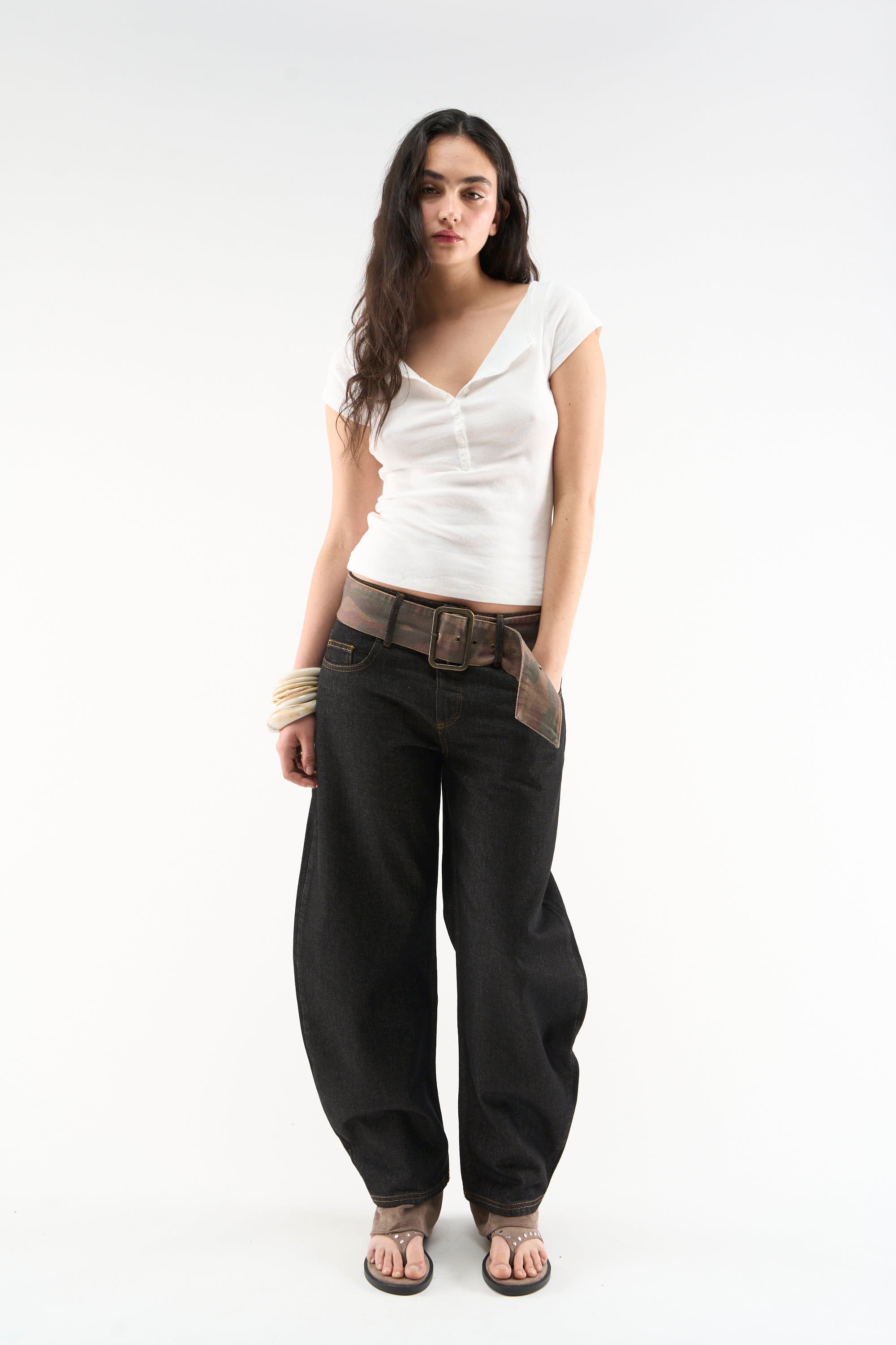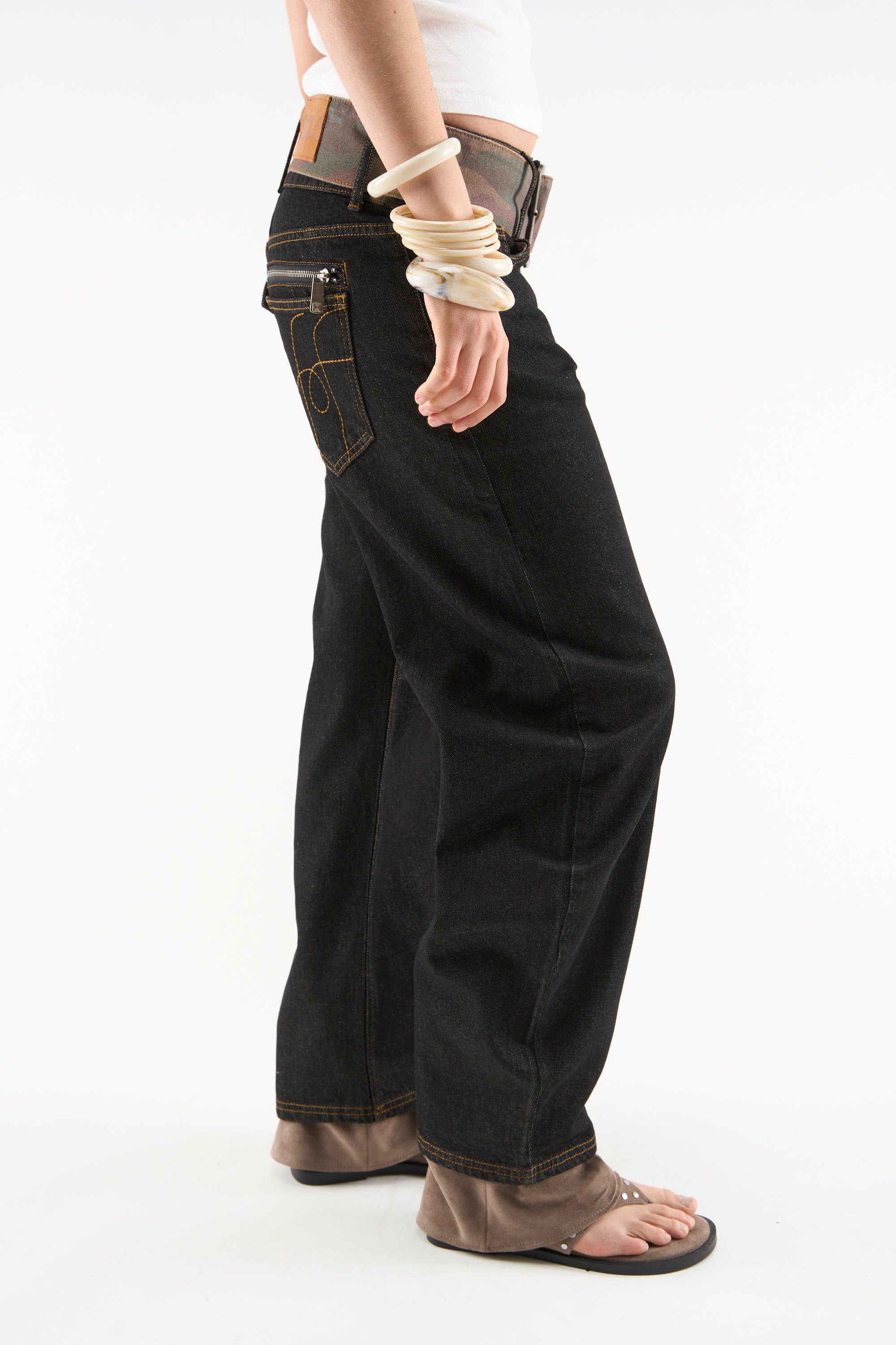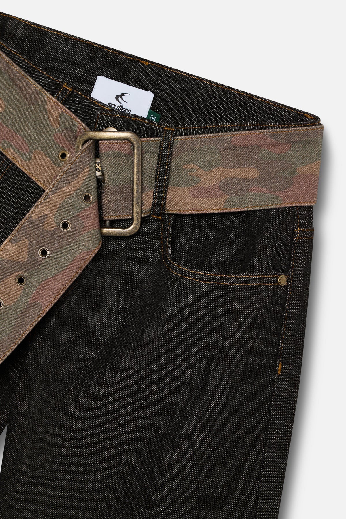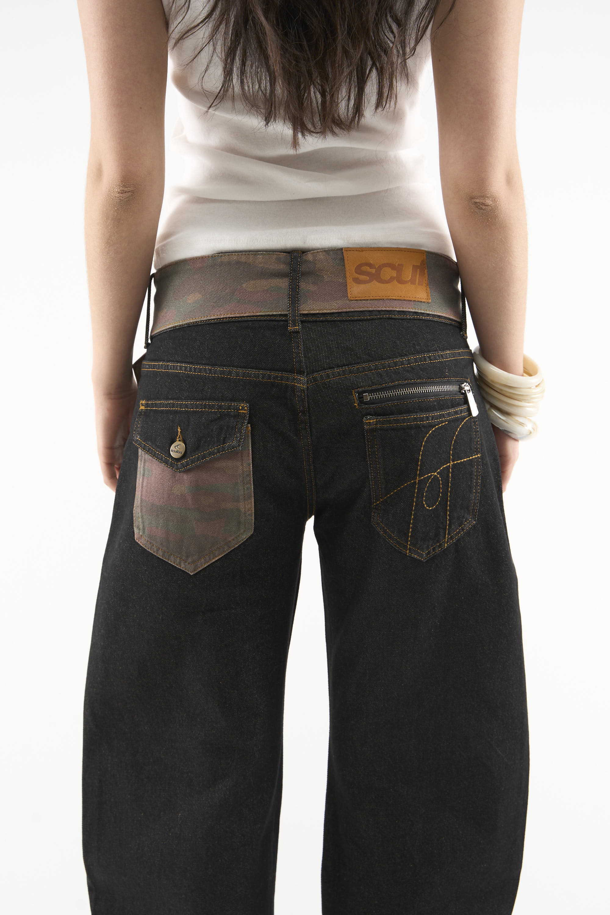 Dark brown wash balloon jeans with a relaxed wide-leg shape and structured curved silhouette. Designed with a classic five-pocket construction and contrast stitching. Finished with a removable camo belt, mixed back pockets including a zip pocket, and a branded leather patch.