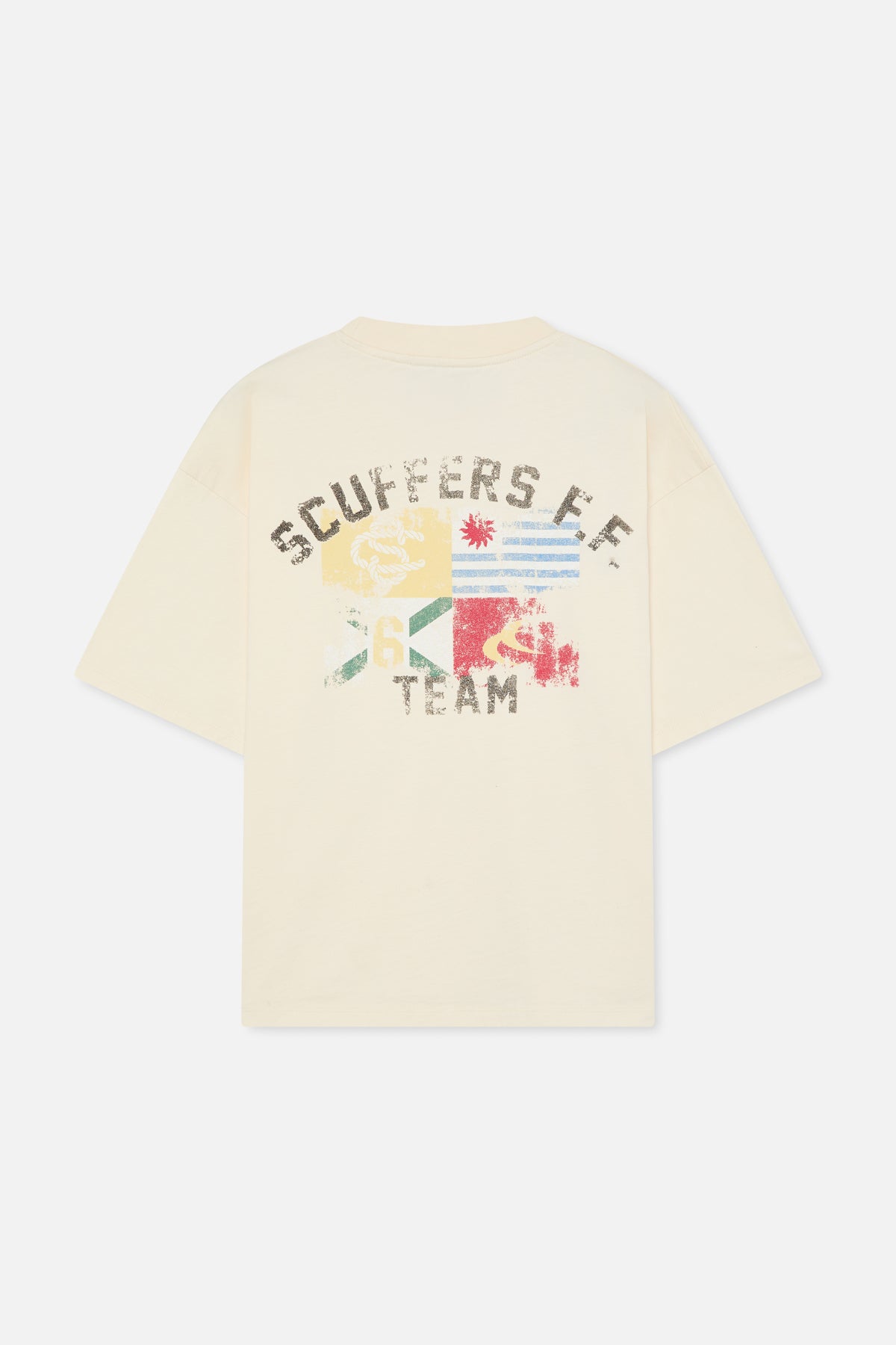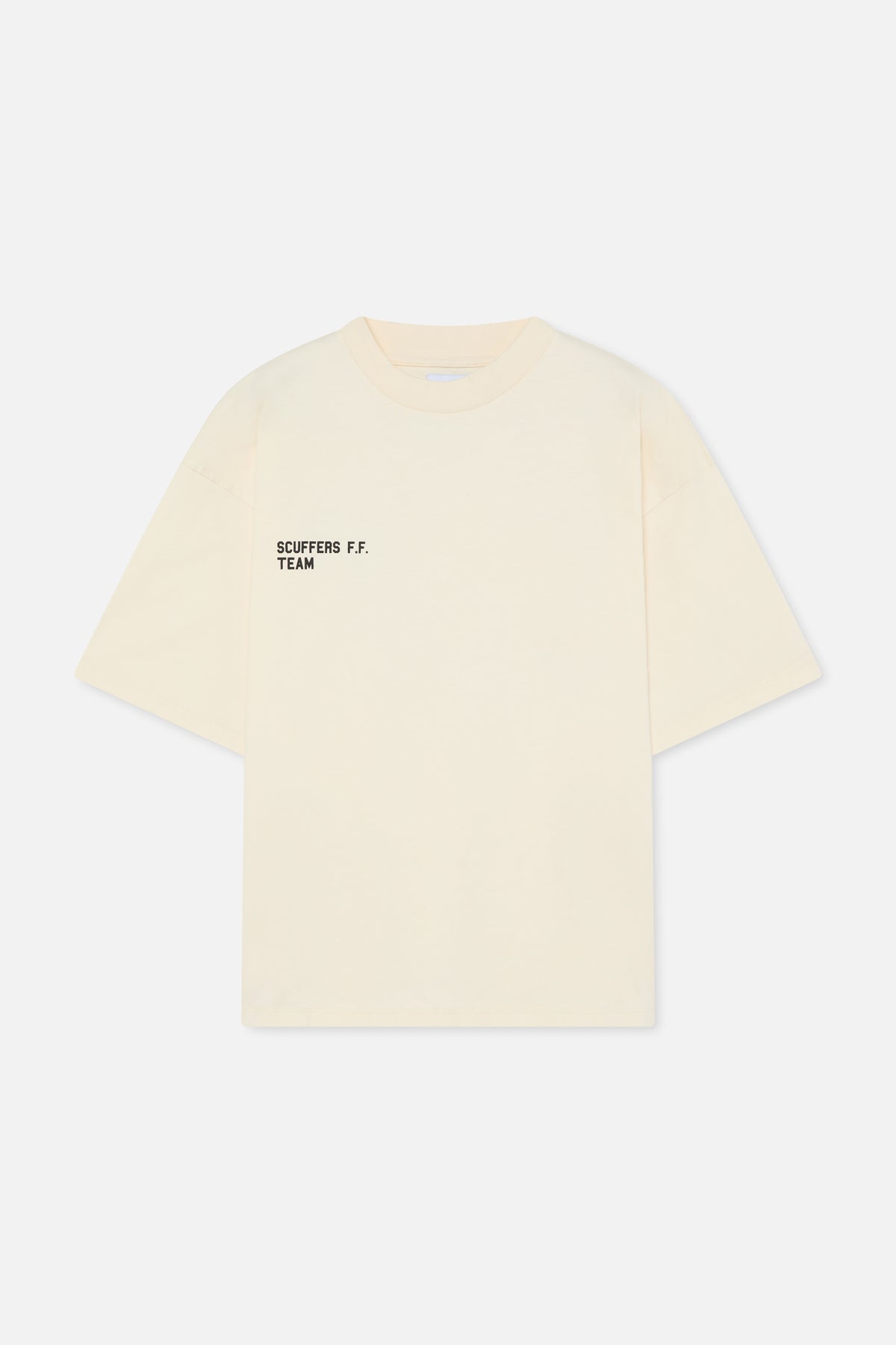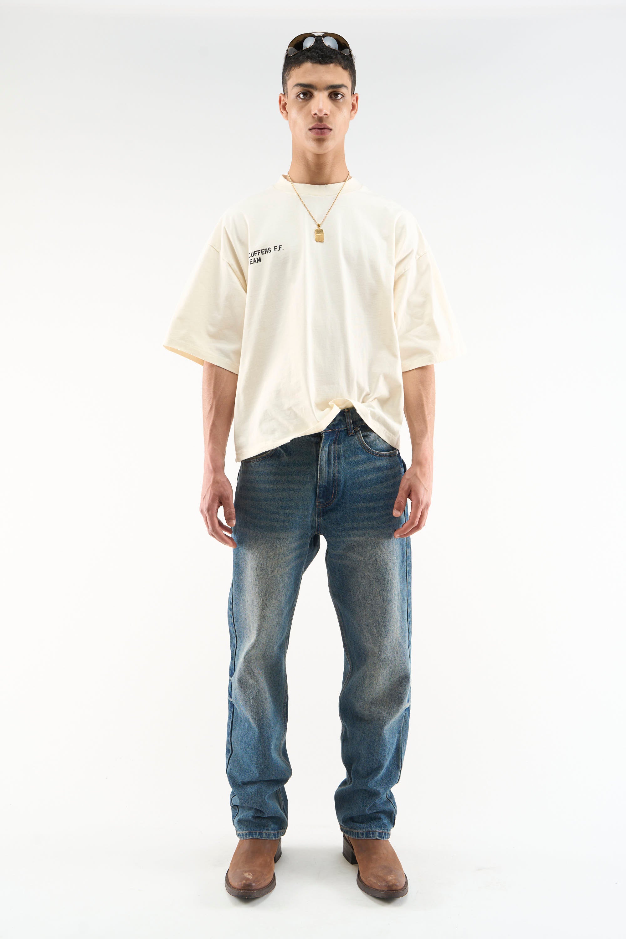 Cream oversized T-shirt with a clean front and short sleeves. Designed with a classic crew neck and relaxed fit. Finished with a small chest print and a large distressed graphic print on the back.