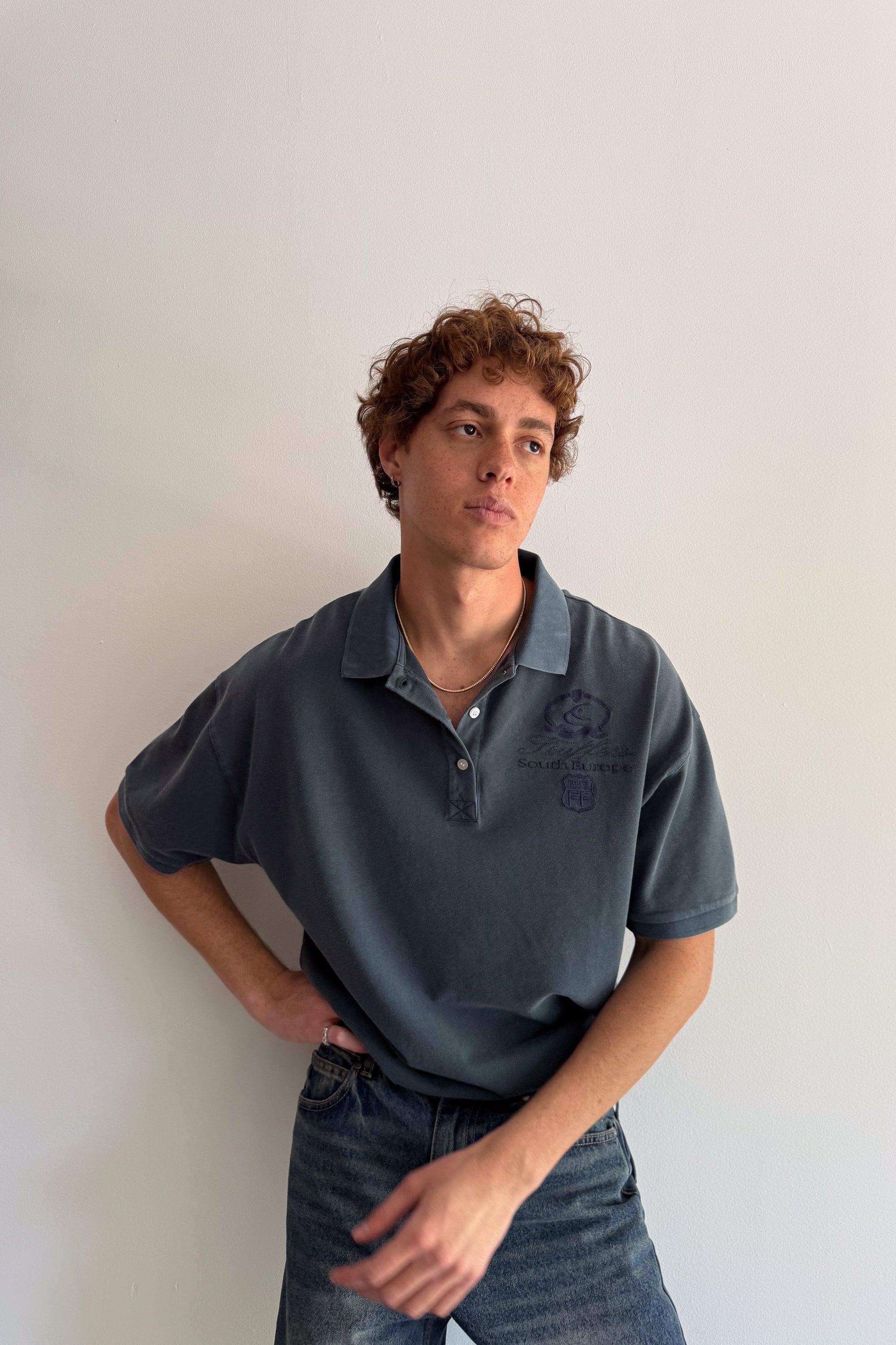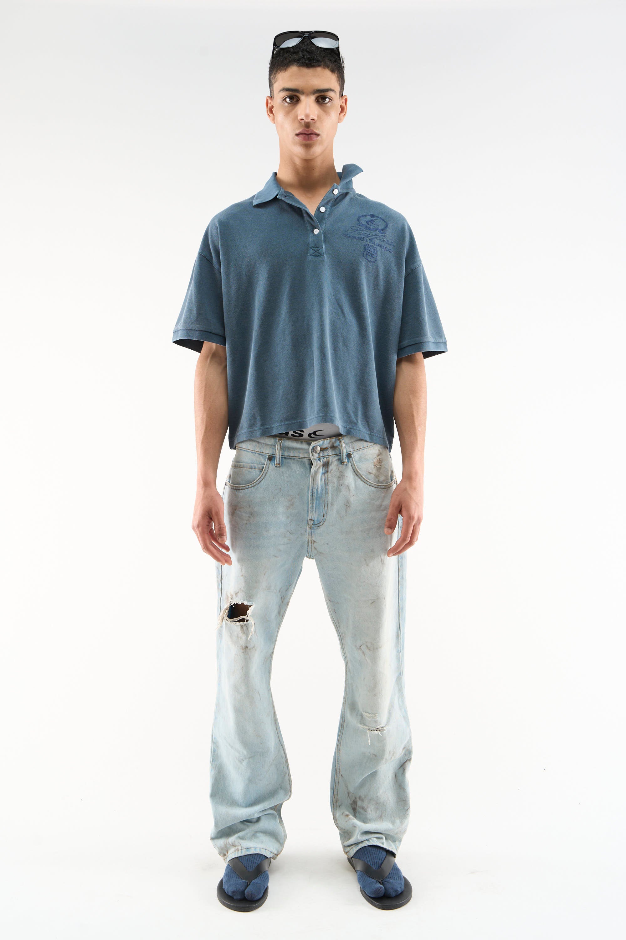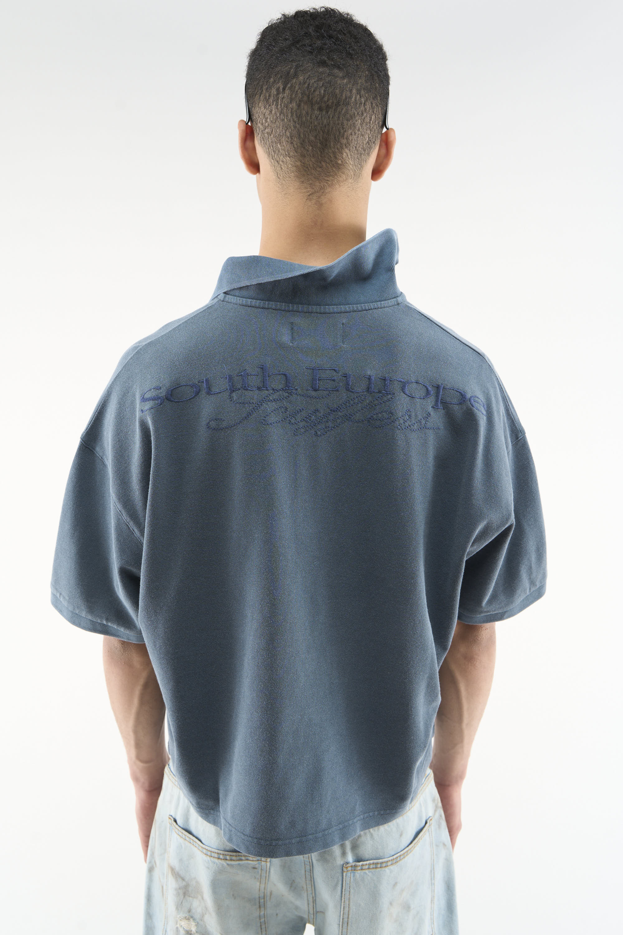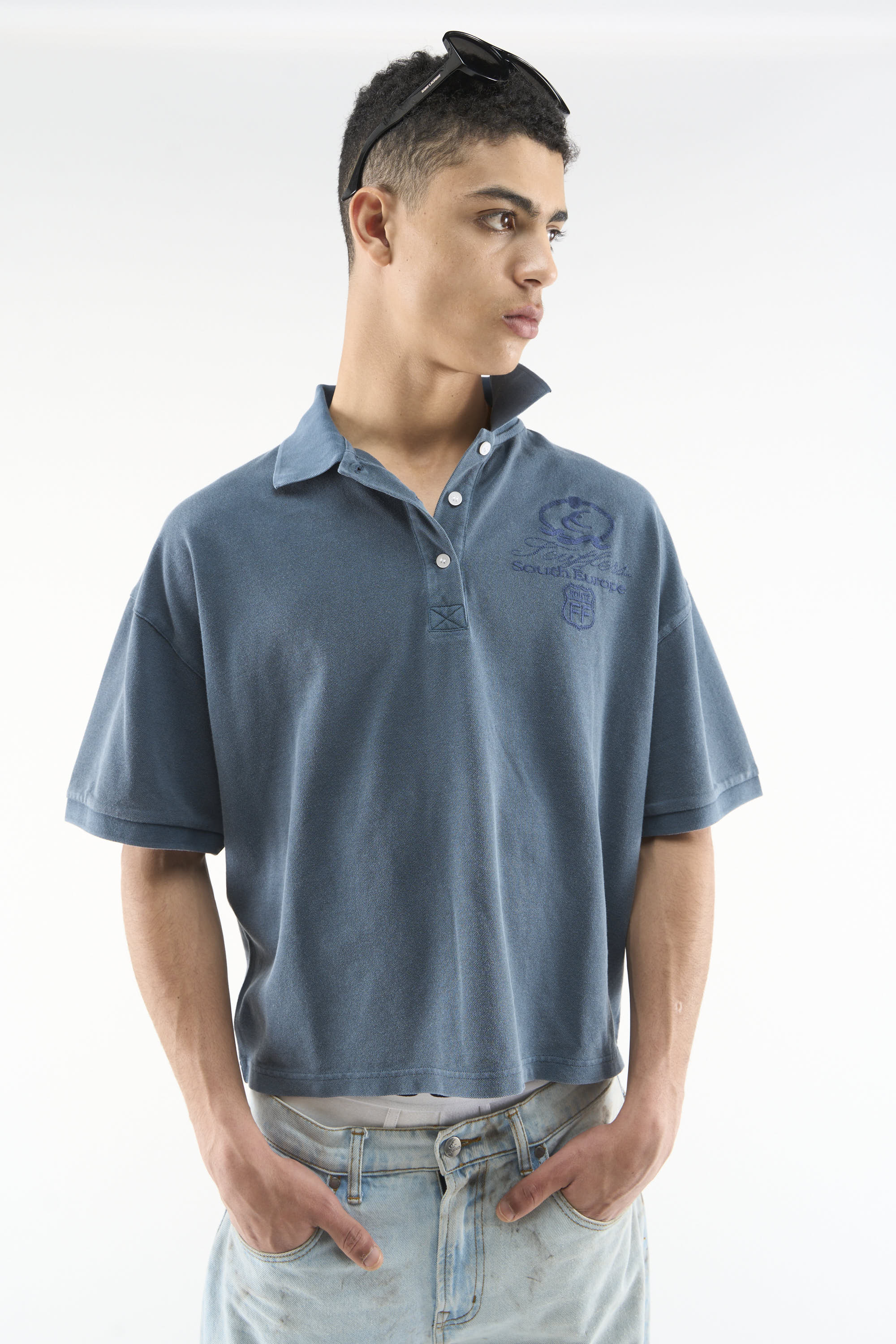 Blue washed polo shirt with a relaxed fit and short sleeves. Designed with a classic collar, three-button placket, and textured piqué finish. Finished with tonal embroidered graphics on the chest and oversized embroidery across the back.