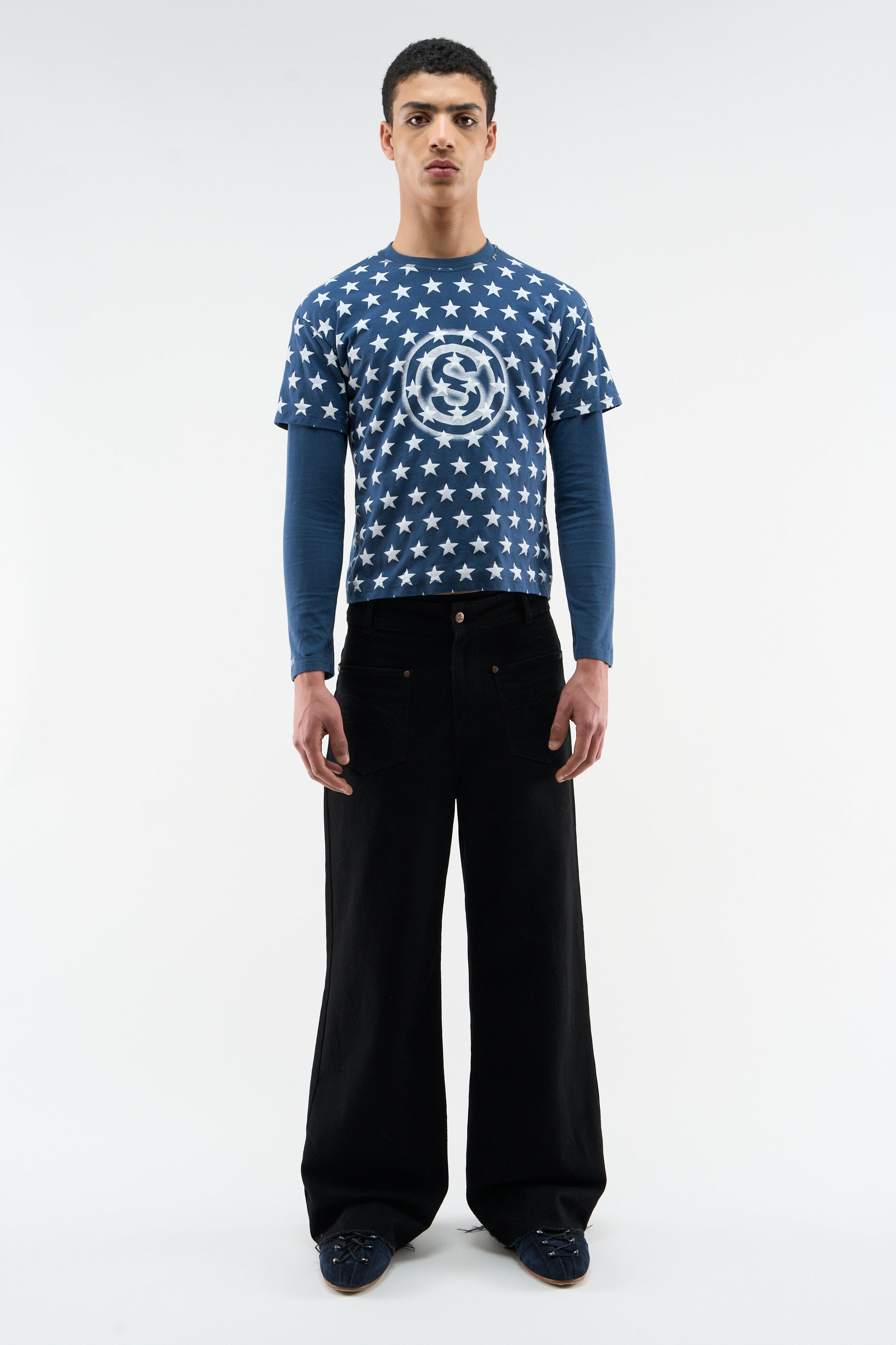 ネイビーのスタープリントレイヤードロングスリーブ。ソフトなコットンジャージー素材。フィッテッドフィットにクルーネック、ダブルレイヤー構造:スタープリントの半袖トップの下にソリッドのロングスリーブ。チェストに大きなスプレー加工の"S"ロゴグラフィック、カフに小さなScuffersプリント。 コットン 100% 女性モデル着用サイズXS - 身長166cm 男性モデル着用サイズM - 身長187cm