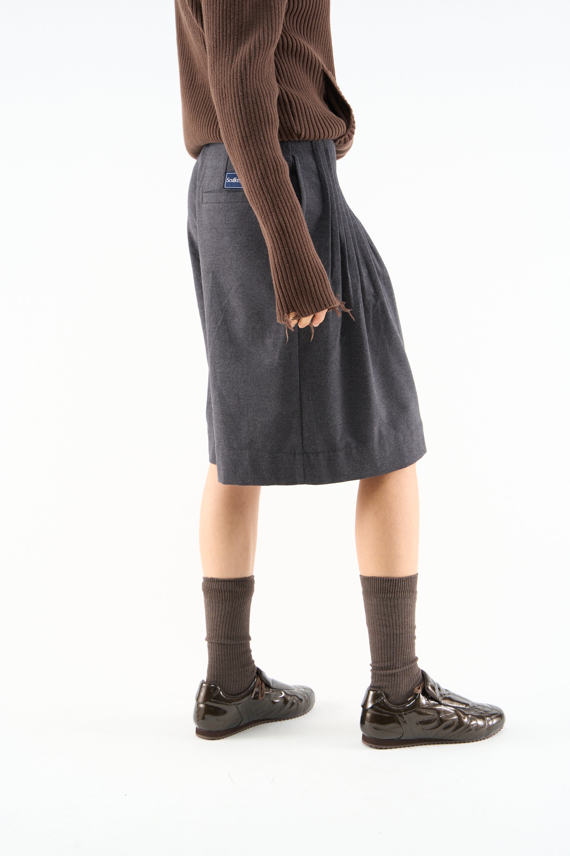 Pleated shorts in a dark grey color, featuring a relaxed fit with subtle pleats along the waistband for a tailored look. The back is designed with a small label near the pocket.