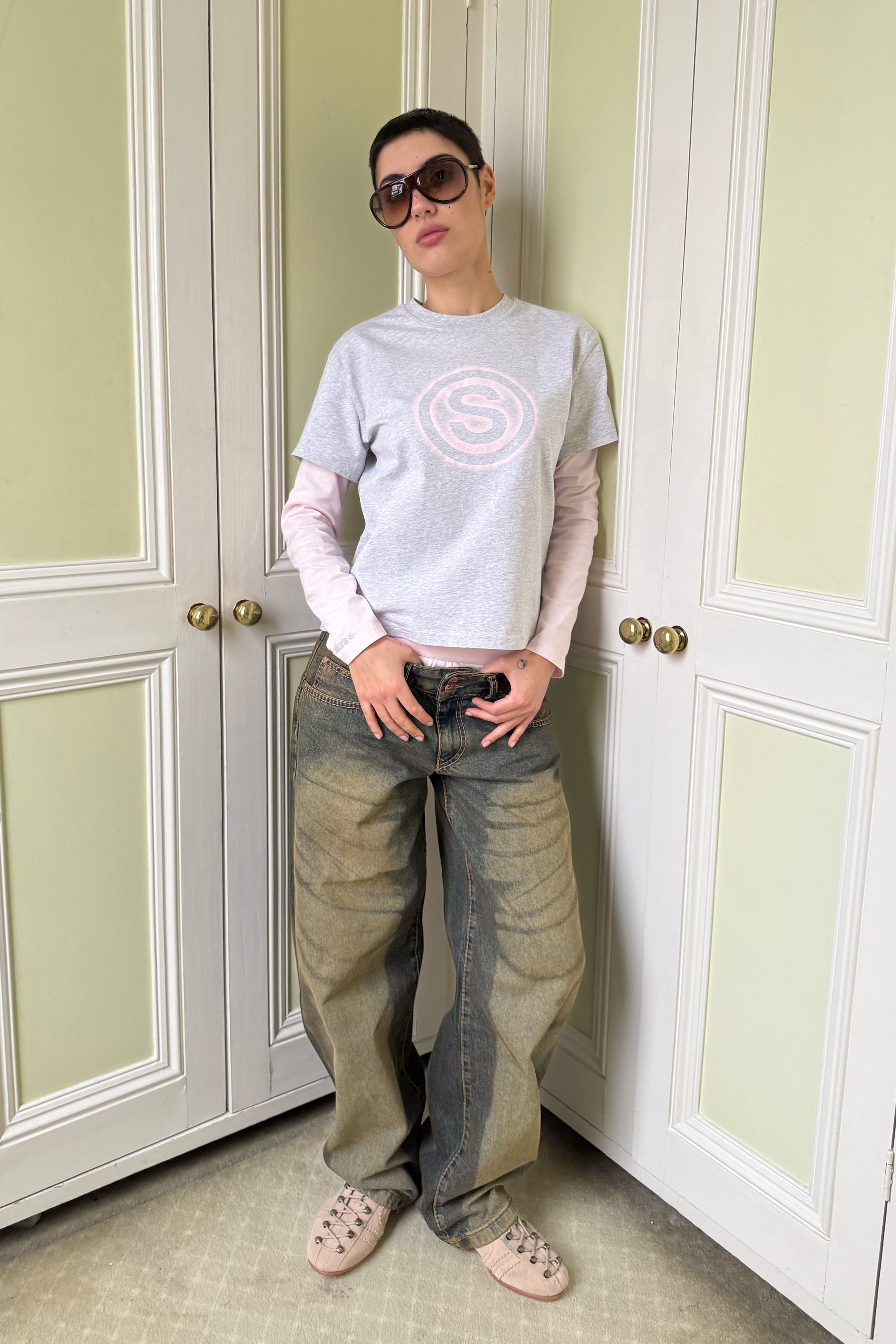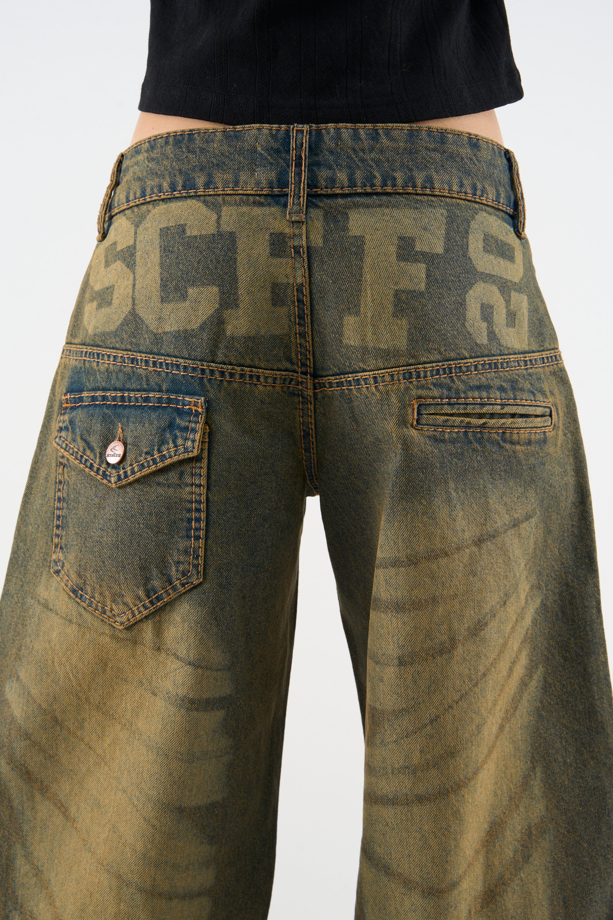 Dark Wash Balloon Jeans in heavy denim with a vintage fade finish. Low-rise waist with double-button closure and belt loops. Relaxed, curved leg with tapered hem for a balloon fit. Five-pocket construction with contrast stitching, branded hardware, and large “SCFFS” back graphic.