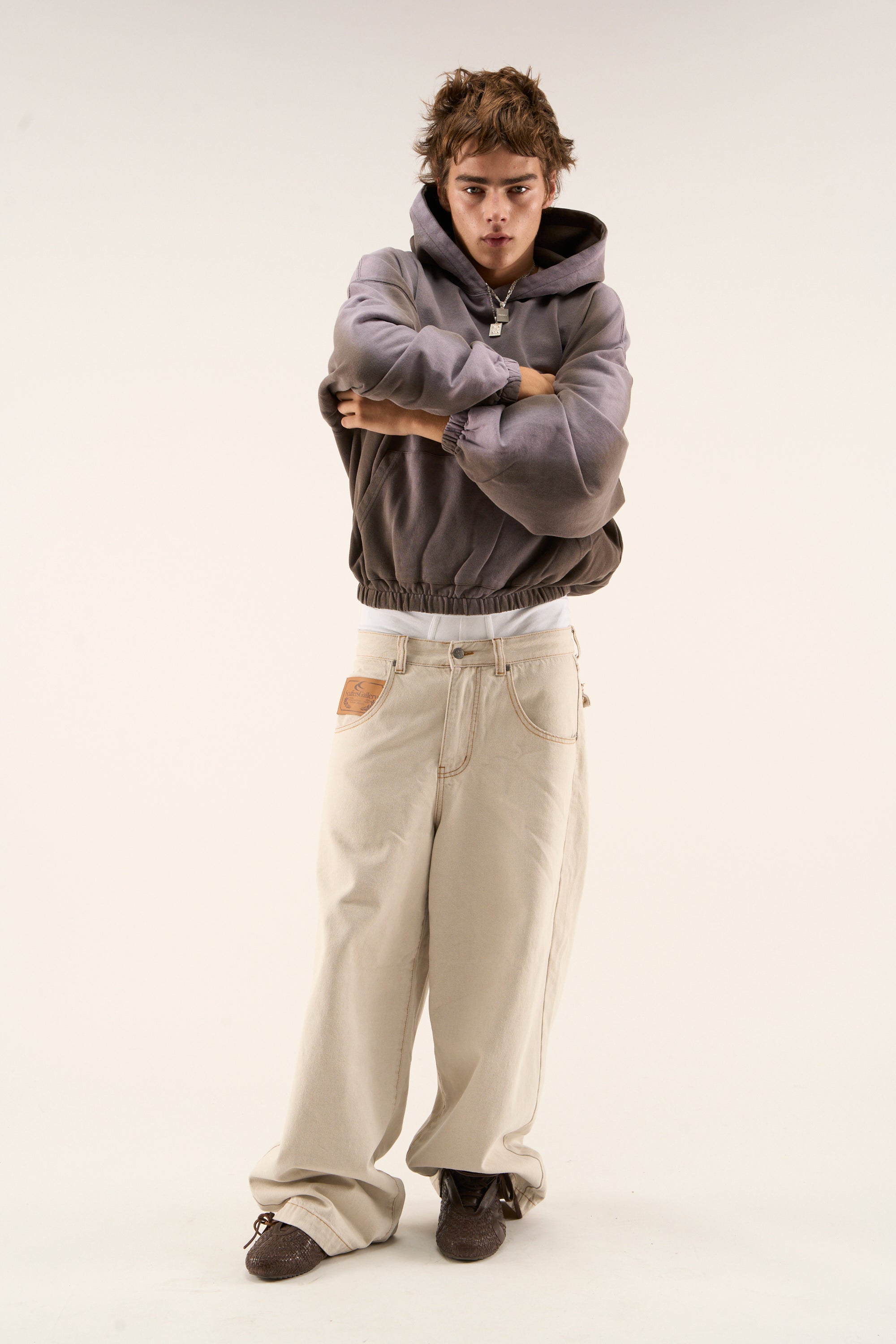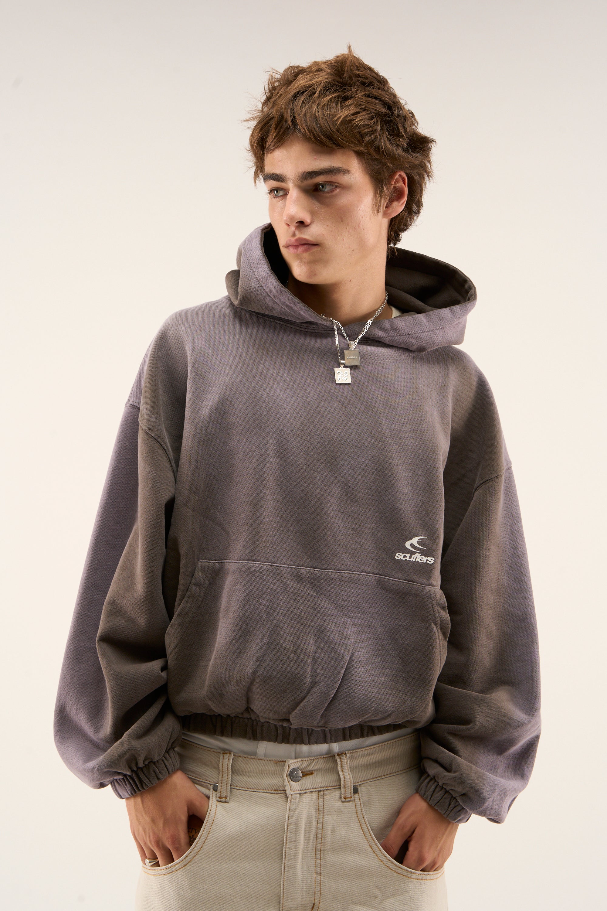 Washed Light Brown Hoodie made from midweight cotton fleece with a relaxed, cropped fit. Features elasticated cuffs and hem, front kangaroo pocket, and tonal faded finish throughout. Finished with a small Scuffers logo print on the chest.