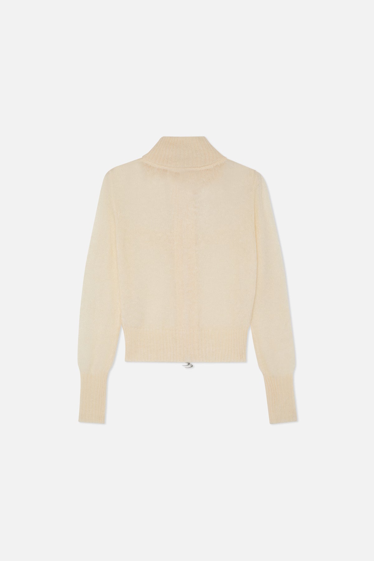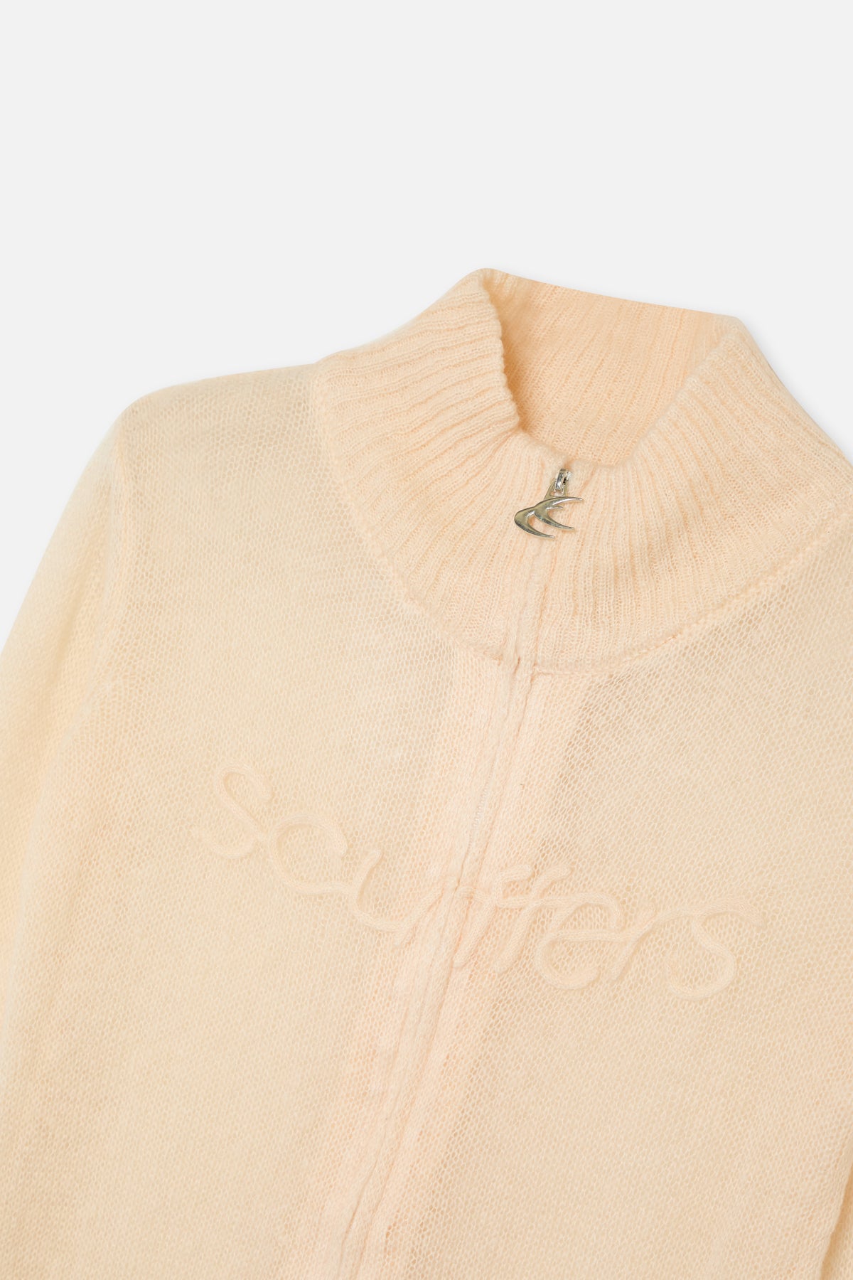 Ecru Zip Cardigan in soft brushed knit with a fitted silhouette. Features a ribbed high collar, two-way front zip with metal Scuffers pull tabs, and tonal embroidered logo across the chest. Finished with wide ribbed cuffs and hem.