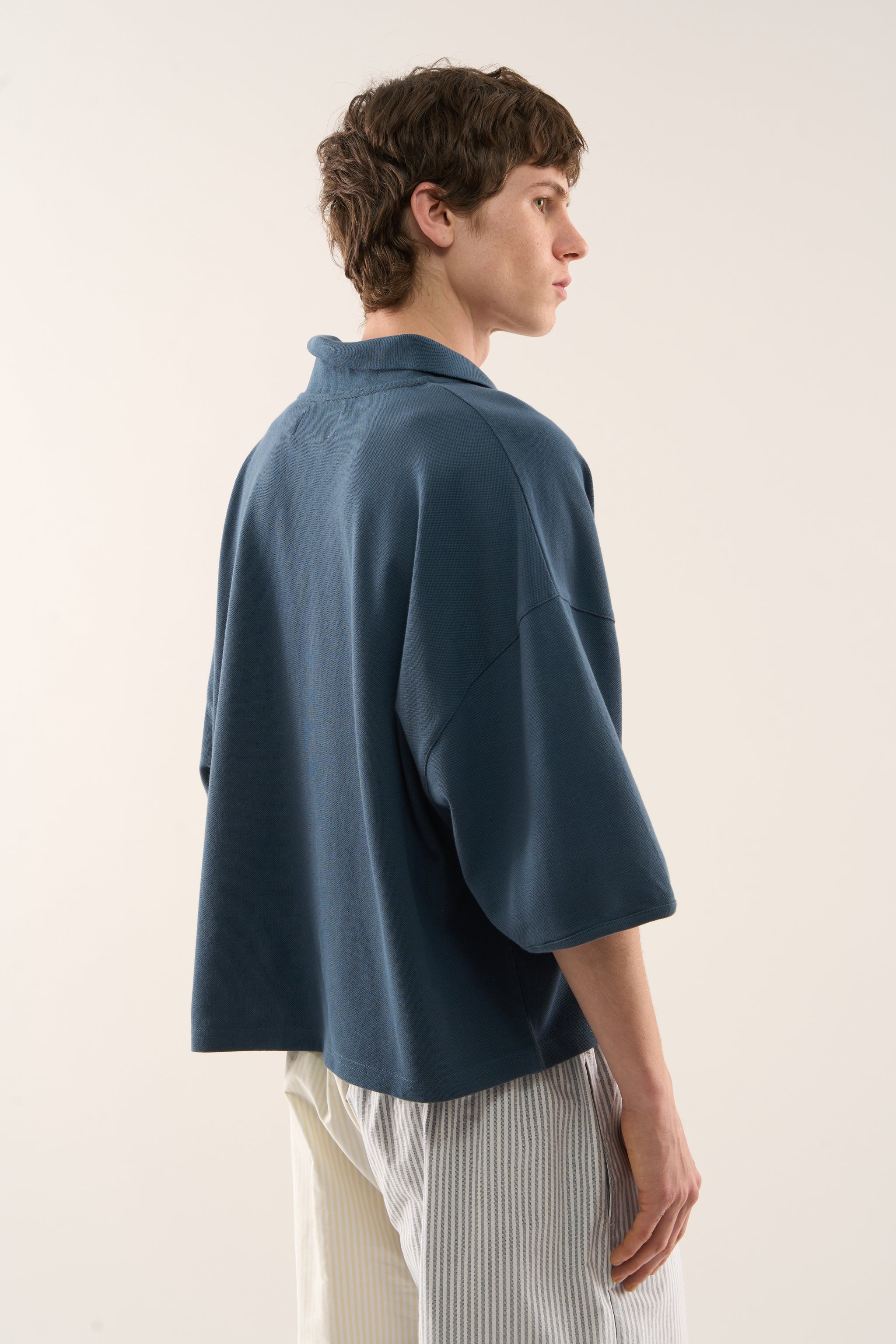Navy short-sleeve polo made from structured cotton piqué. Features a relaxed fit with dropped shoulders and a split V-neck opening. Includes contrast gingham trim at the placket and printed Scuffers branding on the inner collar. Embroidered logo detail on the left chest. Plain back.