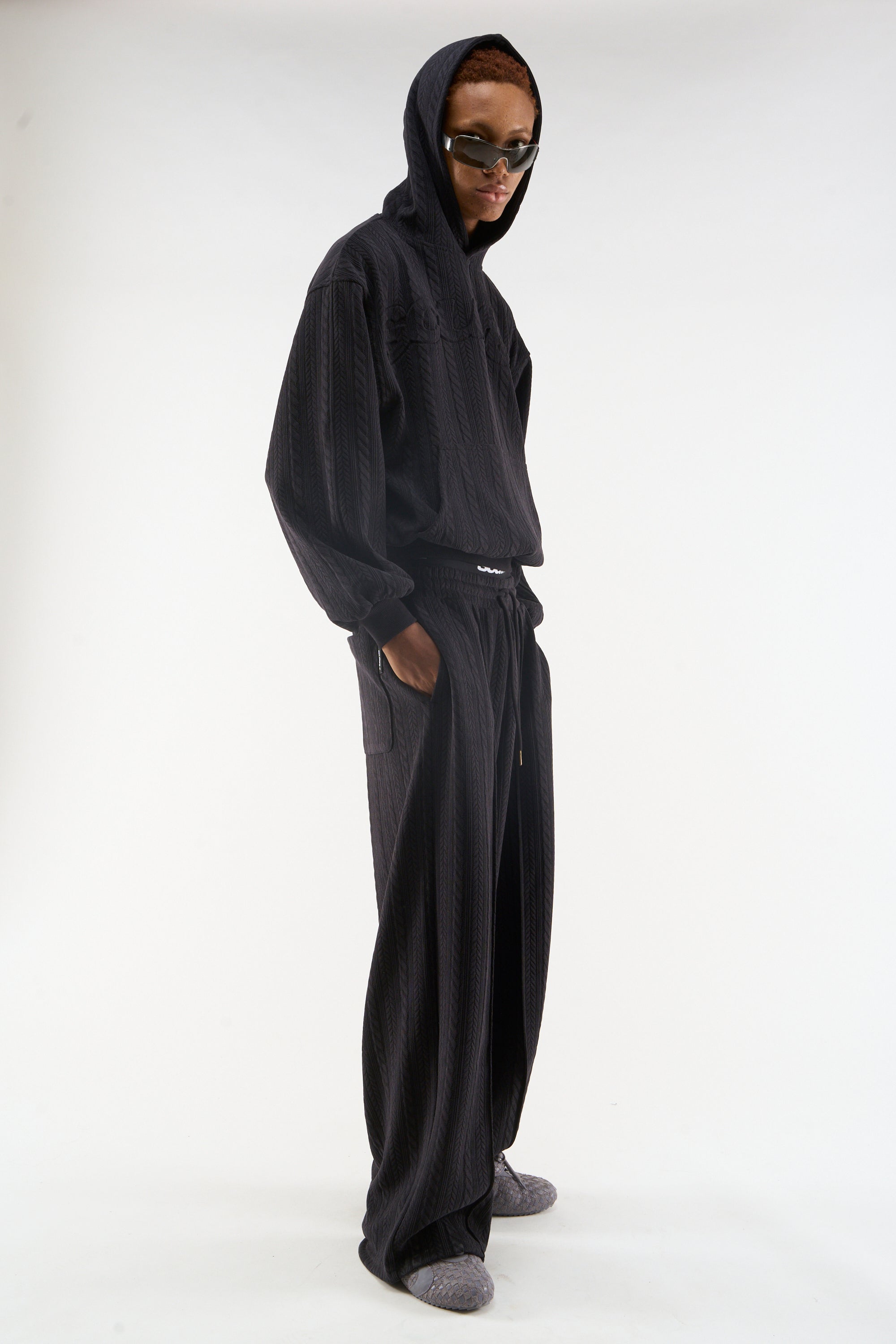 Dark Cable Knit Hoodie made from soft textured knit fabric with an all-over cable pattern. Features a relaxed fit, attached hood, and ribbed cuffs and hem. Subtle tonal Scuffers logo embossed on the chest. Finished with a front kangaroo pocket.
