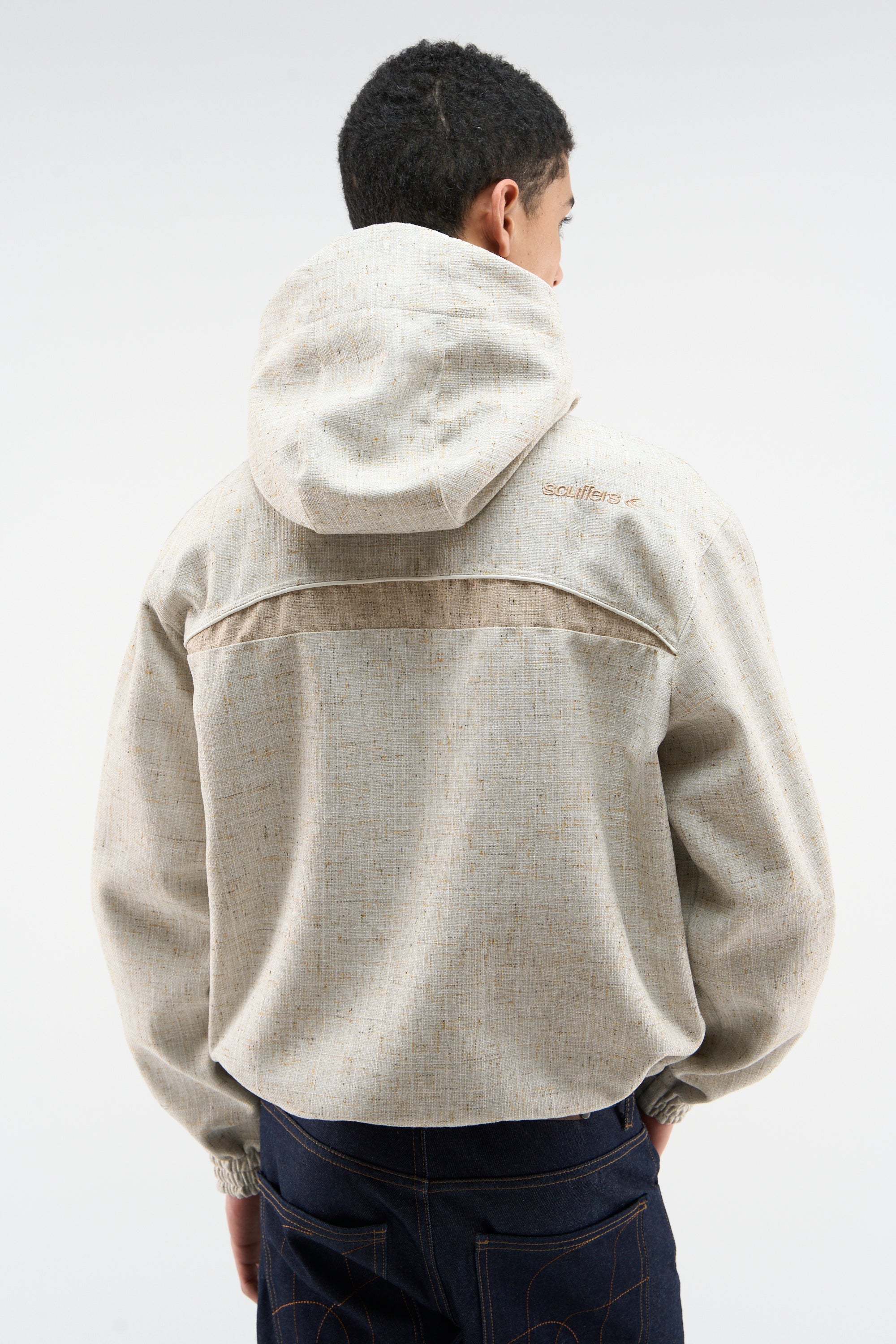 Beige Hooded Windbreaker made from textured woven fabric with tonal speckled finish. Features front flap pockets, elasticated cuffs, and adjustable hem with drawcord. Includes curved panel detailing, concealed zip closure, and embroidered Scuffers logo on front and back. Relaxed fit with dropped shoulders.