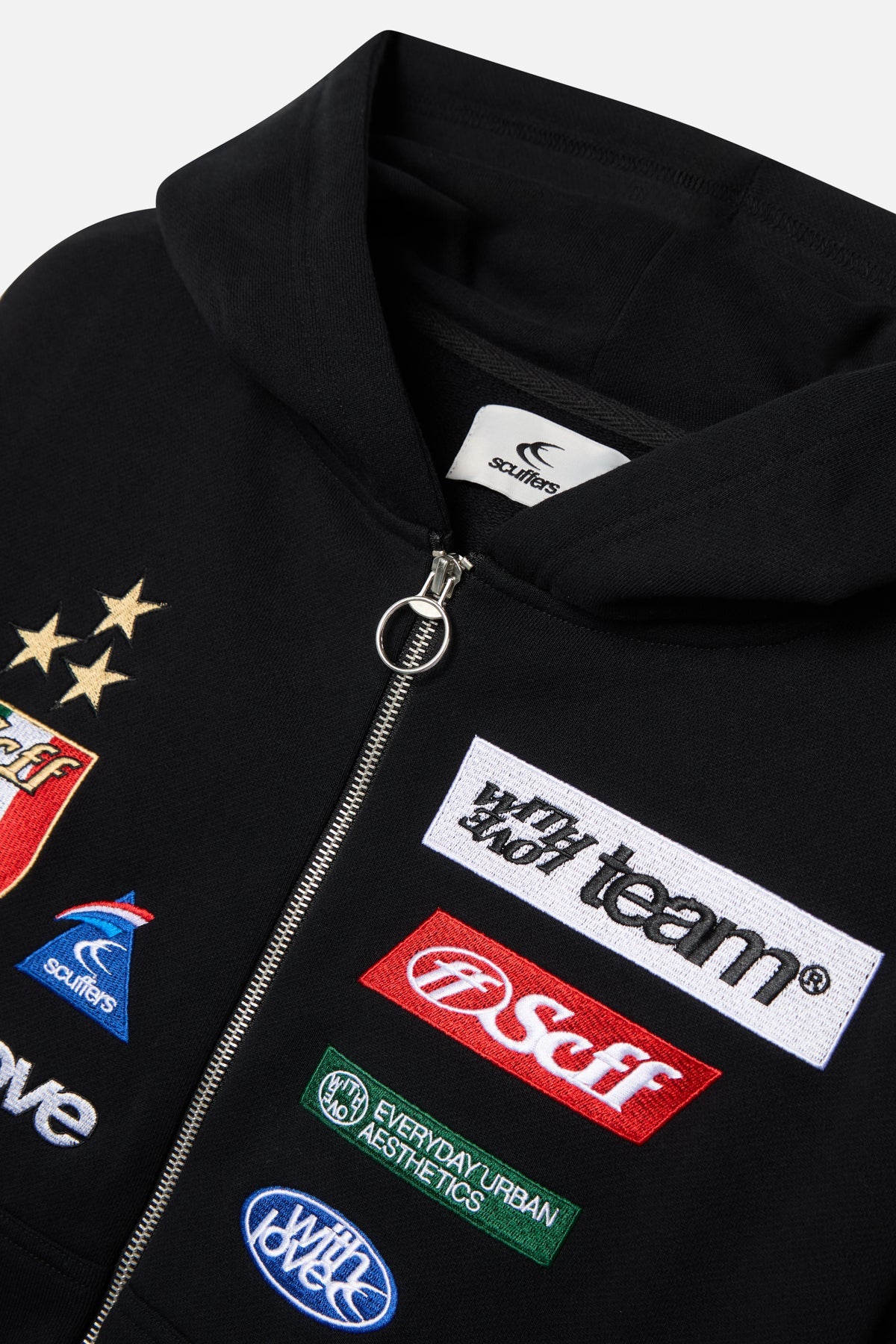 Black Zip-Up Hoodie with embroidered patch graphics on the front, including bold logos and designs in vibrant colors. Made from a soft cotton blend with a brushed interior for added comfort. Features a full-length metal zipper with a circular pull, ribbed cuffs and hem, and an adjustable drawstring hood. Back showcases a minimalist embroidered Scuffers logo. Relaxed fit for versatile styling.